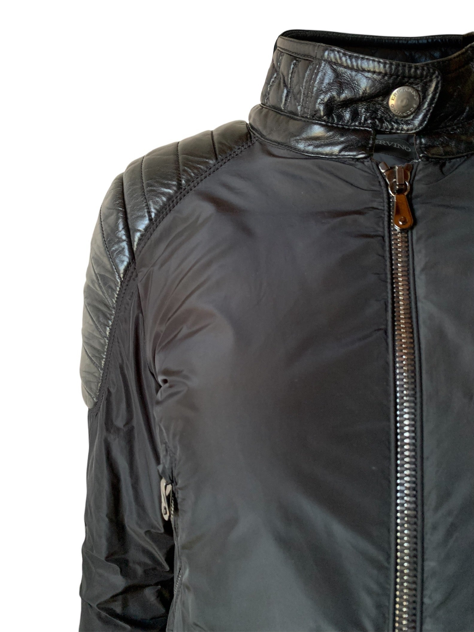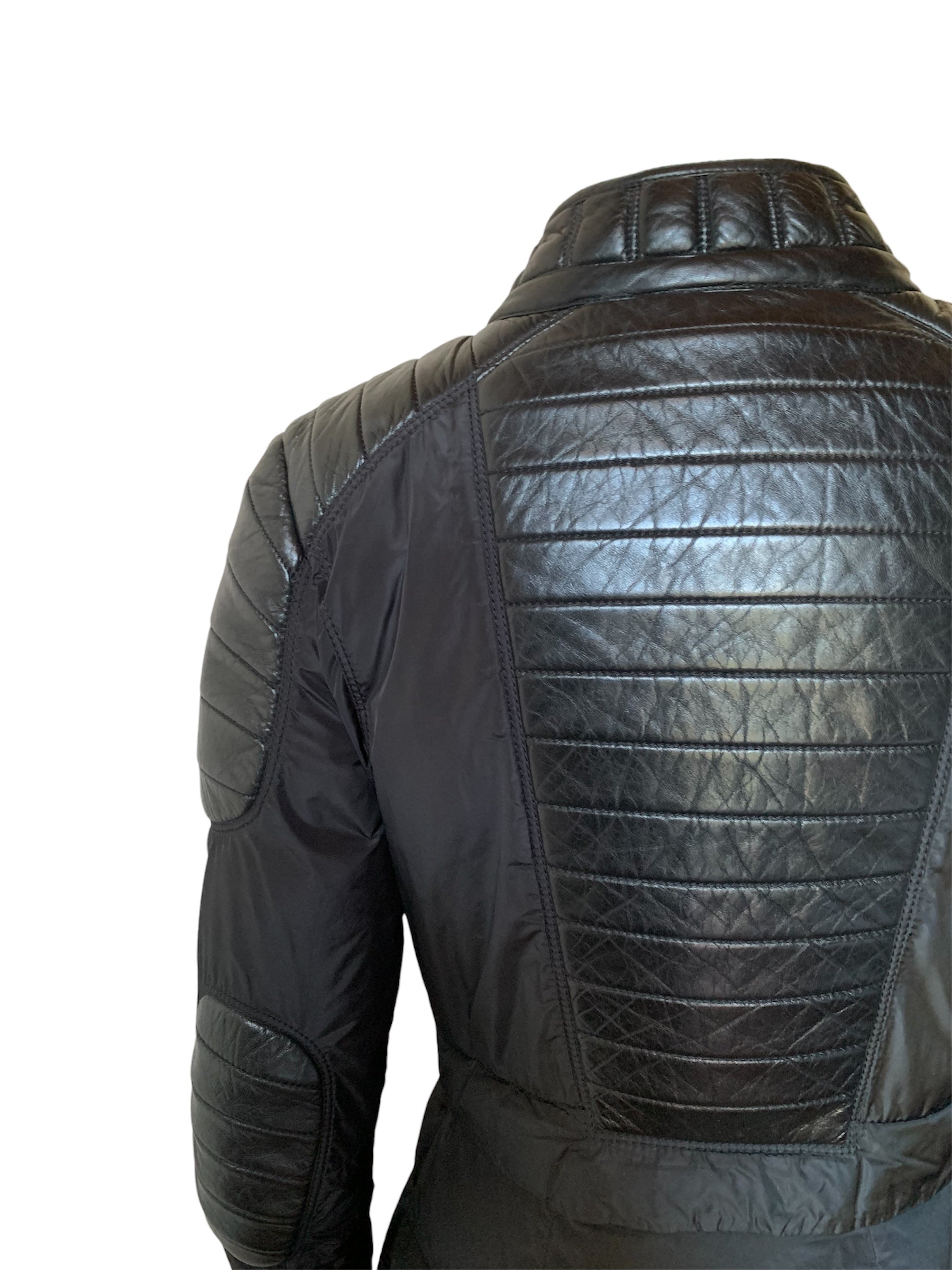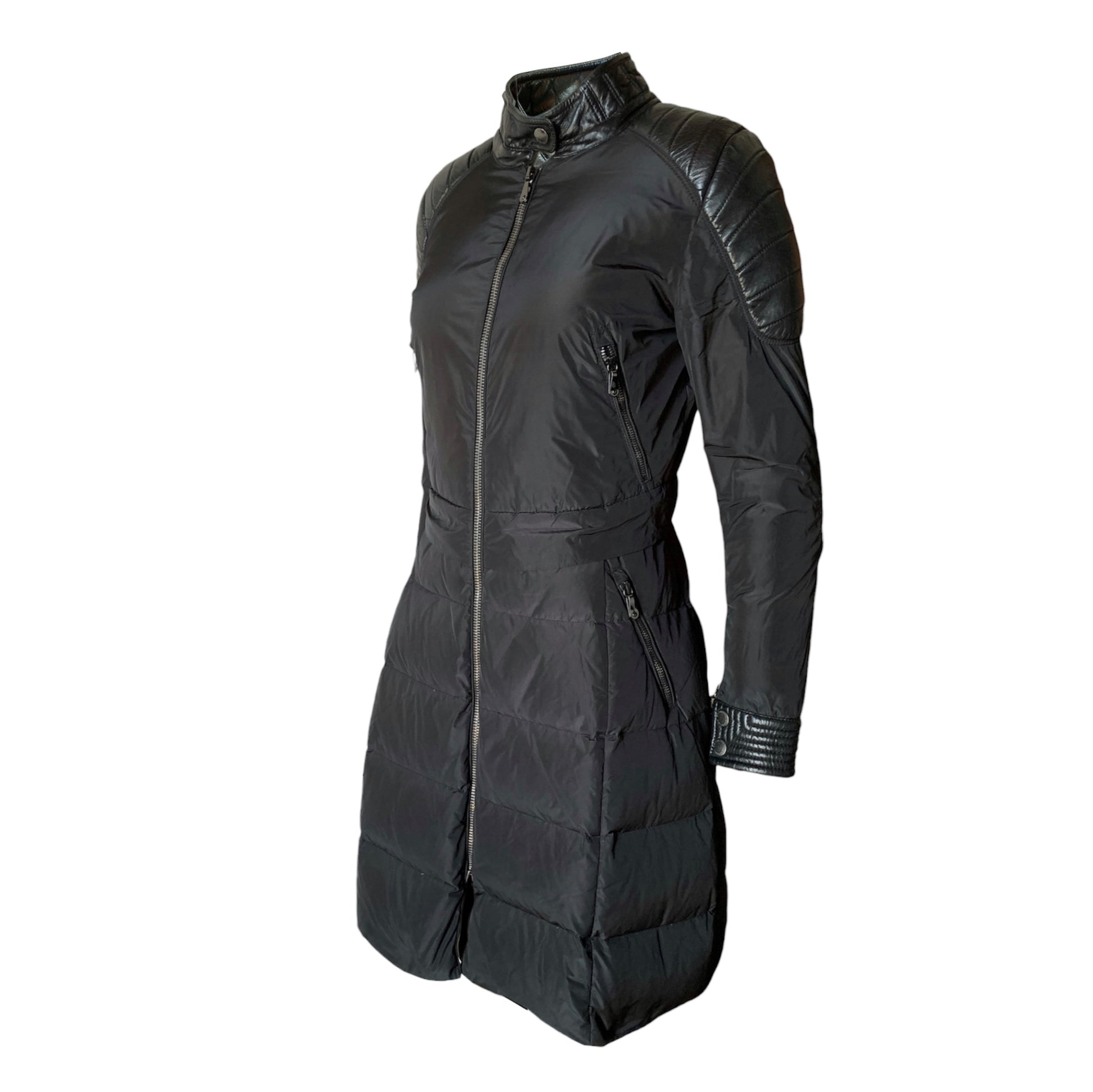 Piumino lungo a lavorazione trapuntata con chiusura a zip doppio cursore frontale, multitasche con zip, taglio sciancrato in vita, collo alto chiuso da bottone a clip. Inserti in pelle.