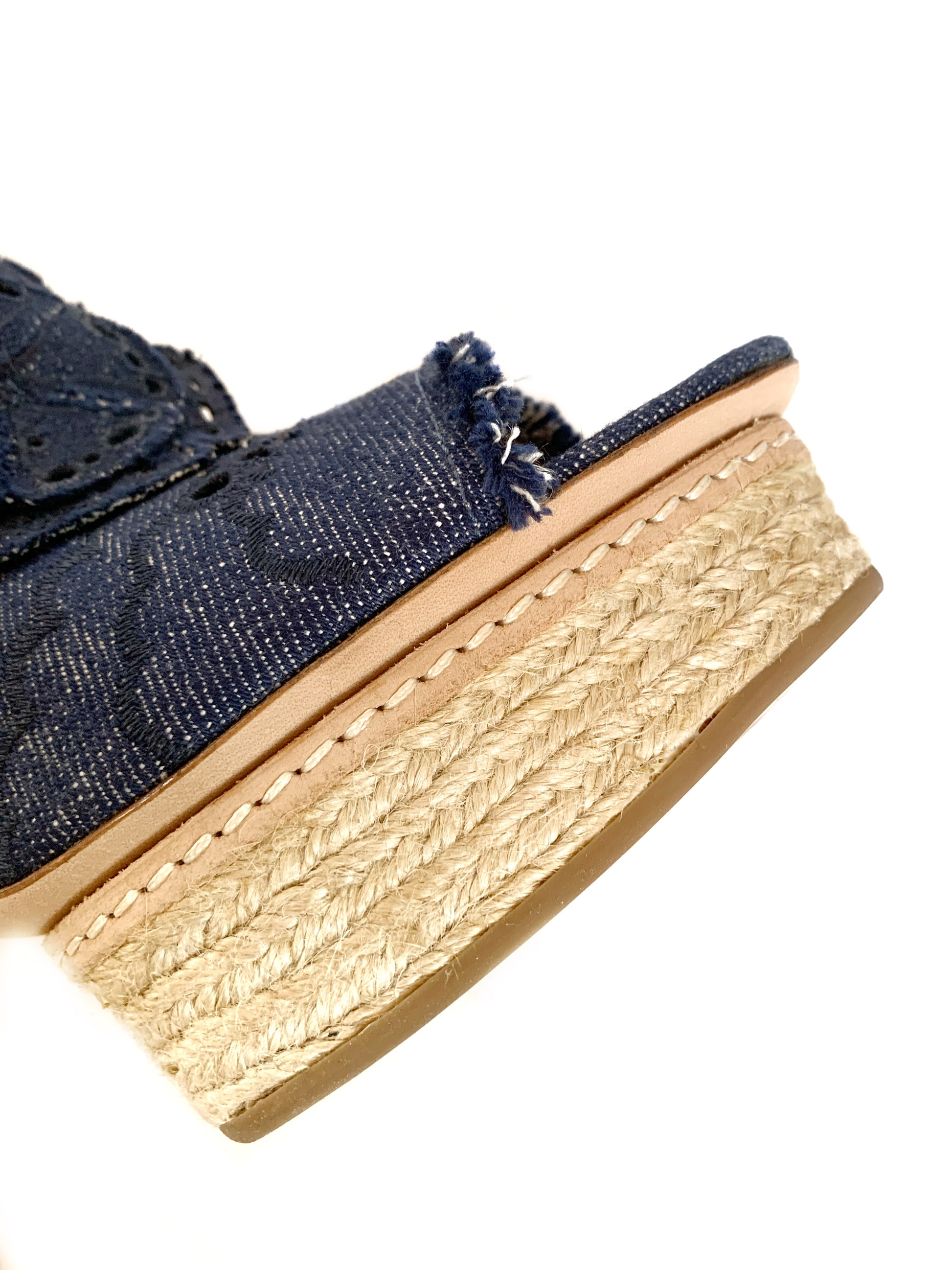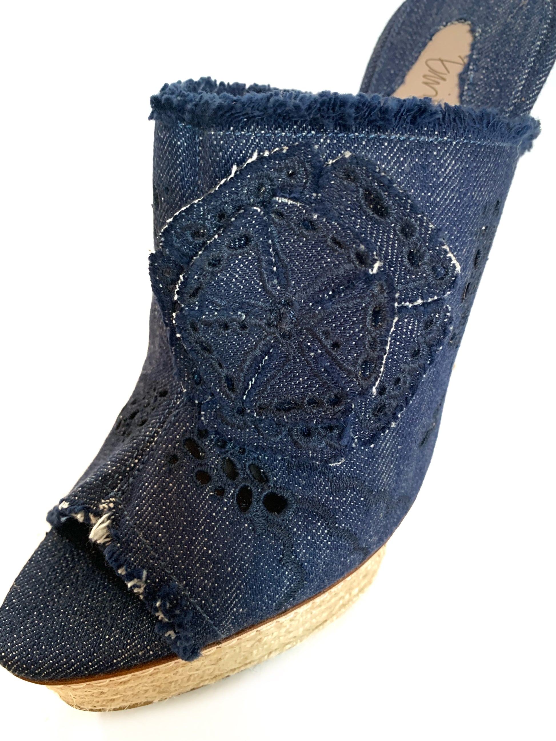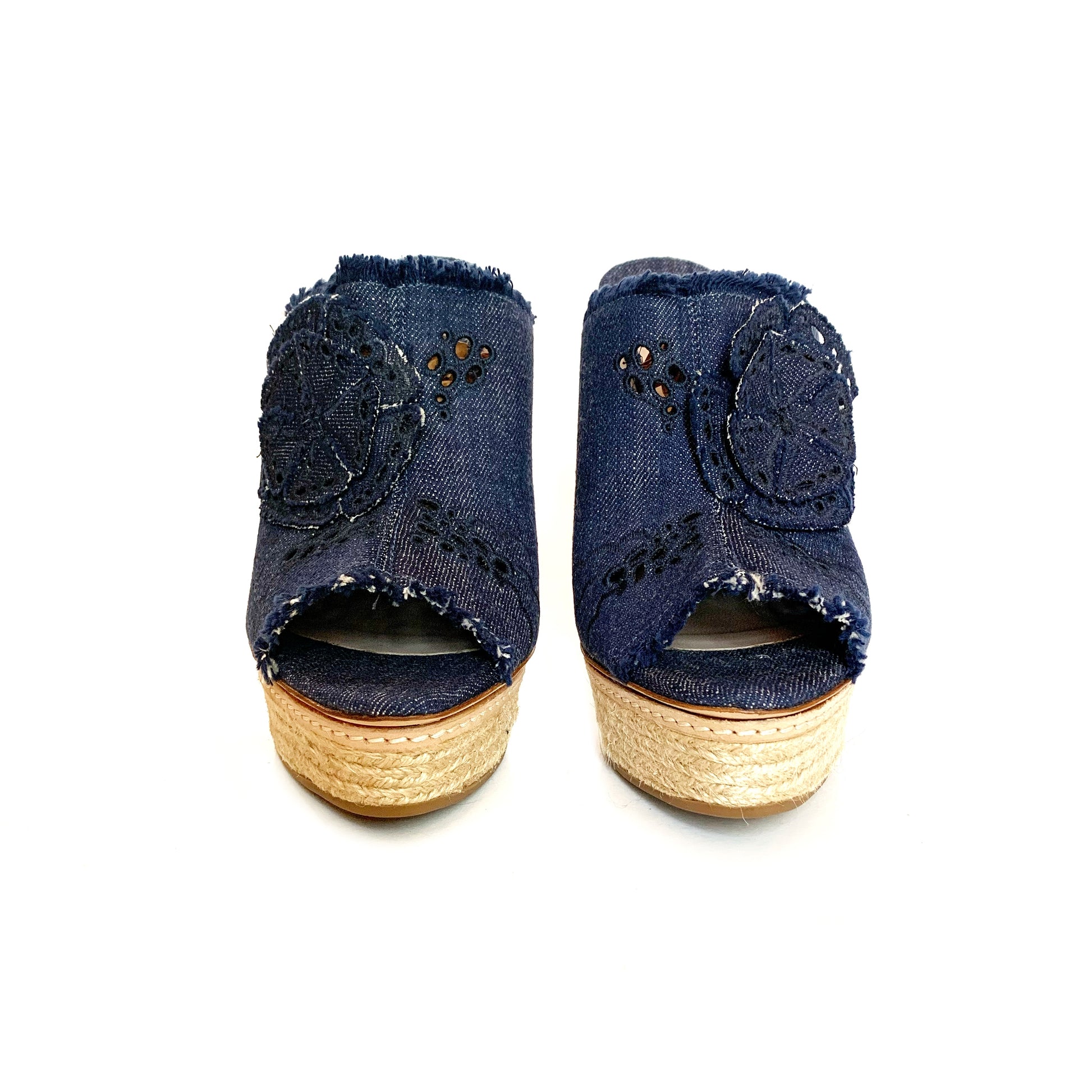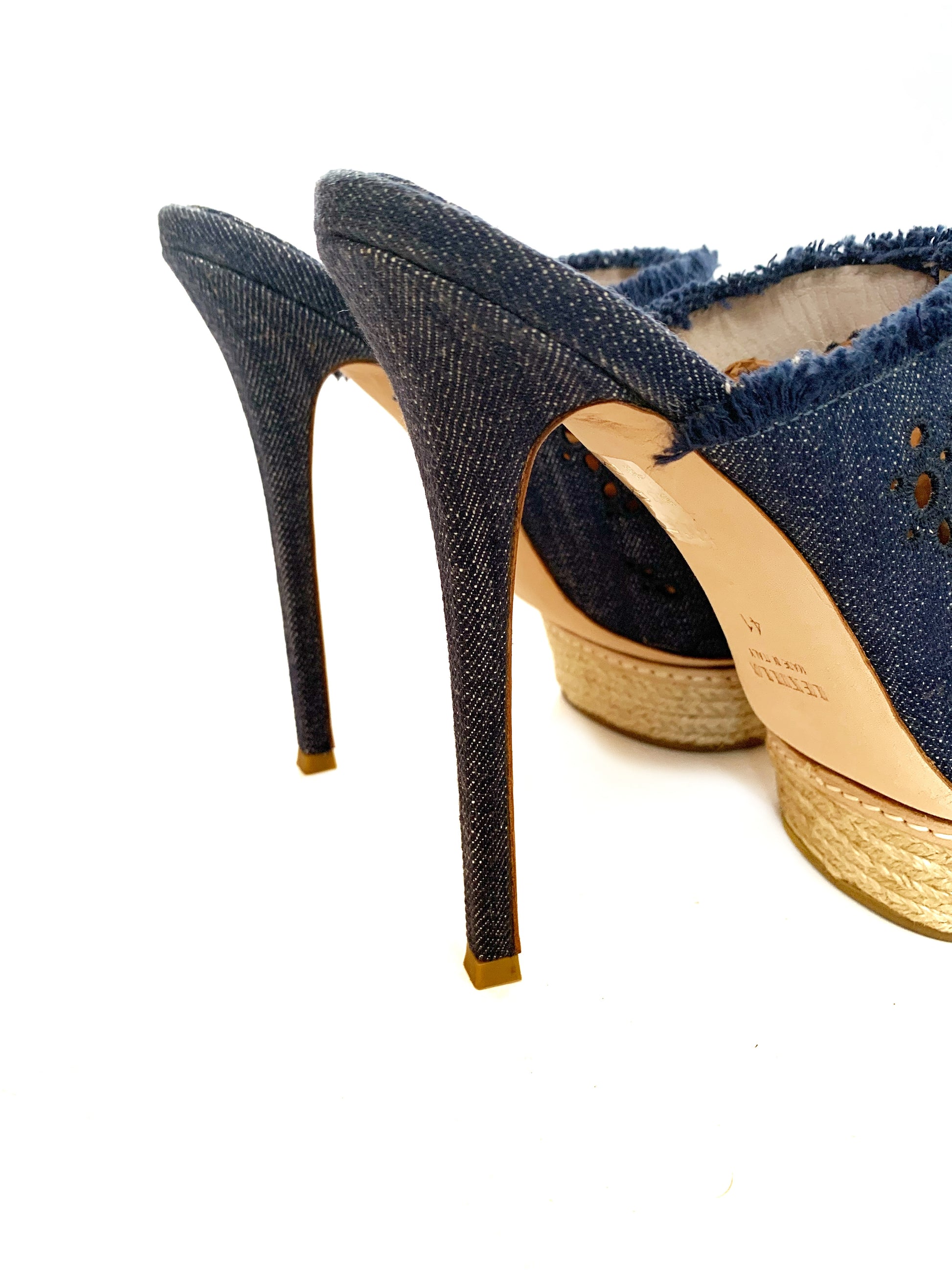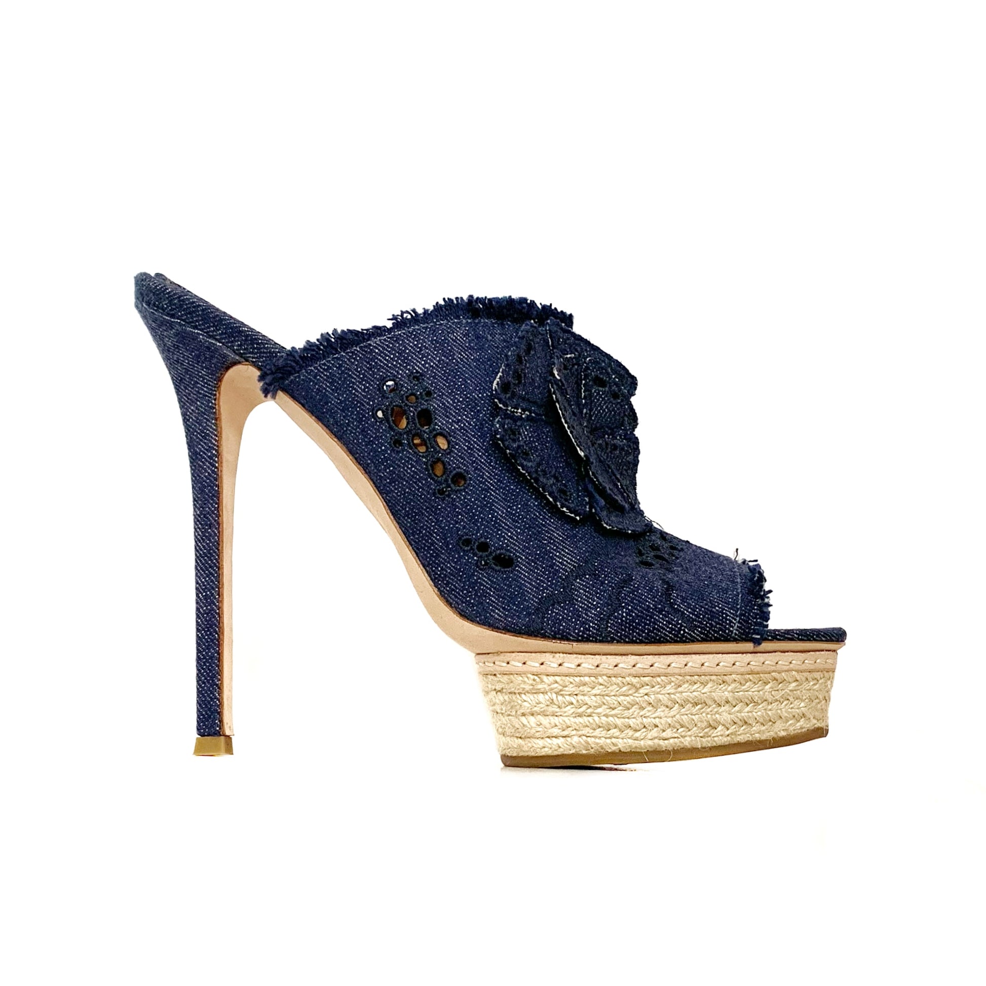 Sandali in tela denim con applicazioni di fiori e plateau in in rafia, punta aperta. Tacco a spillo rivestito 15 cm, plateau 3 cm.