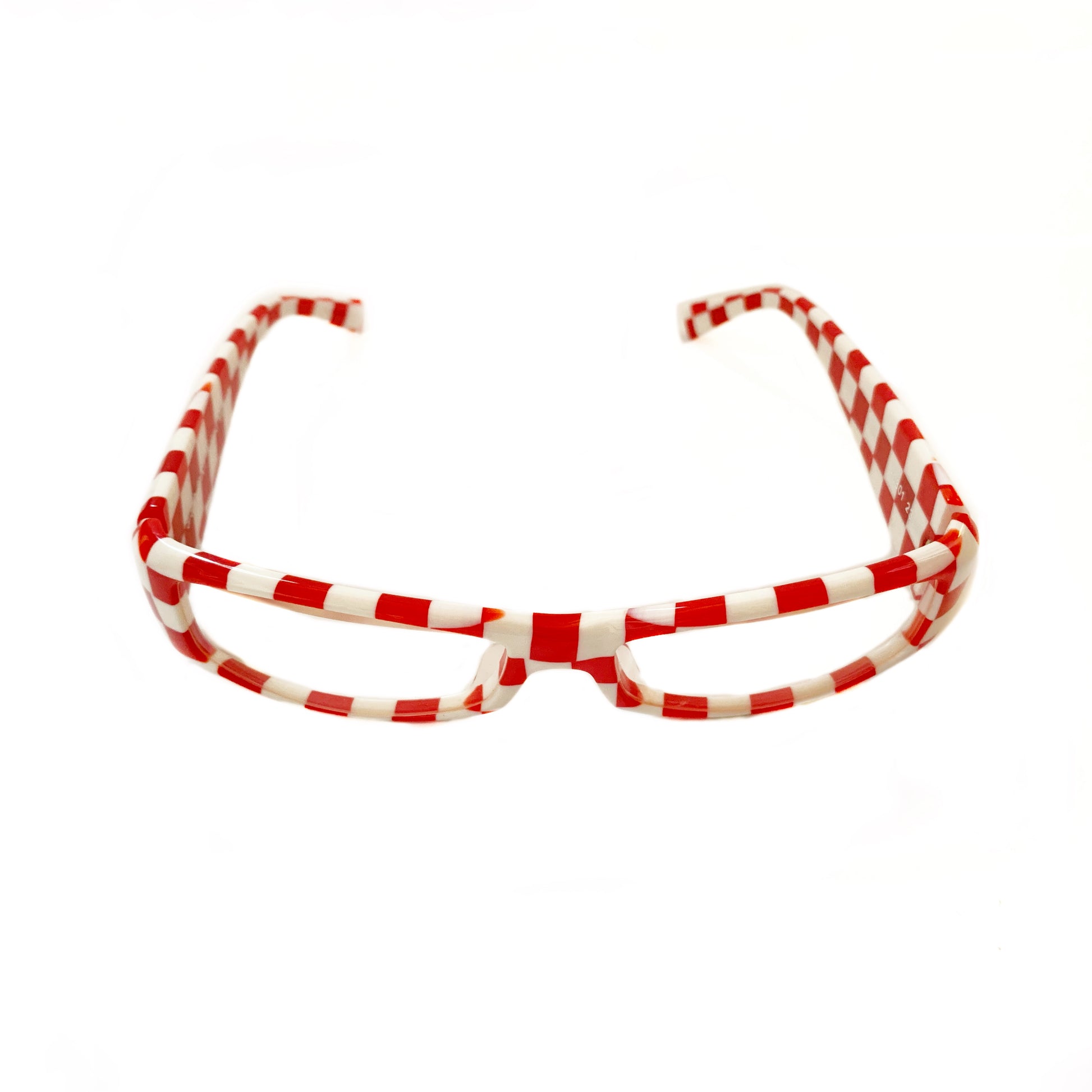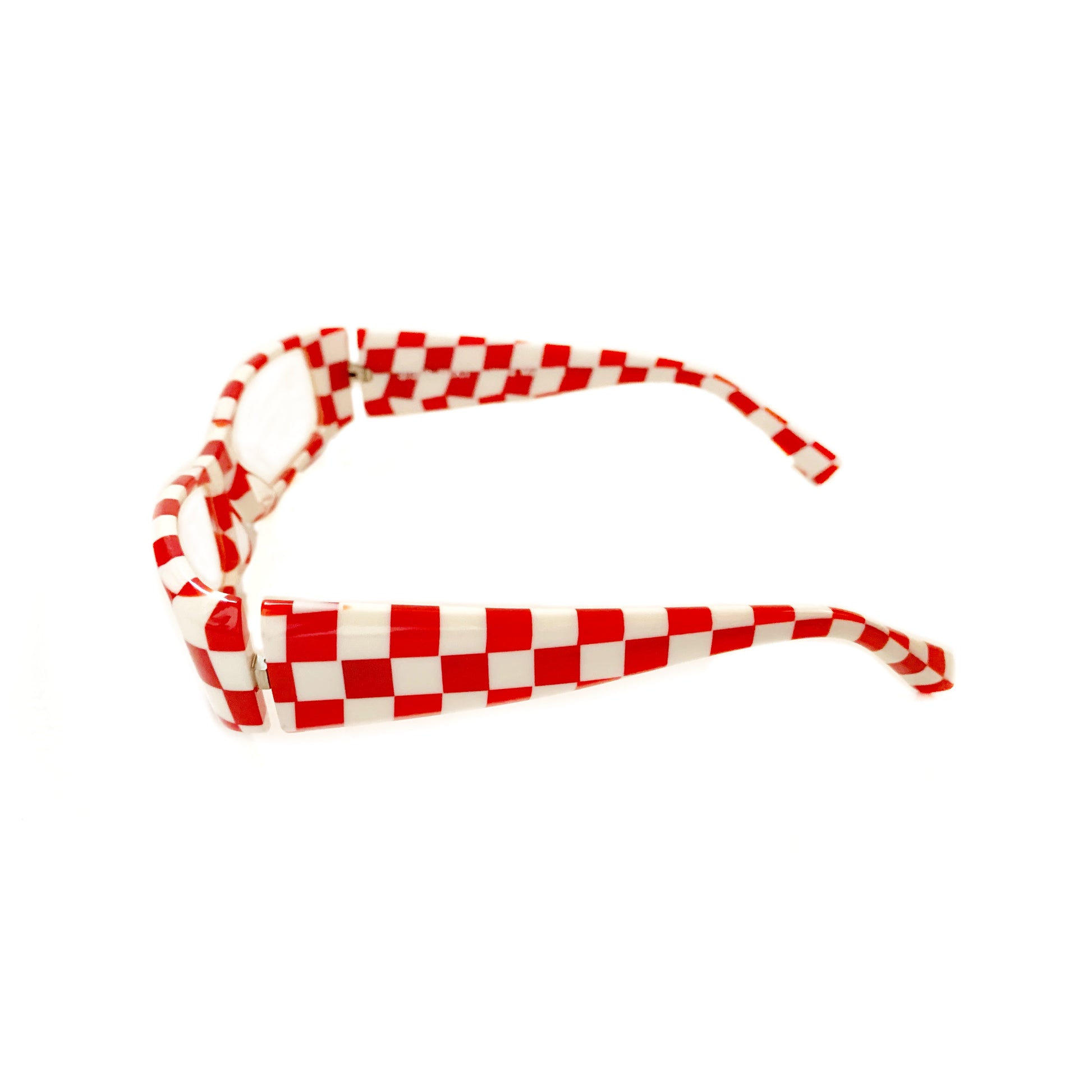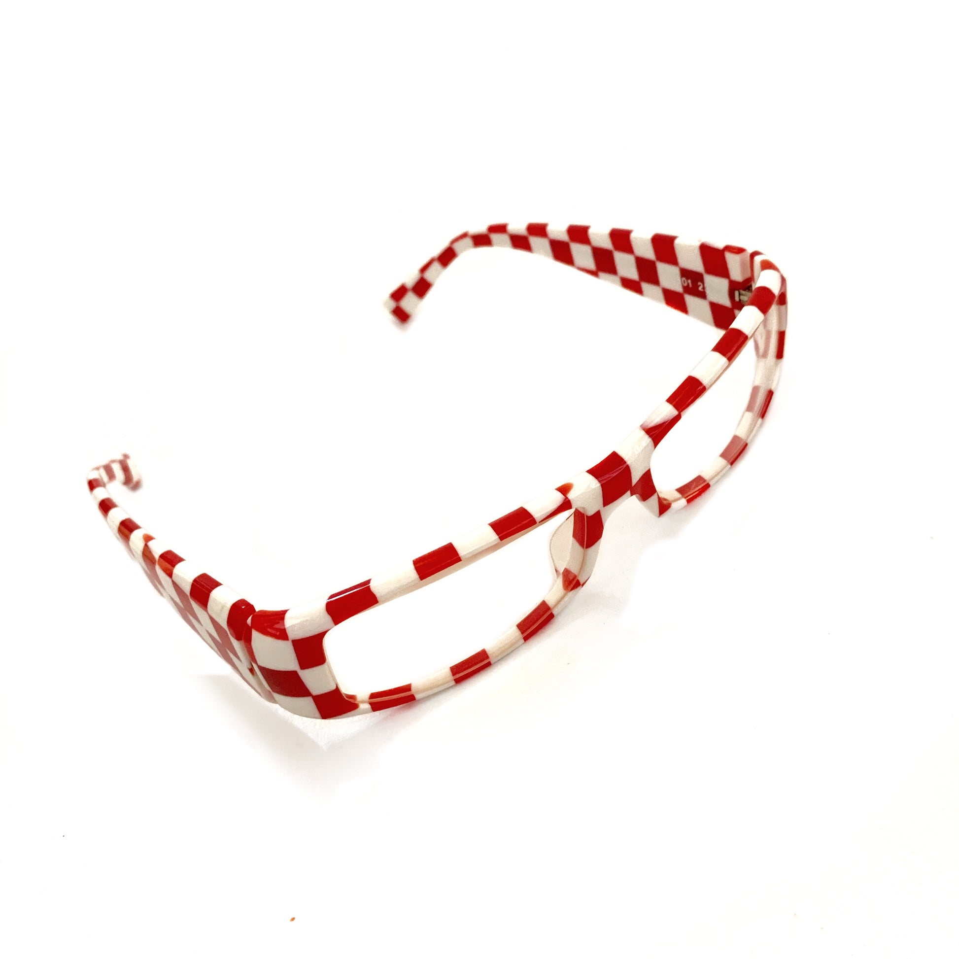 Occhiali vintage da vista in acetato a quadri rosso e bianco.