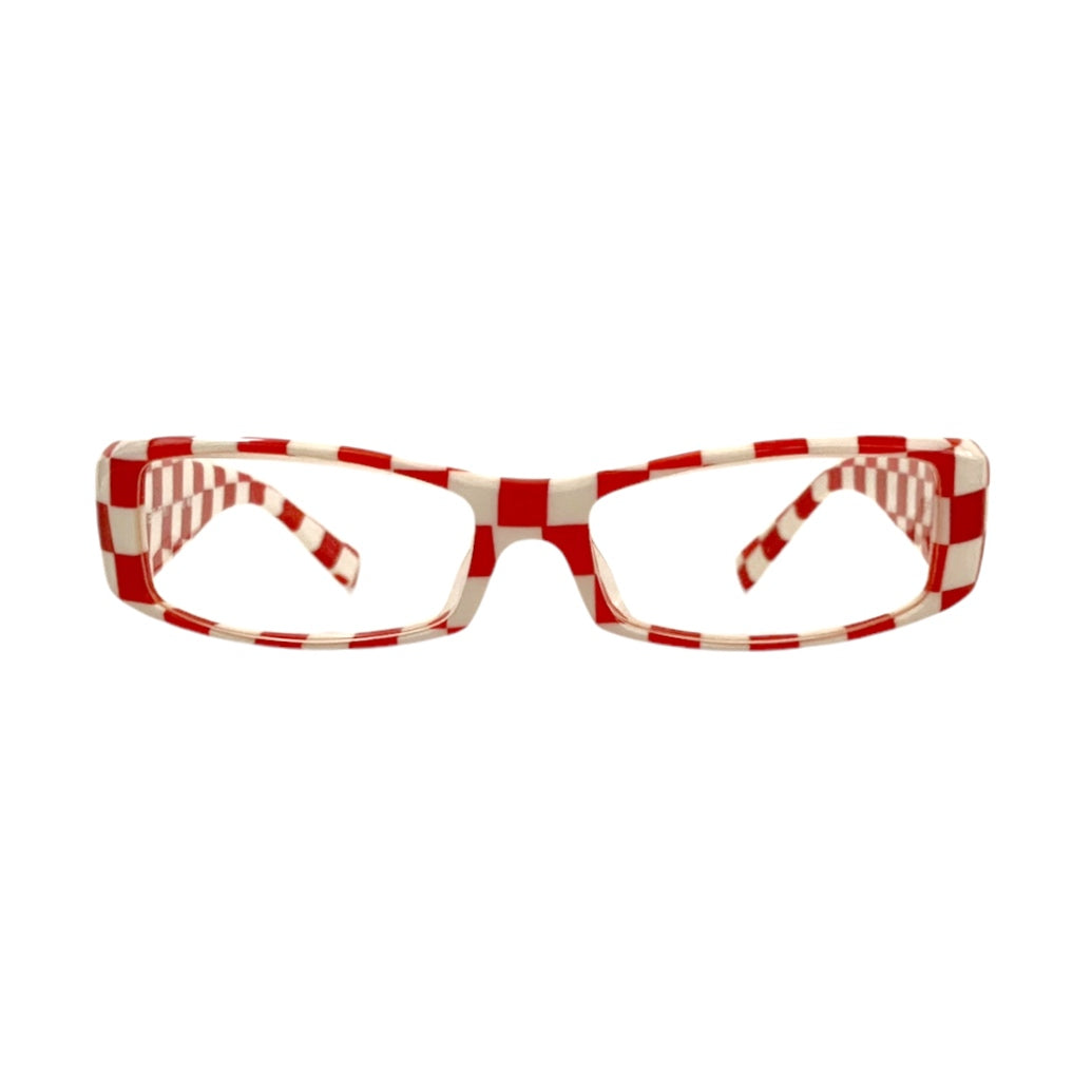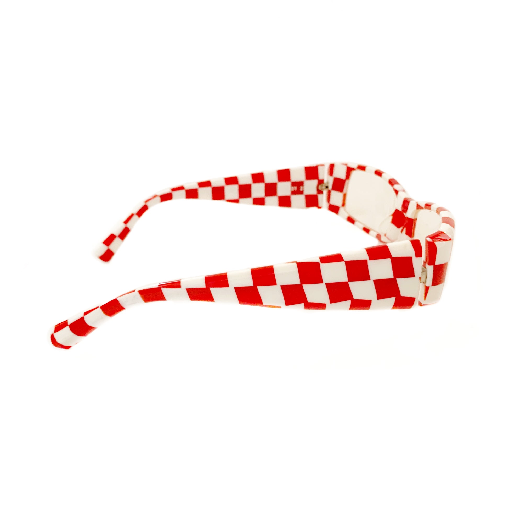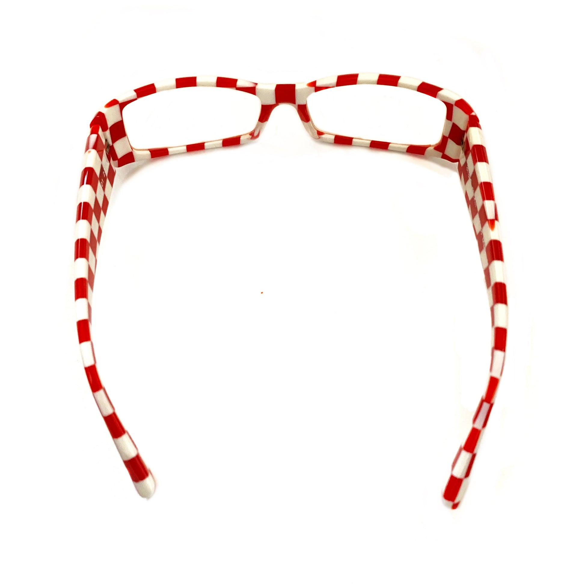 Occhiali vintage da vista in acetato a quadri rosso e bianco.
