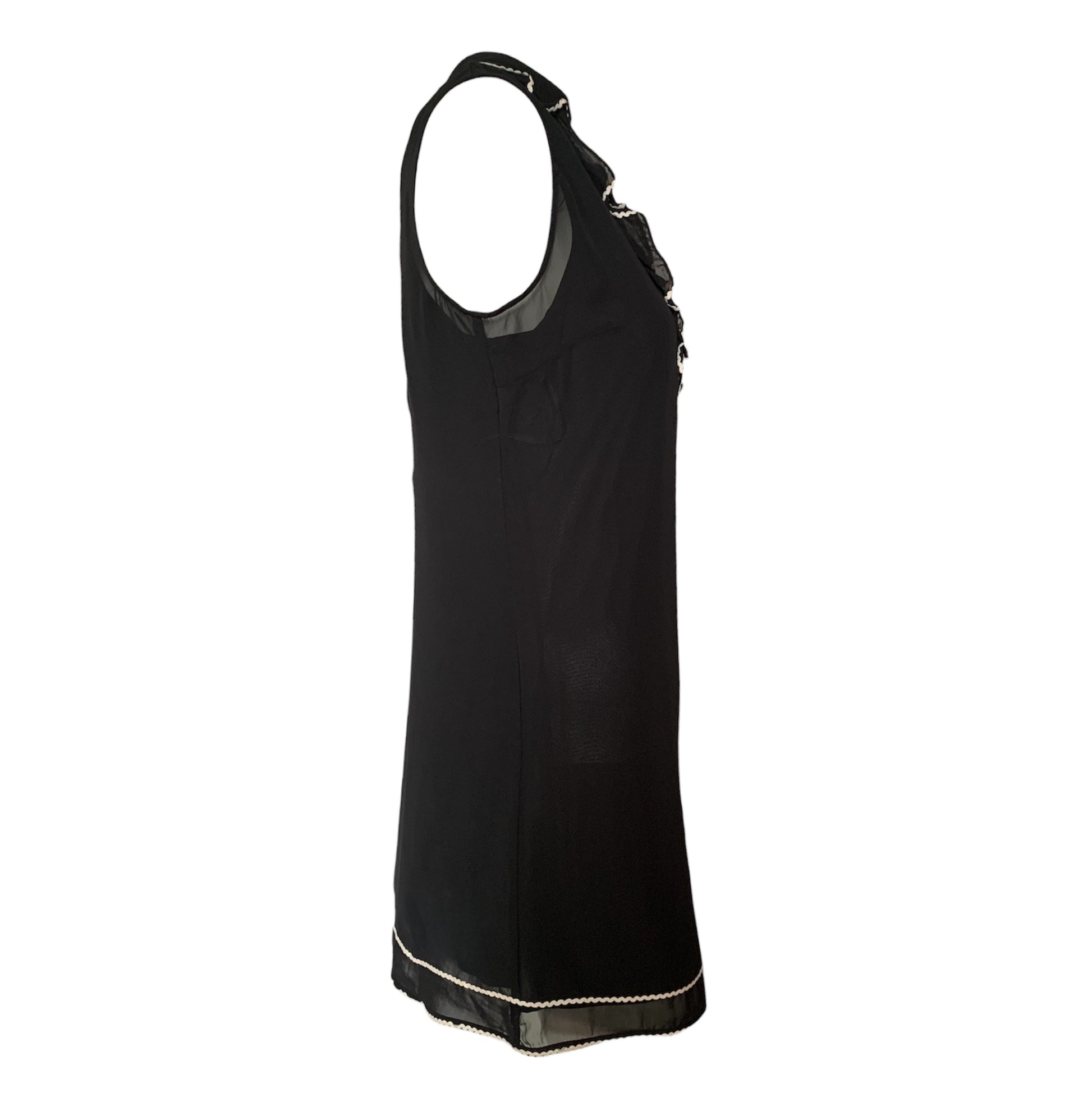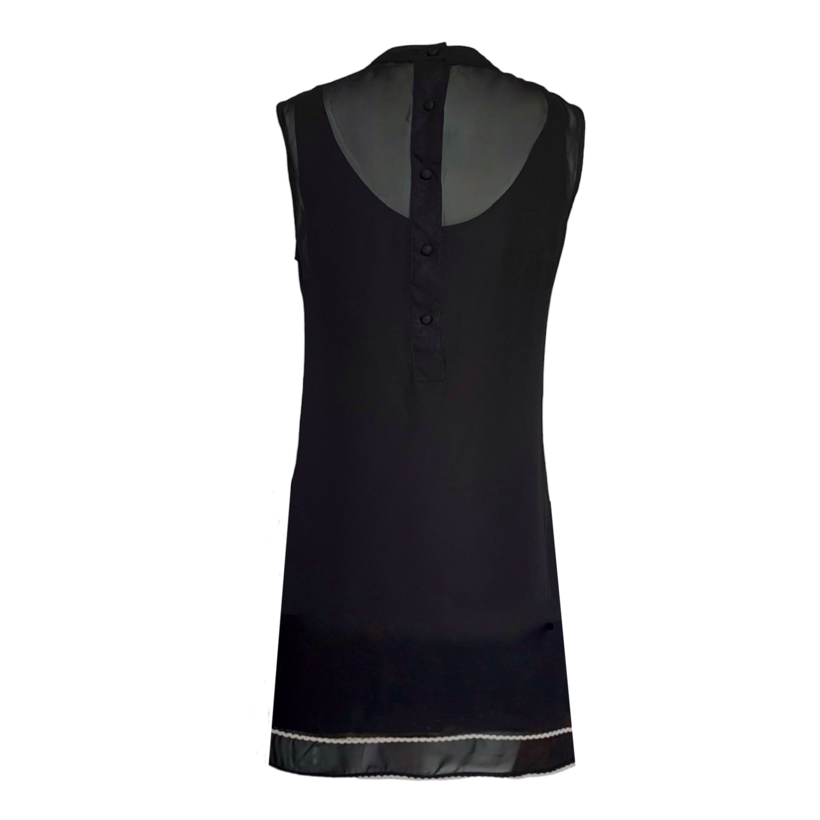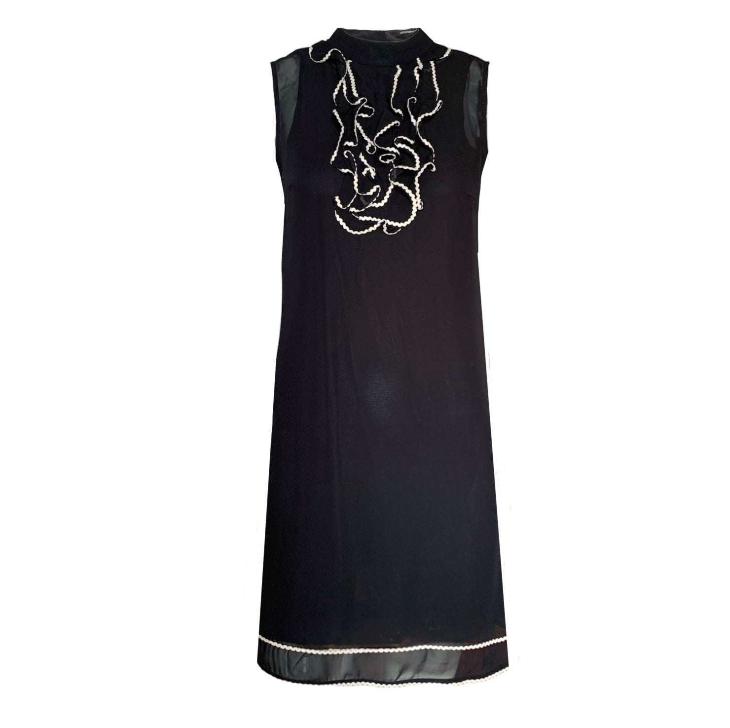 Abito mini con taglio dritto a due strati: il tessuto esterno semitrasparente con sottoveste smanicata in tinta. Ruches decorativi sul fronte profilate in bianco a contrasto, colletto girocollo e chiusura sul retro con bottoni rivestiti in tessuto.