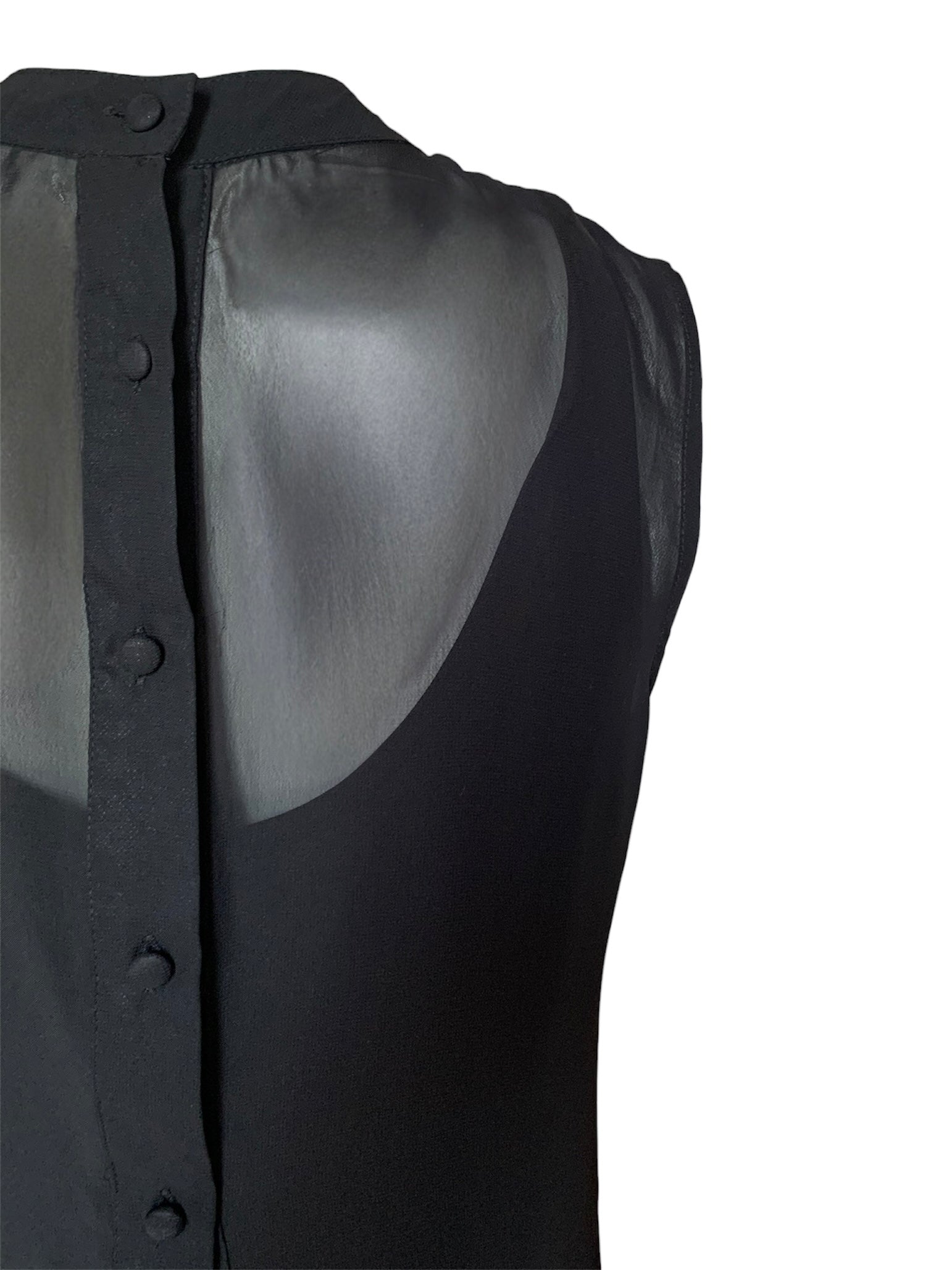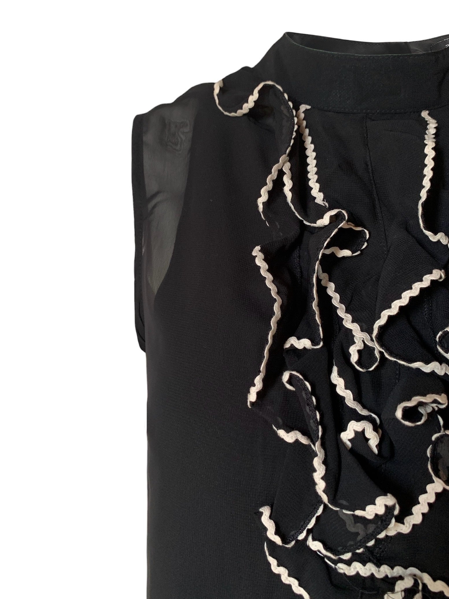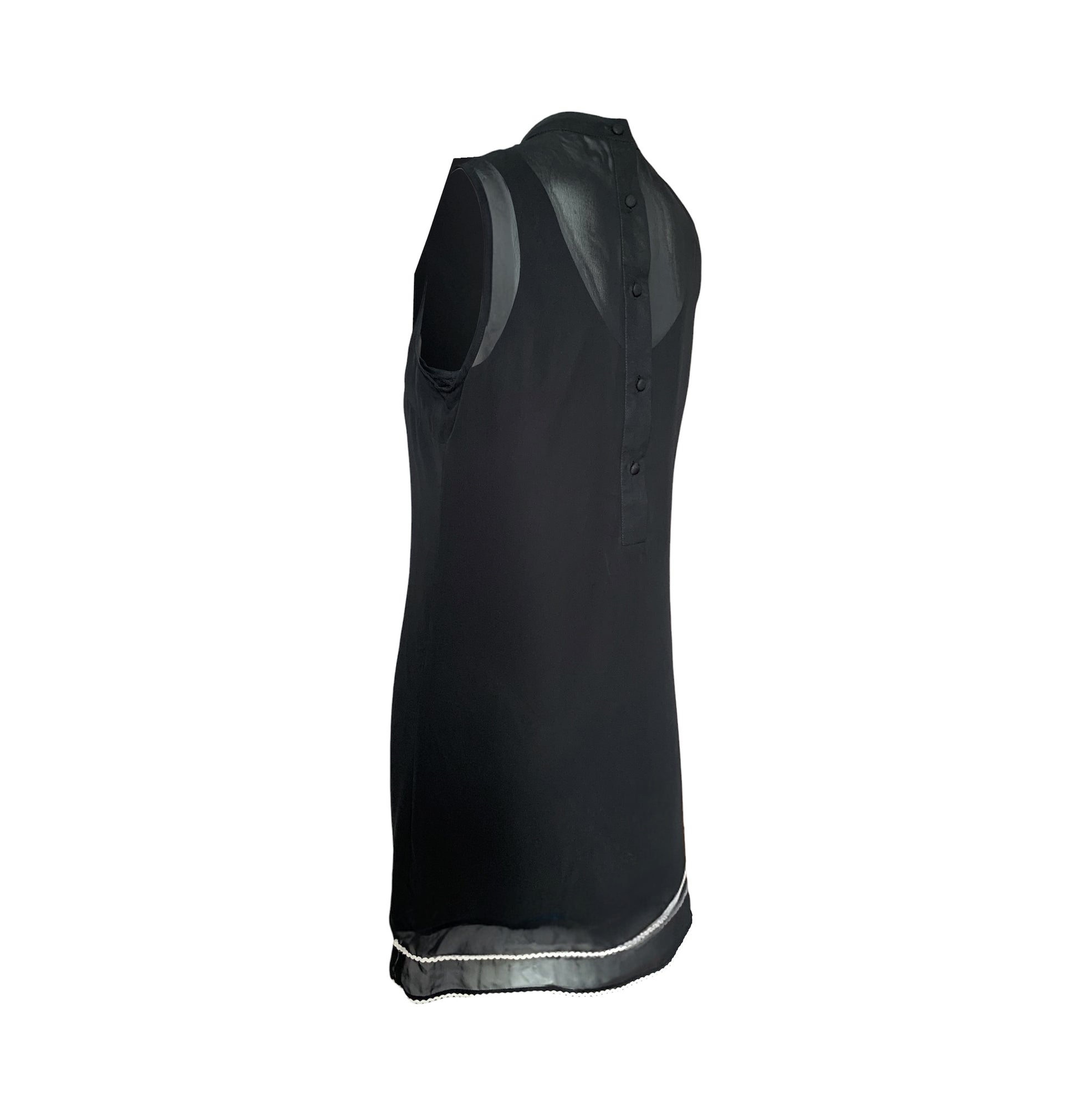 Abito mini con taglio dritto a due strati: il tessuto esterno semitrasparente con sottoveste smanicata in tinta. Ruches decorativi sul fronte profilate in bianco a contrasto, colletto girocollo e chiusura sul retro con bottoni rivestiti in tessuto.
