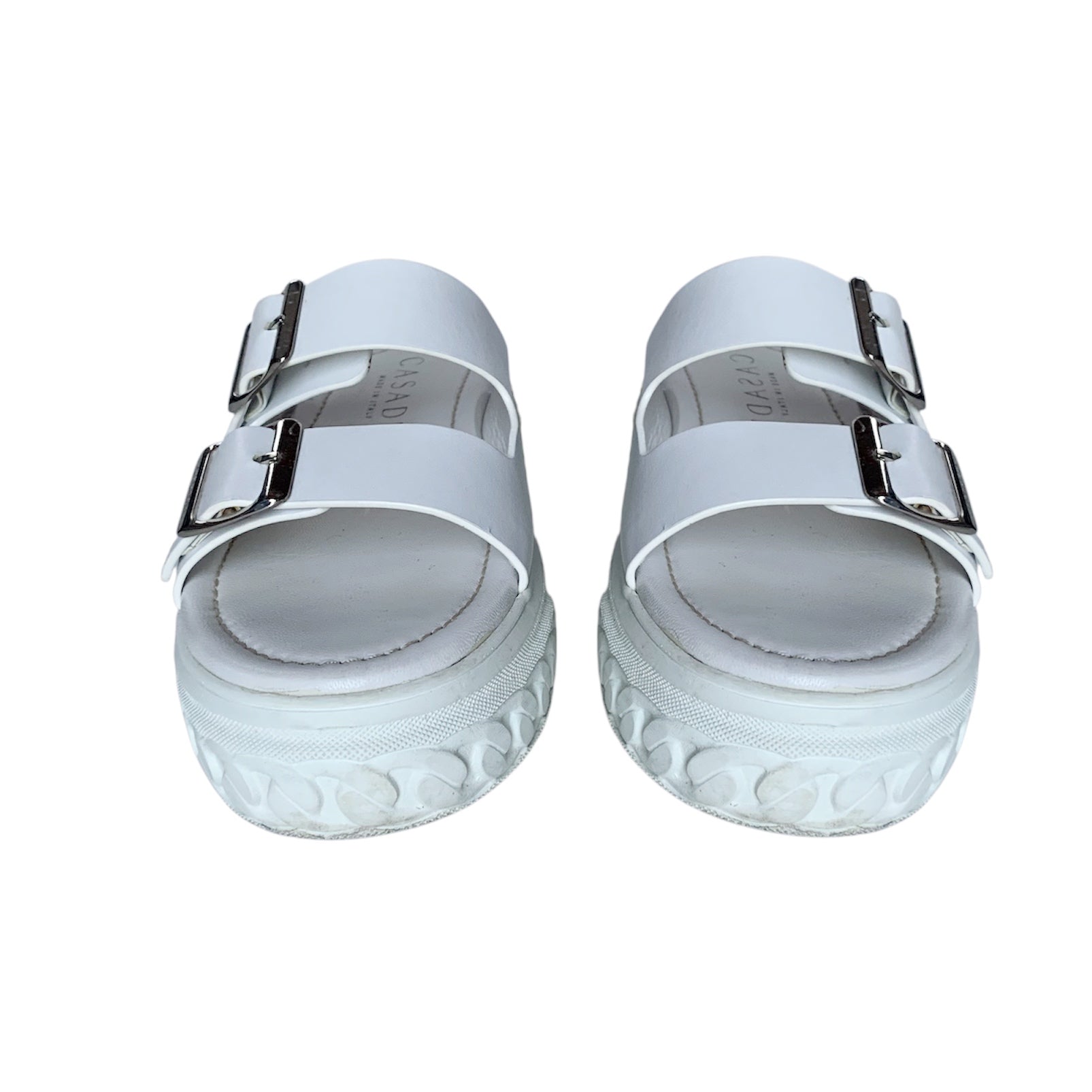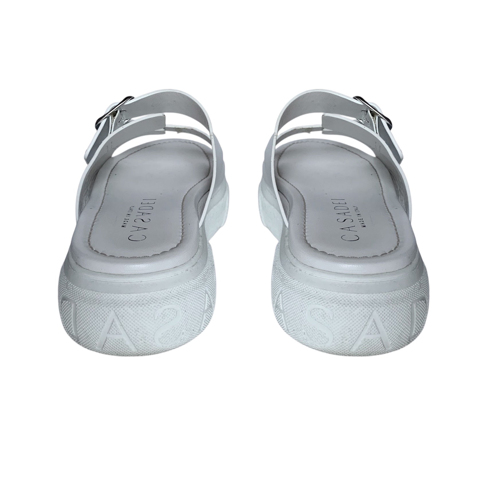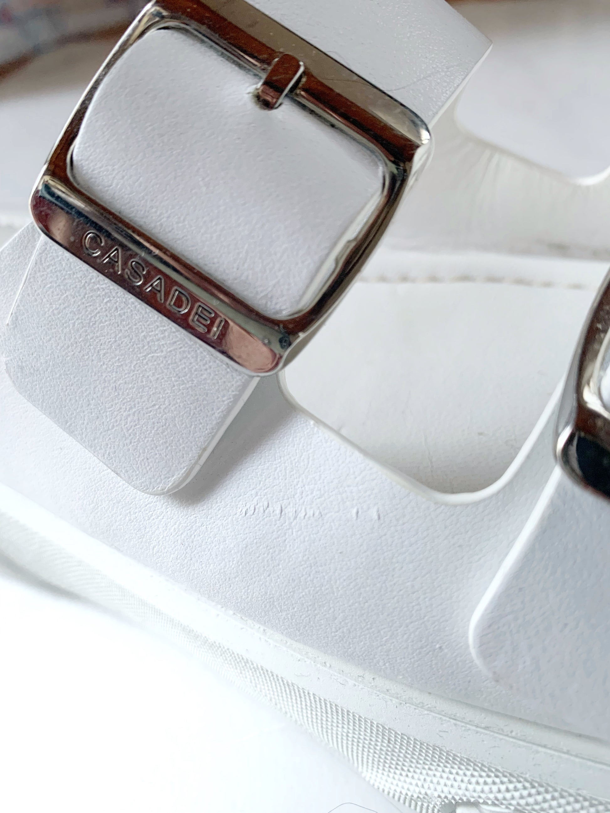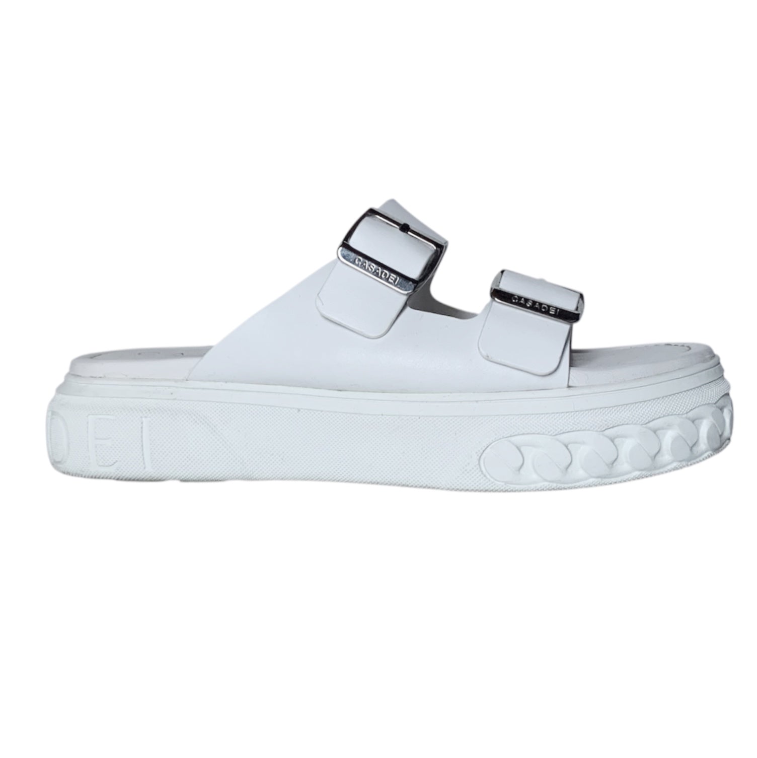 Ciabatte con doppi cinturini in pelle bianca, fibbie oversize color argento e plantare anatomico in pelle laminata per un comfort superiore. Suola in gomma da 4 cm con logo Casadei in rilievo sul retro.