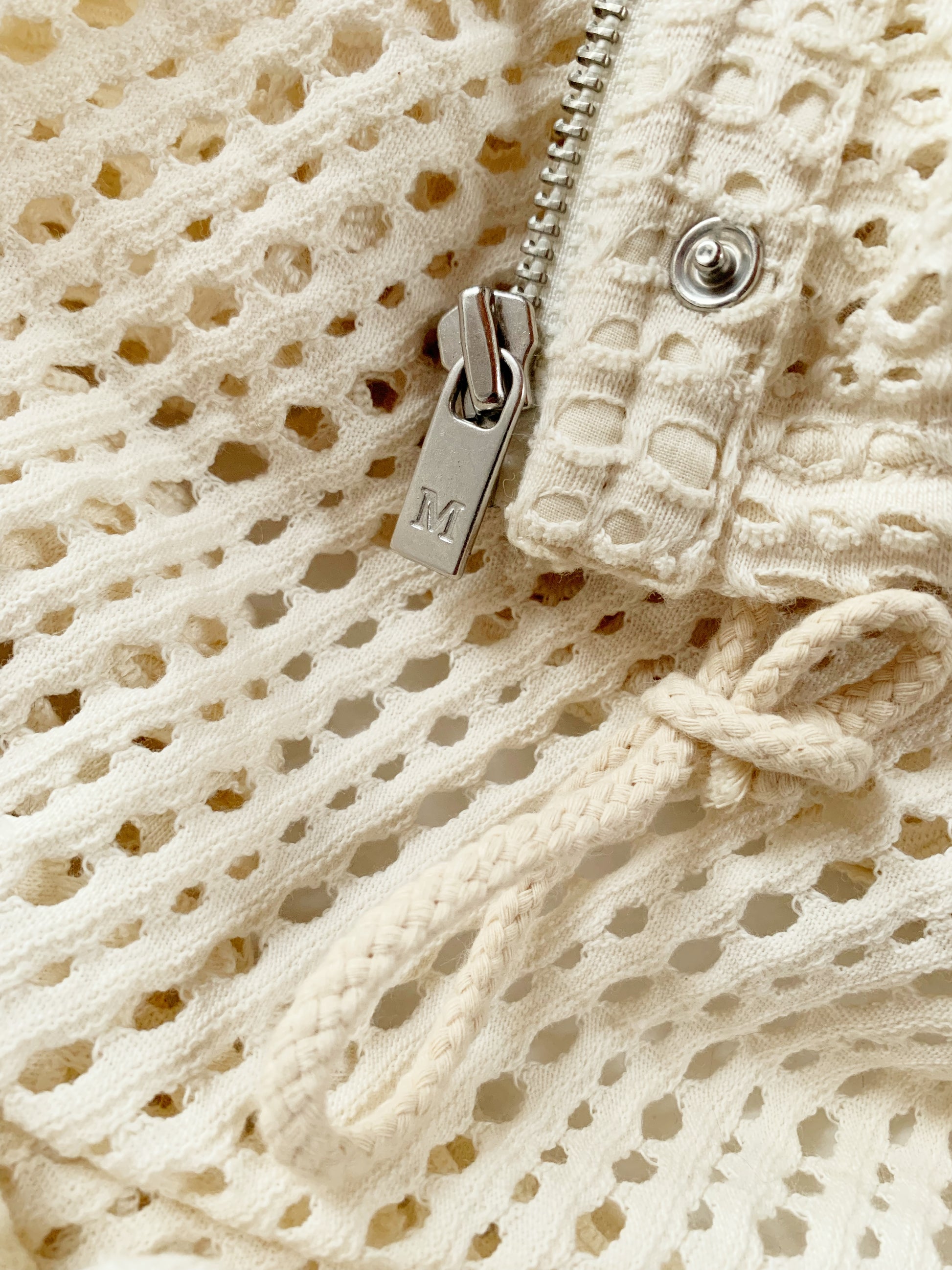 Felpa traforata in color bianco latte con chiusura a zip e cappuccio, maniche lunghe, tasche.