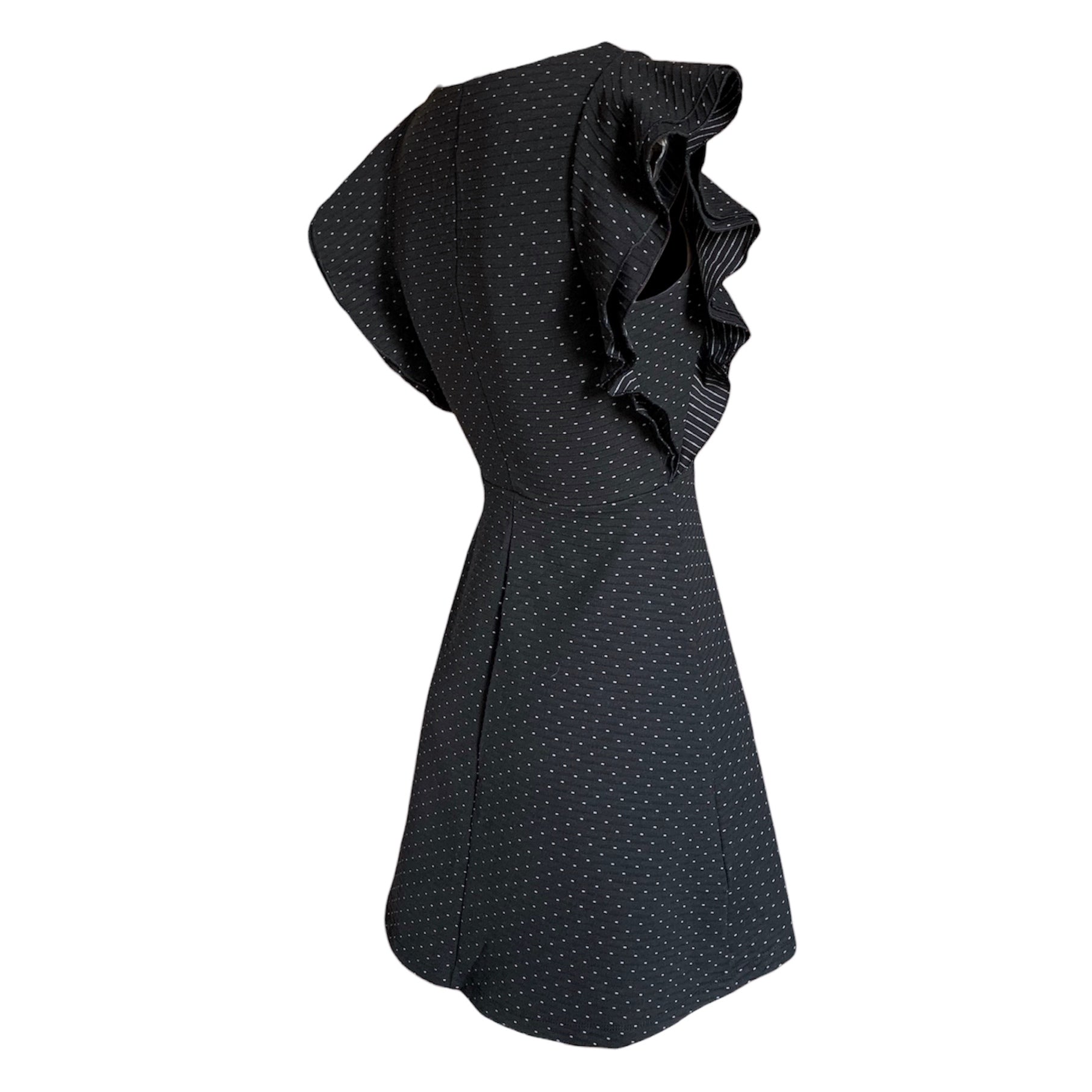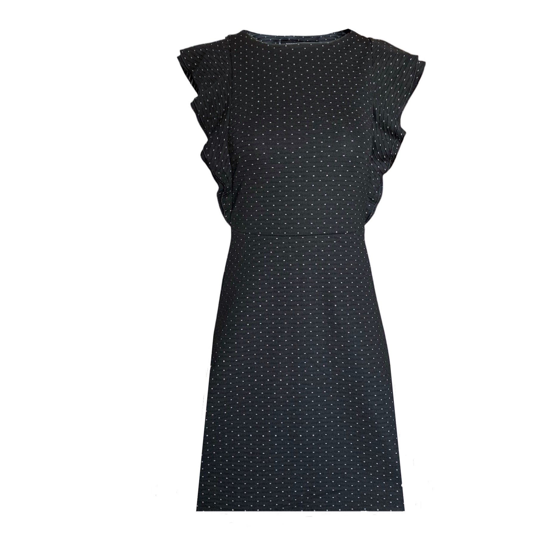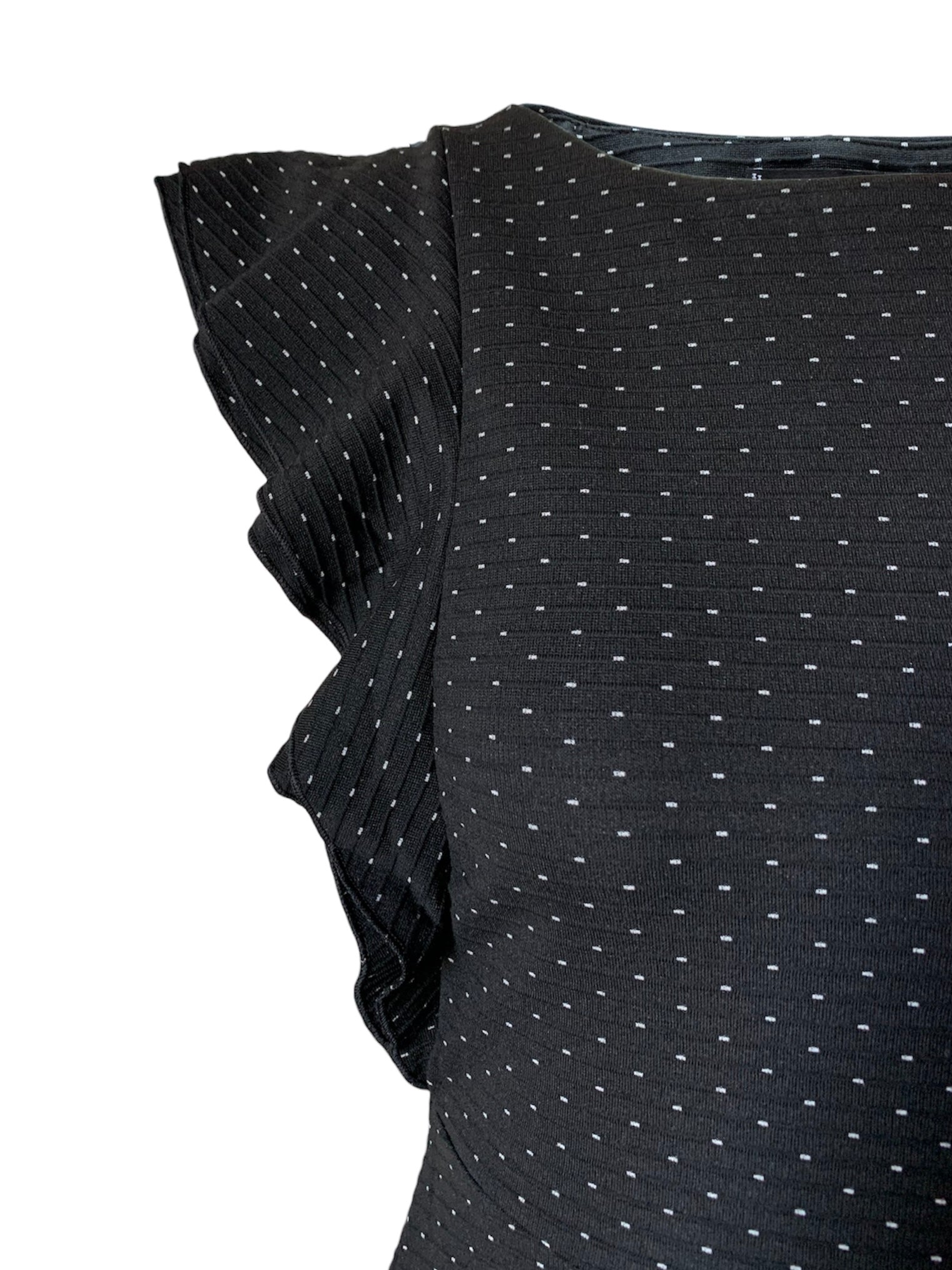 Mini abito elasticizzato senza maniche con scollo a barca e gonna tagliata ad A. Volants sulle spalle.