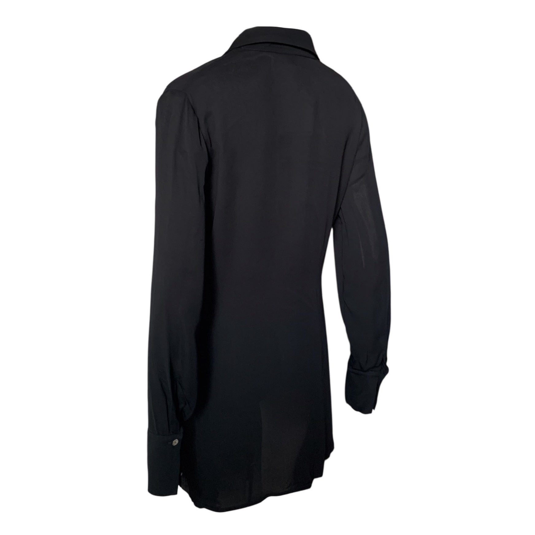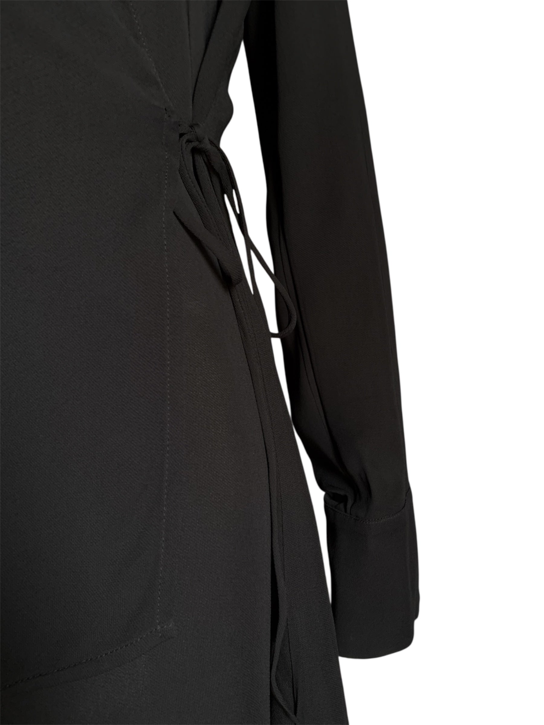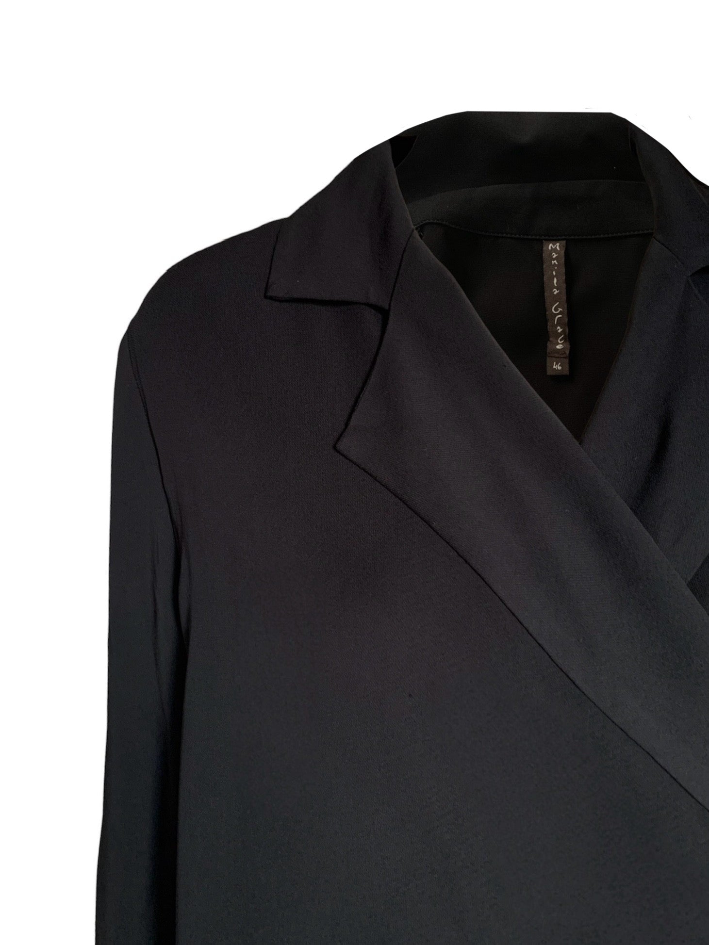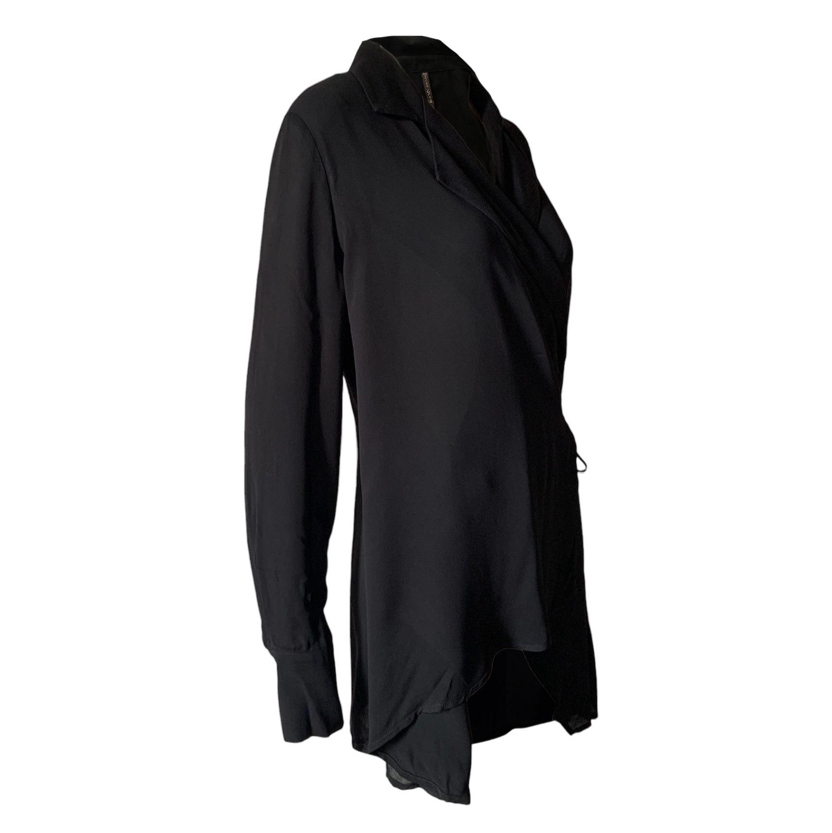Camicia con chiusura a portafoglio tramite lacci e collo con revers, maniche lunghe con polsino, lunghezza asimmetrica.