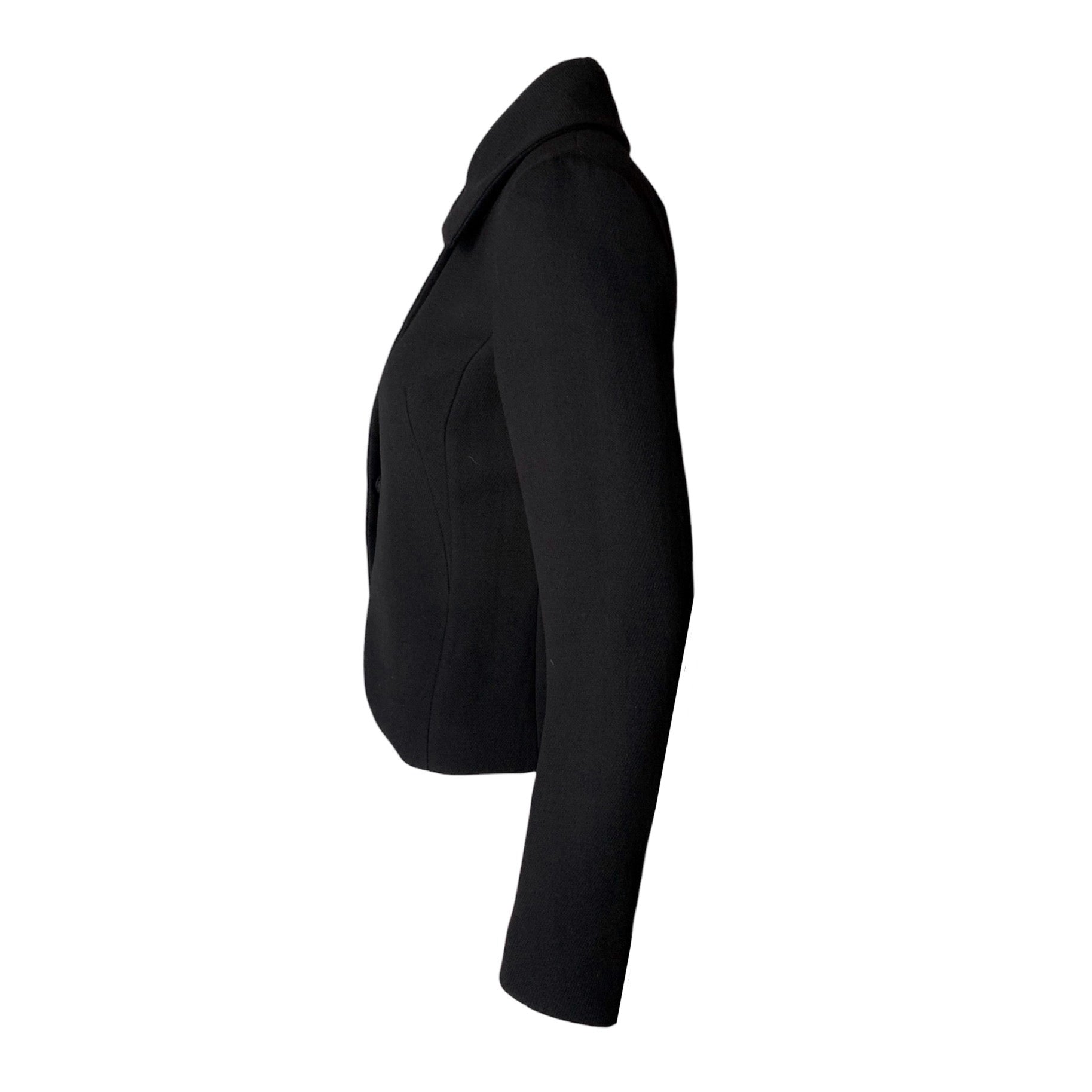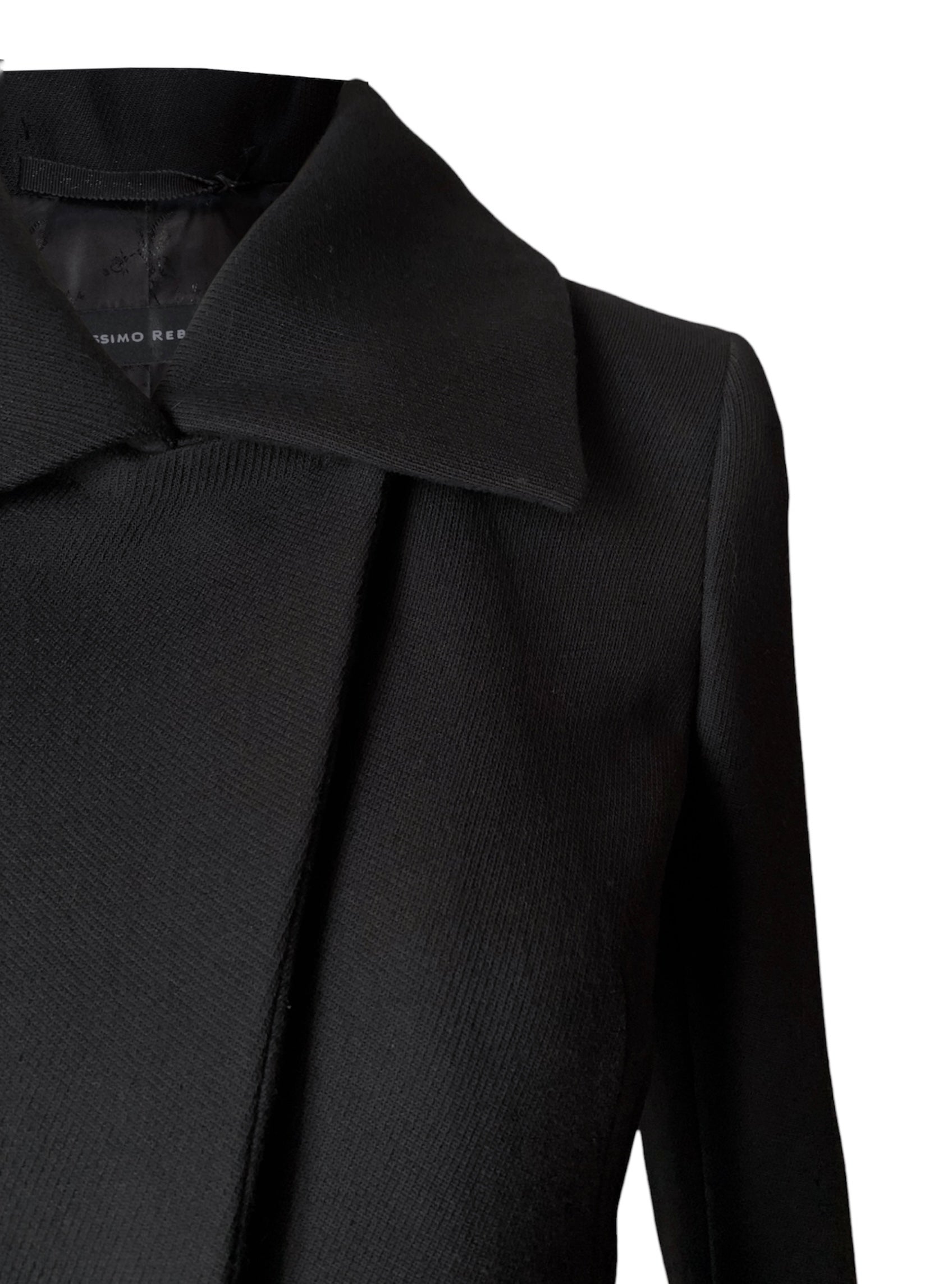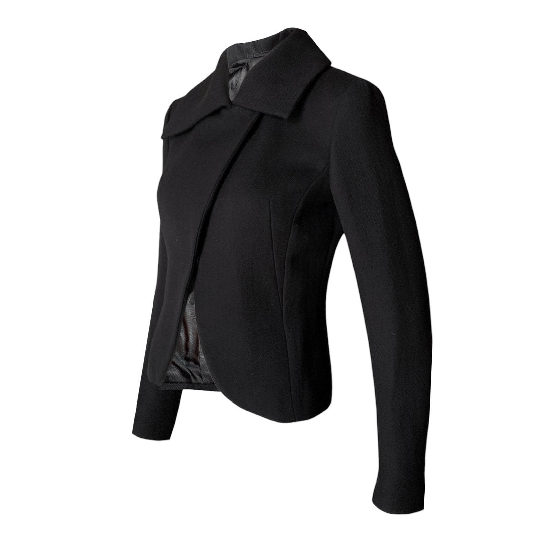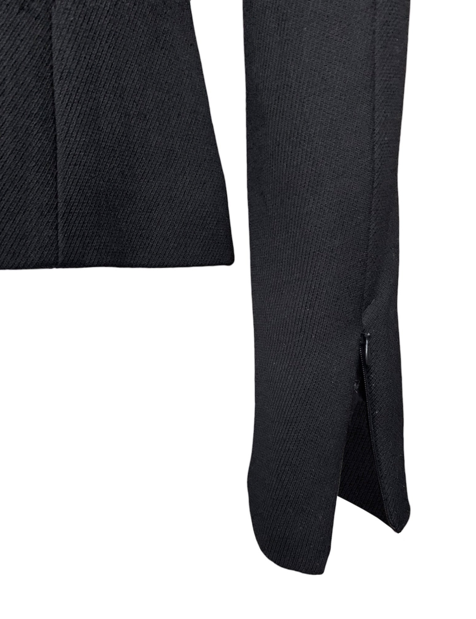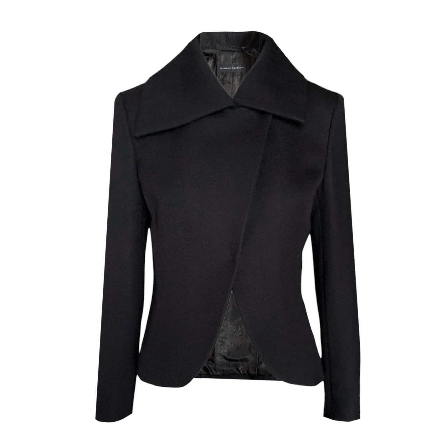 Giacca monopetto con chiusura asimmetrica a due bottoni con clip. Collo con revers asimmetrico. Fondo manica con apertura parziale con zip. Taglio sciancrato.
