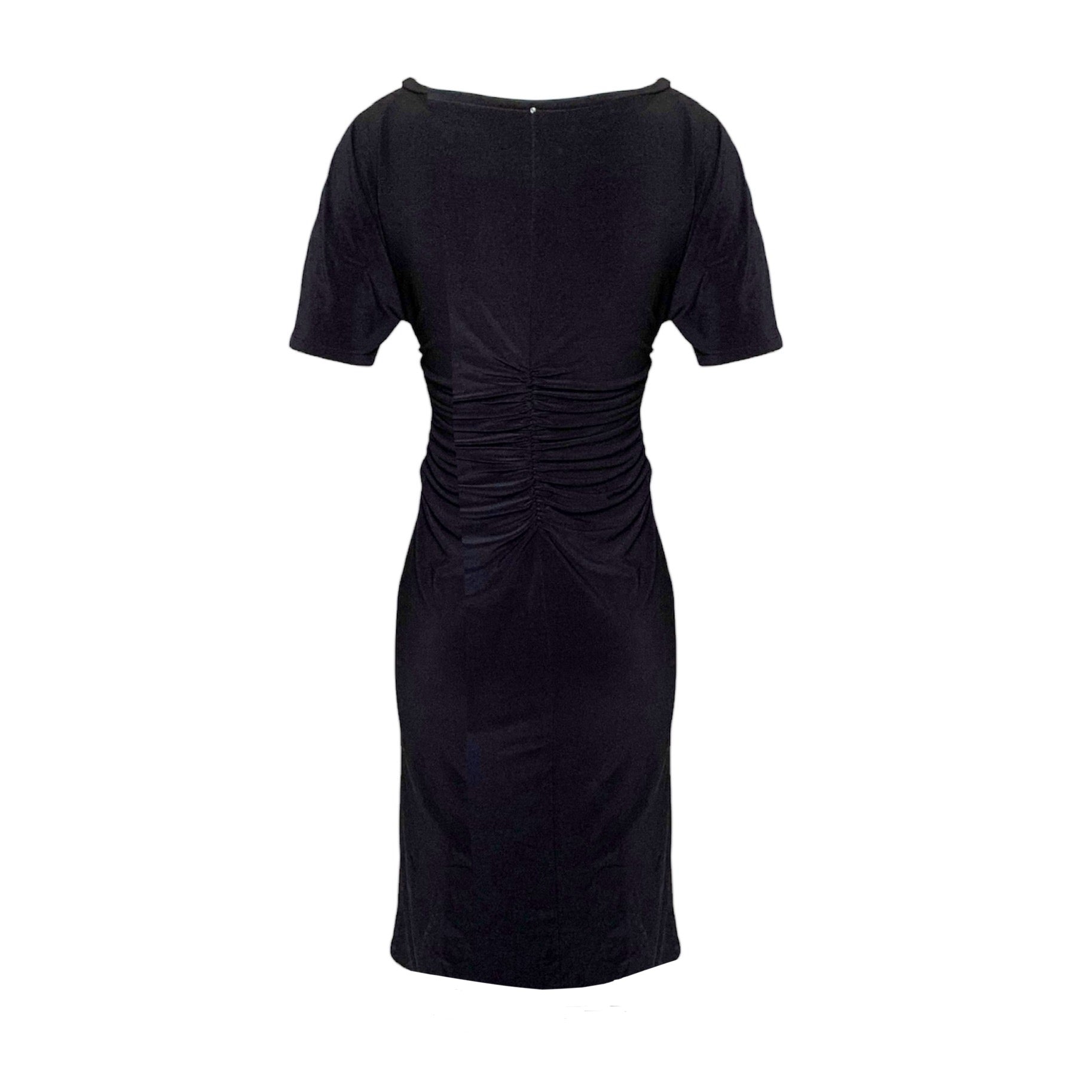 Abito con maniche corte e scollo a barca, silhouette aderente con dettaglio di plissettatura sul busto. Tessuto elastico che fascia il corpo. Sfoderato.
