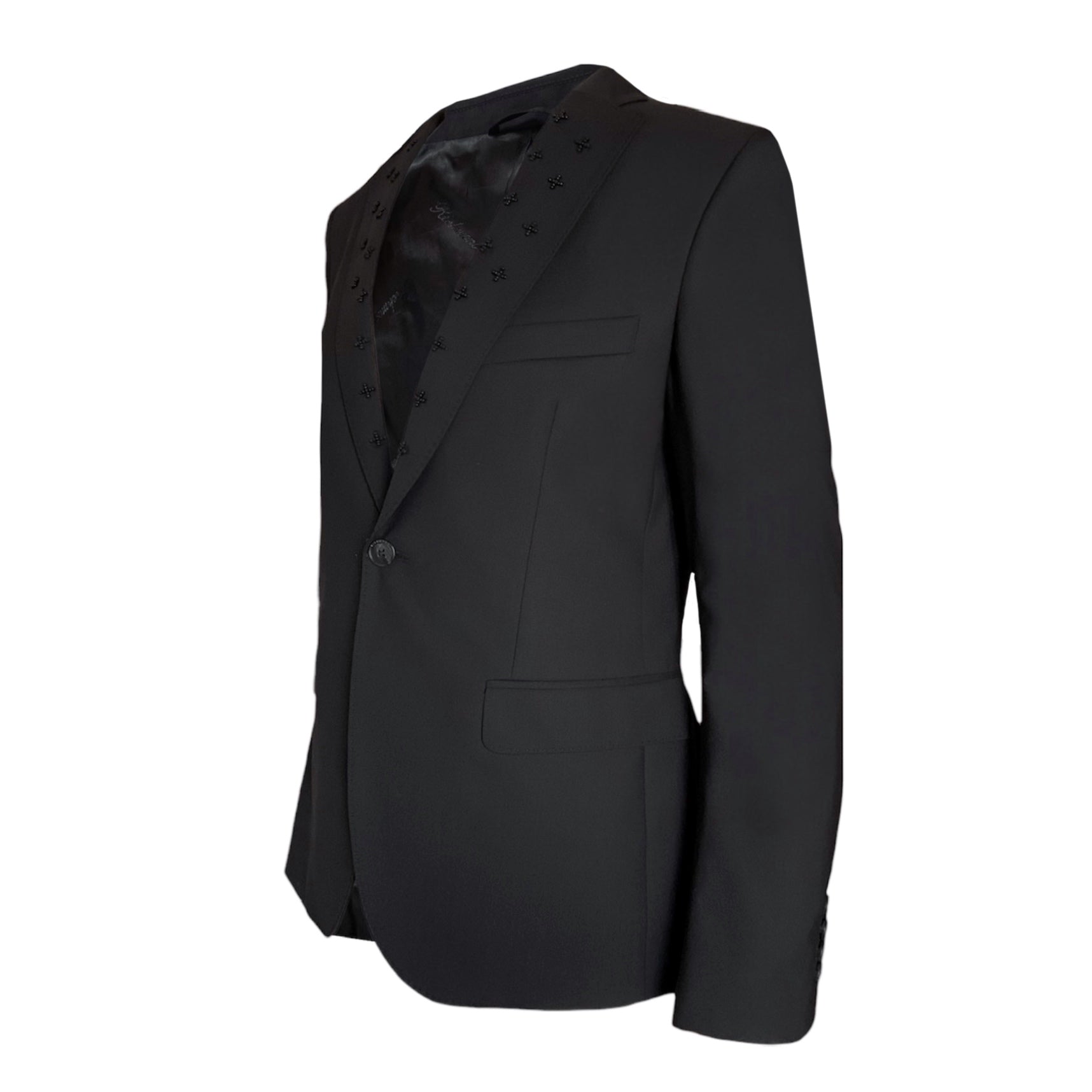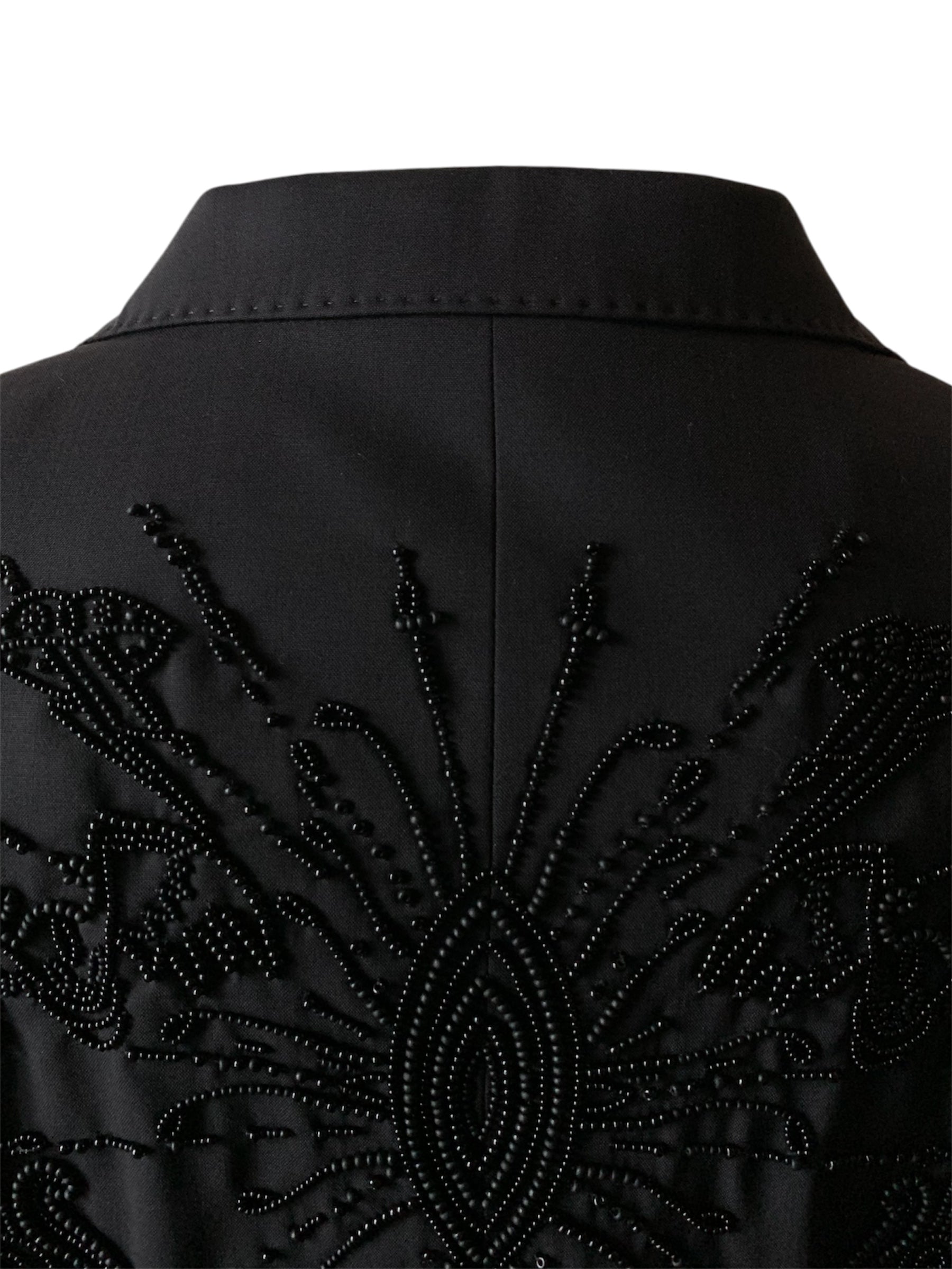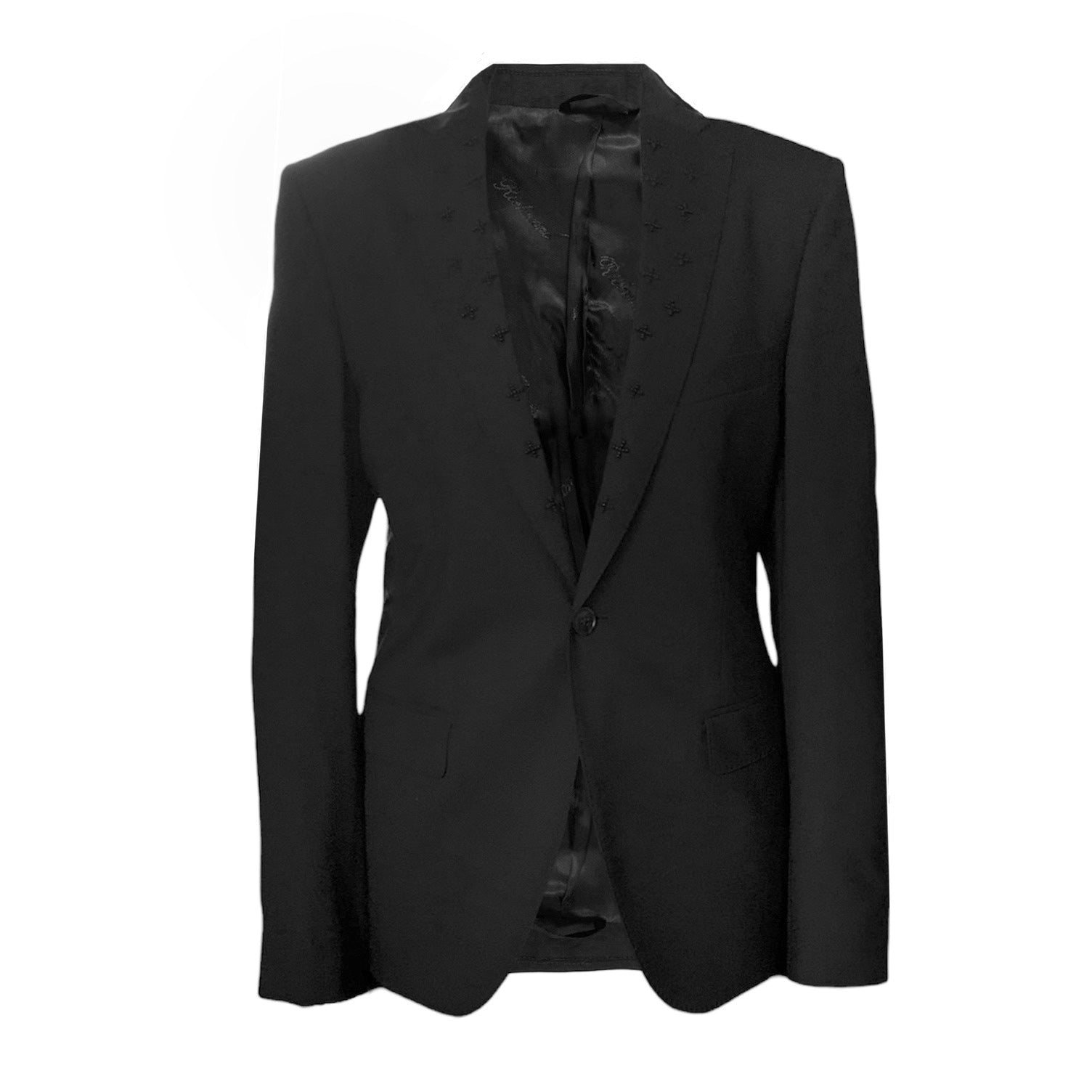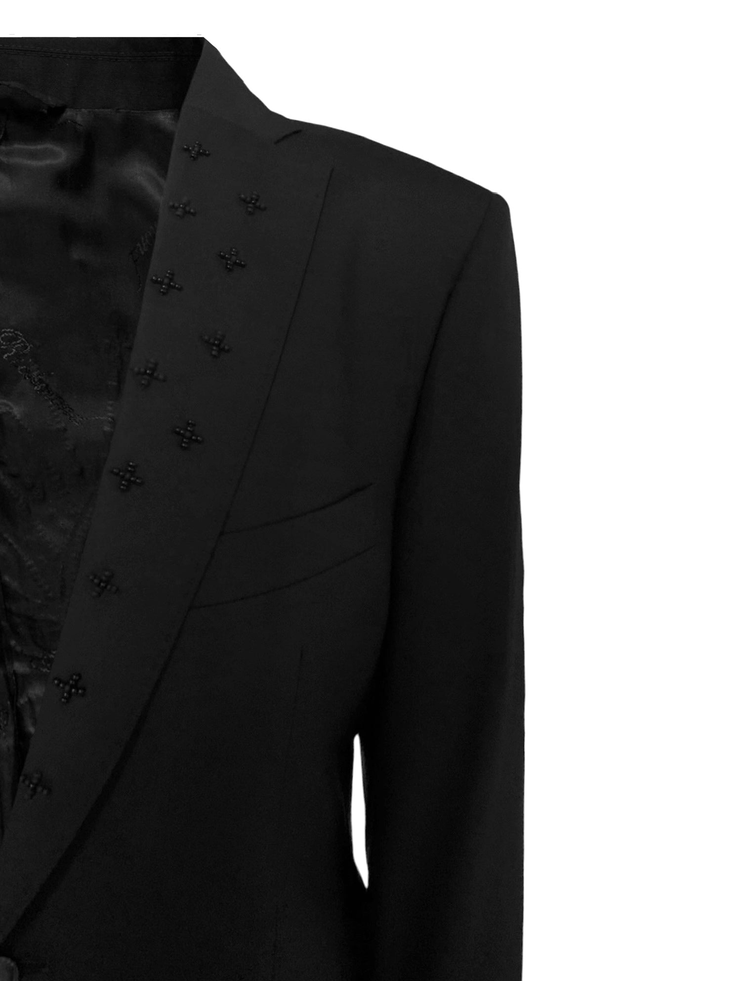 Blazer monopetto con vestibilità slim, taschino a filetto sul petto, collo con revers decorato con croci in perline nere, tasche laterali con patta, polsini con bottone, spacco doppio posteriore. Dettaglio di decoro sulla schiena in bijoux applicati tono su tono. Fodera logata (51% acetato, 49% viscosa) e due tasche interne.