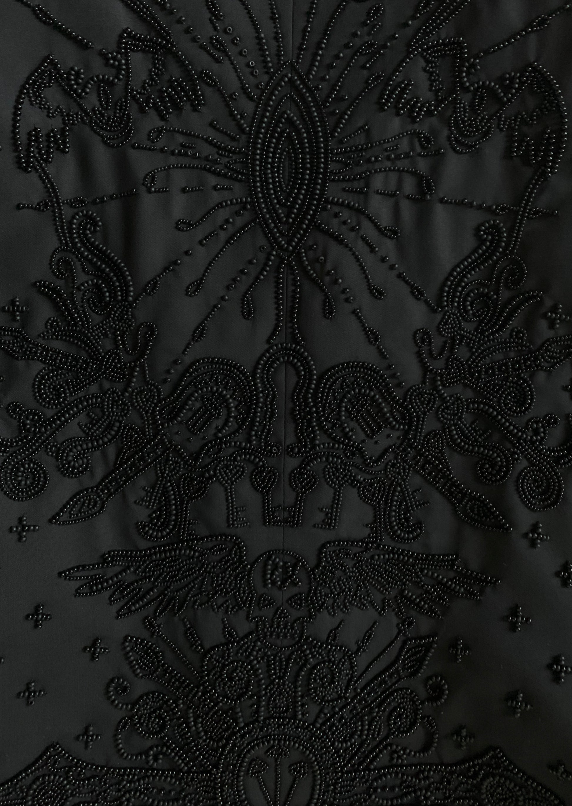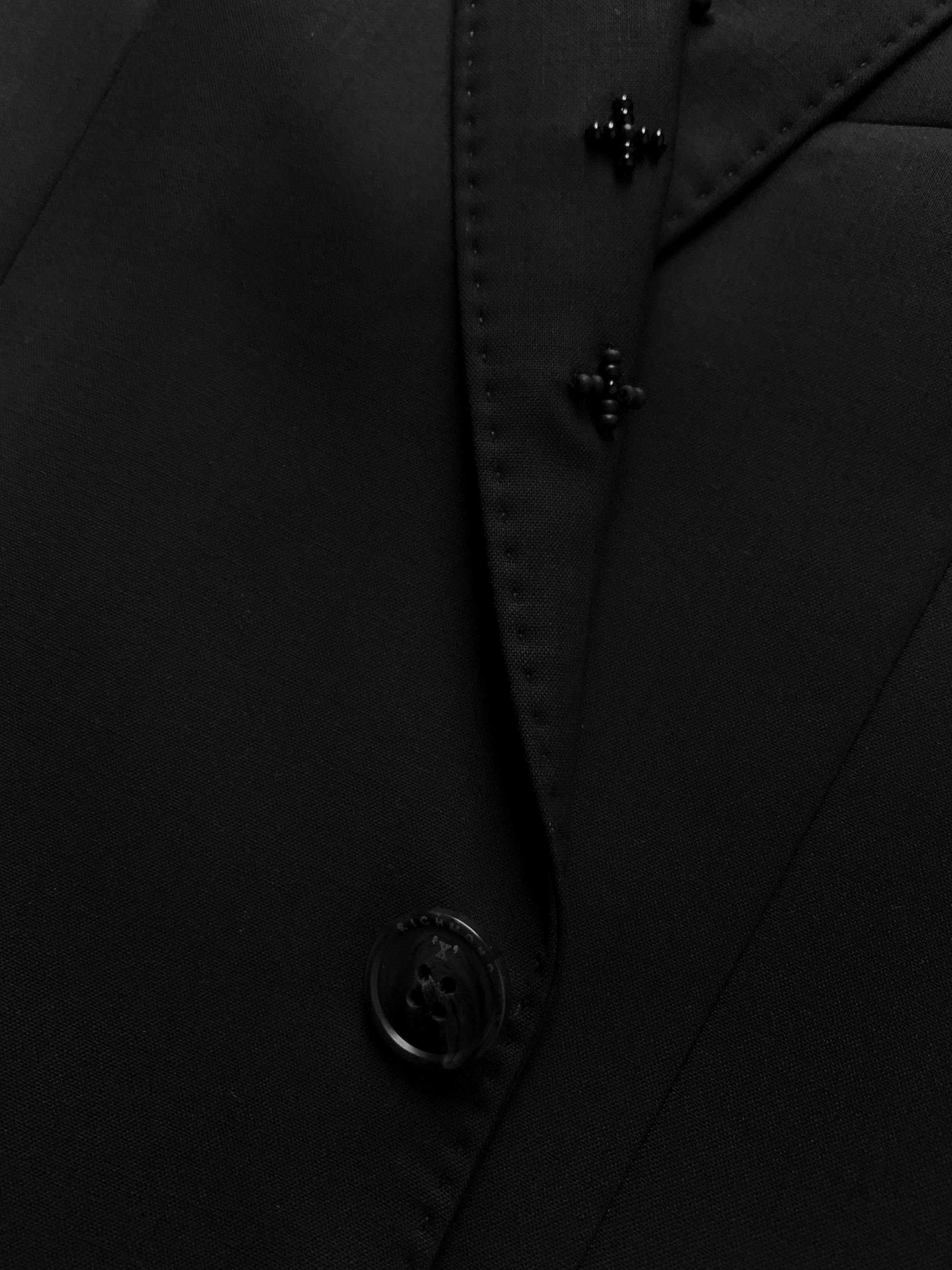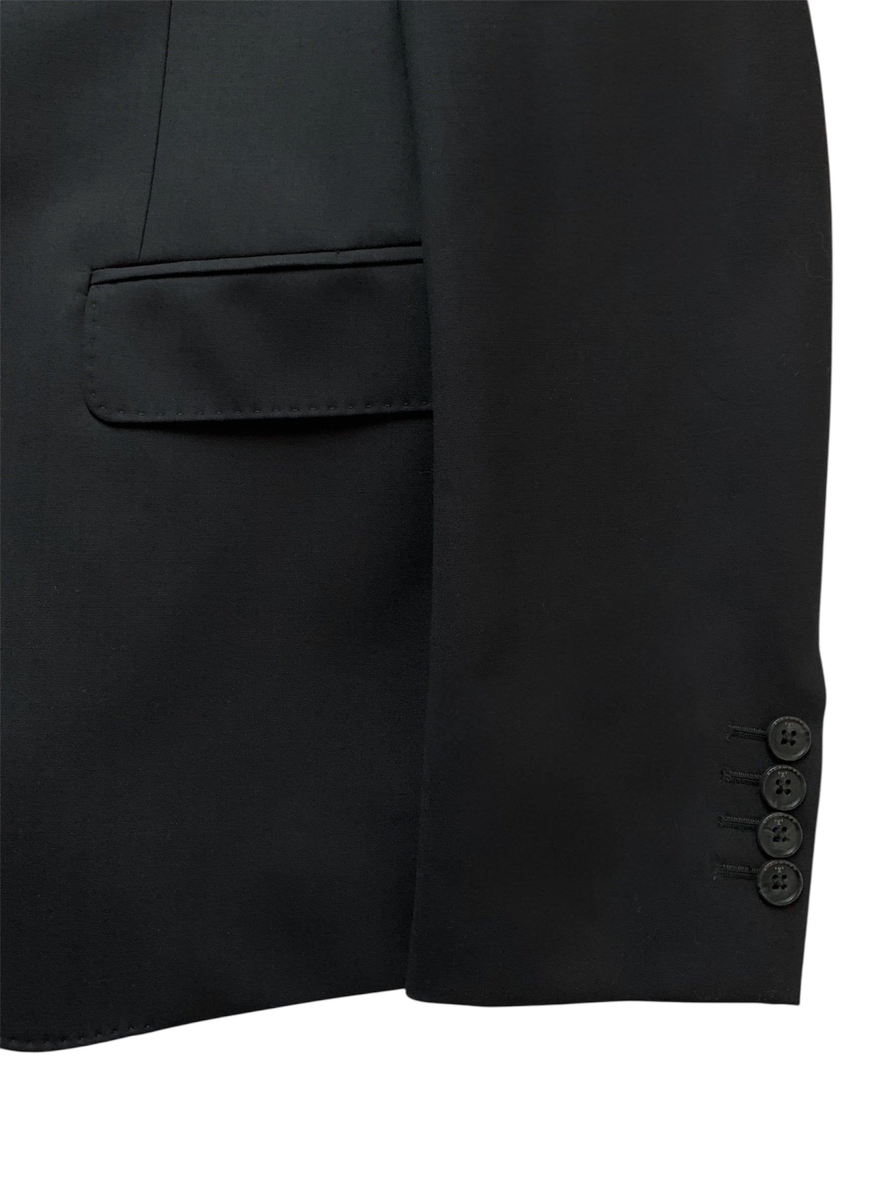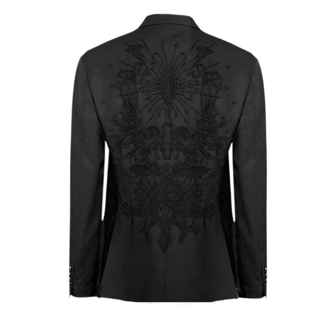 Blazer monopetto con vestibilità slim, taschino a filetto sul petto, collo con revers decorato con croci in perline nere, tasche laterali con patta, polsini con bottone, spacco doppio posteriore. Dettaglio di decoro sulla schiena in bijoux applicati tono su tono. Fodera logata (51% acetato, 49% viscosa) e due tasche interne.