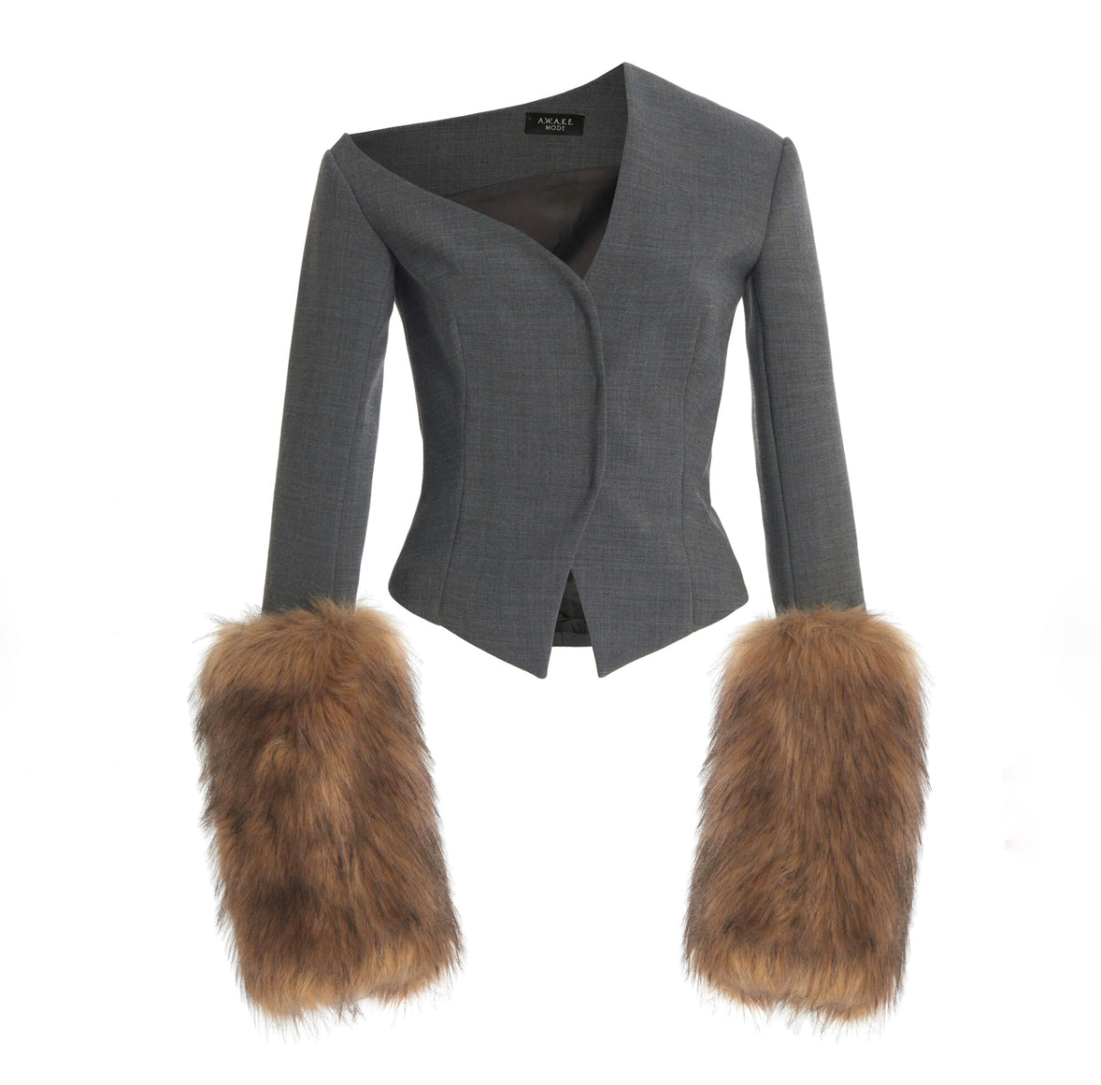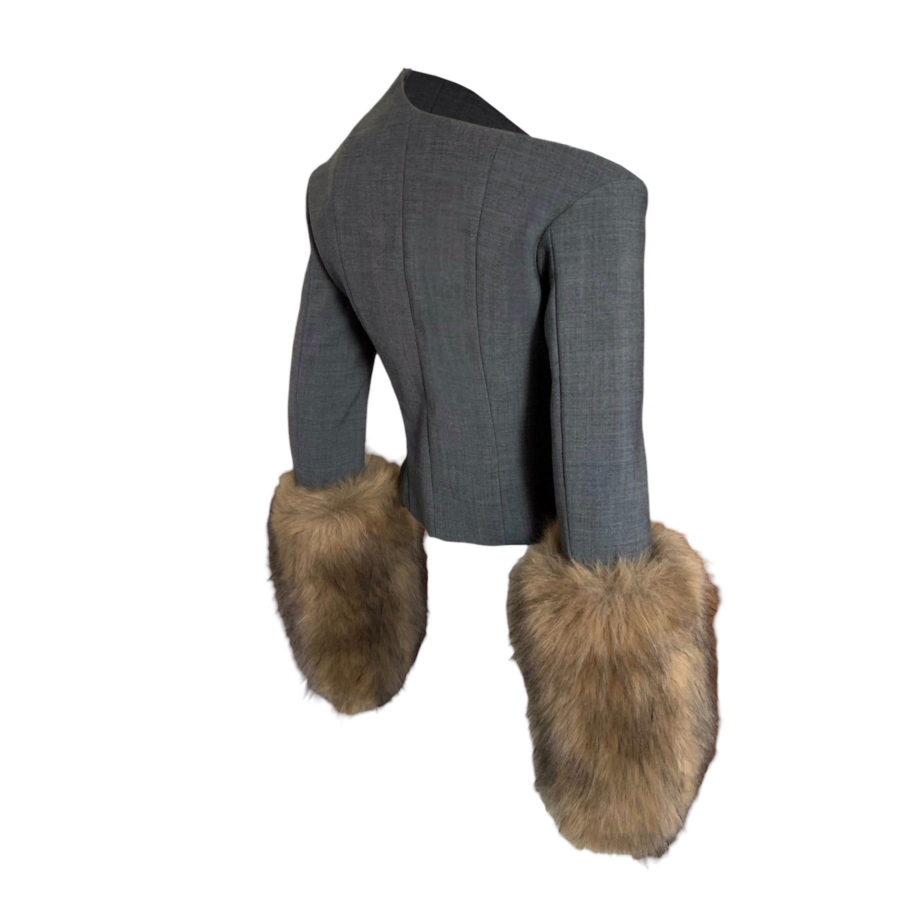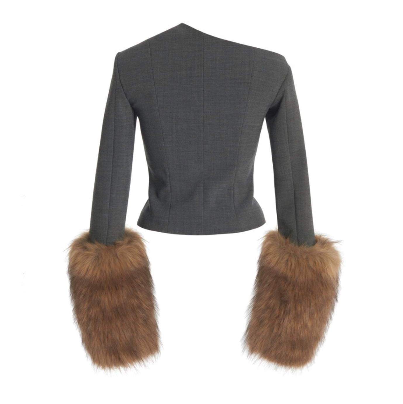 La giacca corta con taglio asimmetrico che scopre una spalla, bordo in pelliccia sintetica a contrasto sui polsini delle maniche. Polsini in pelliccia staccabili. Chiusura frontale con bottoni a clip nascosti.
