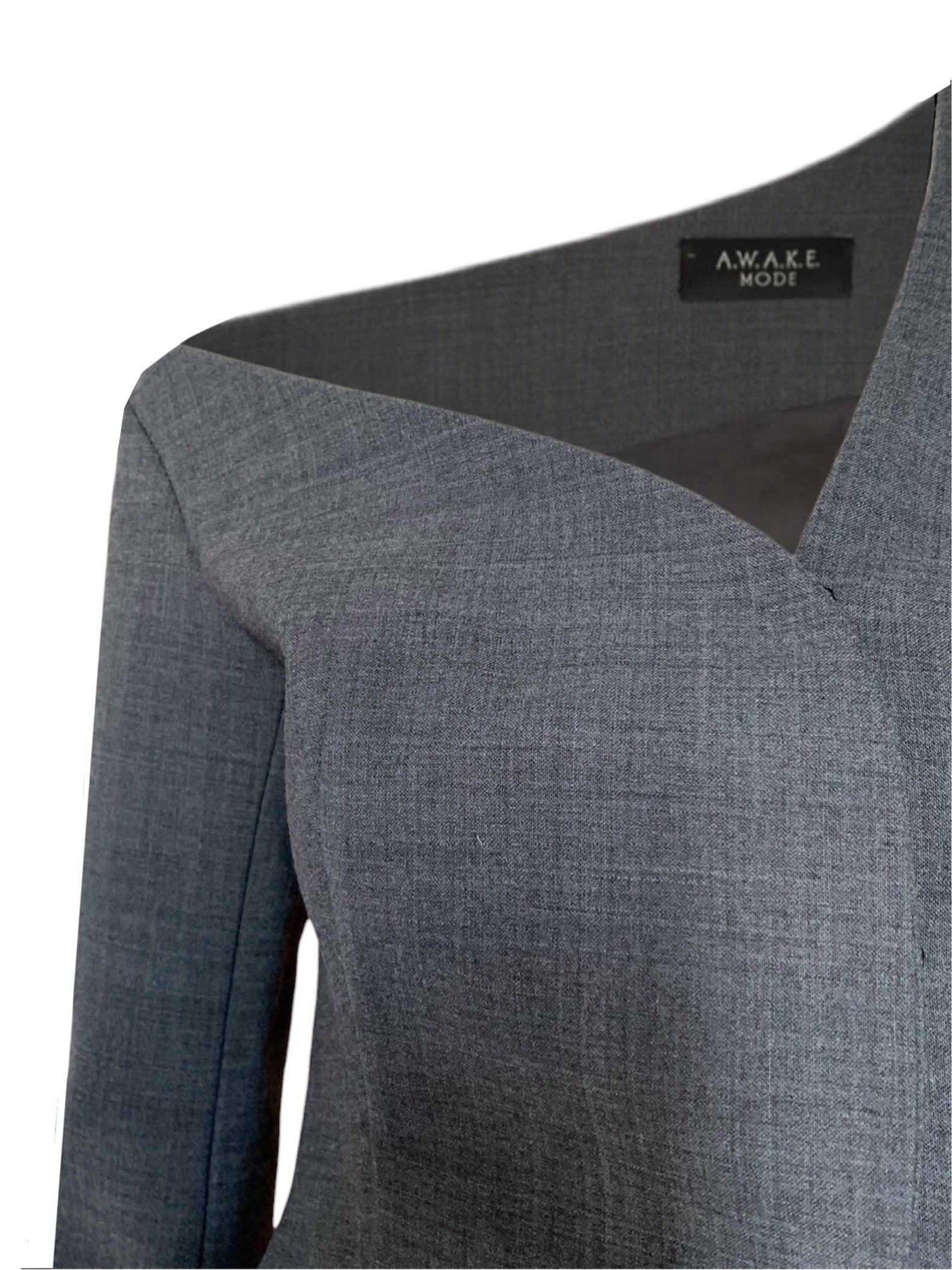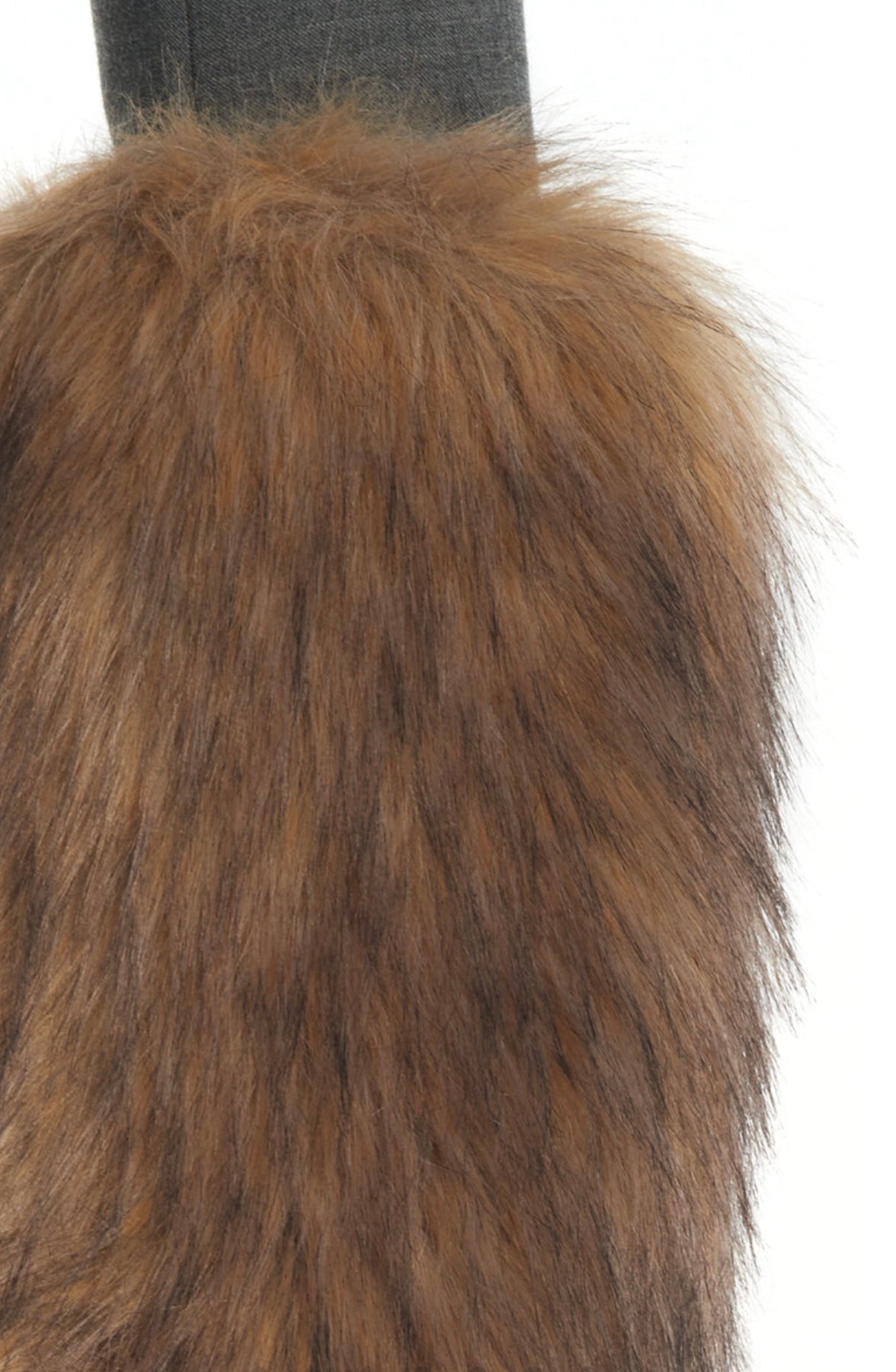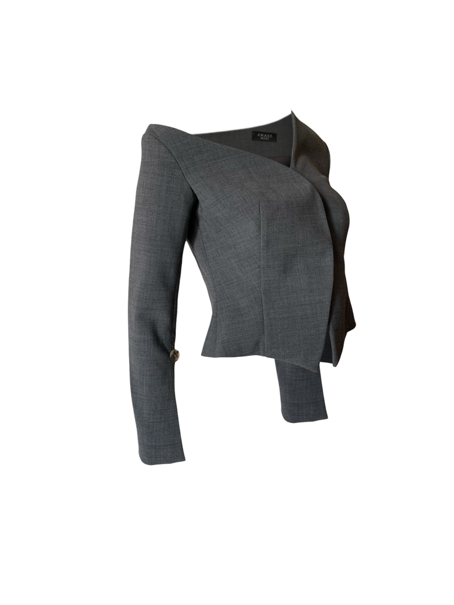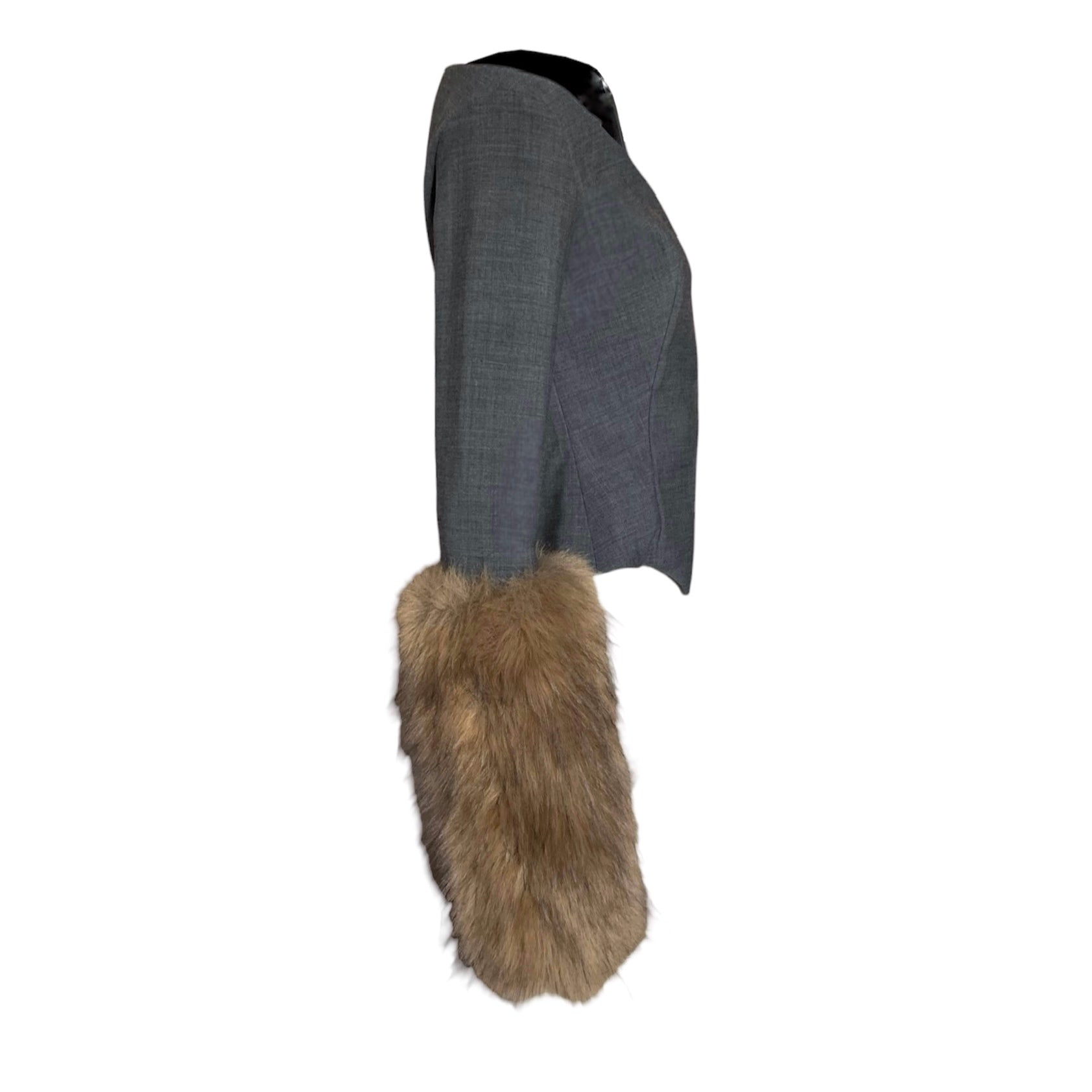 La giacca corta con taglio asimmetrico che scopre una spalla, bordo in pelliccia sintetica a contrasto sui polsini delle maniche. Polsini in pelliccia staccabili. Chiusura frontale con bottoni a clip nascosti.