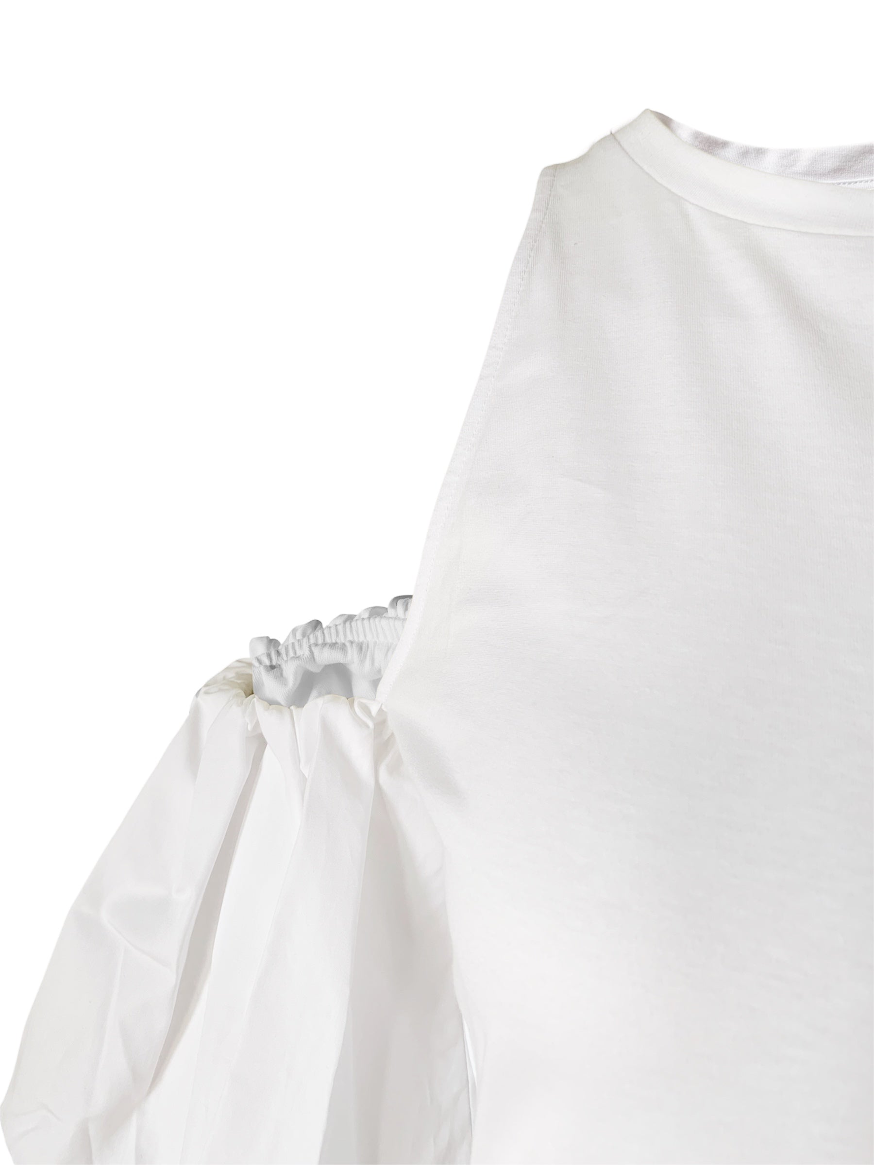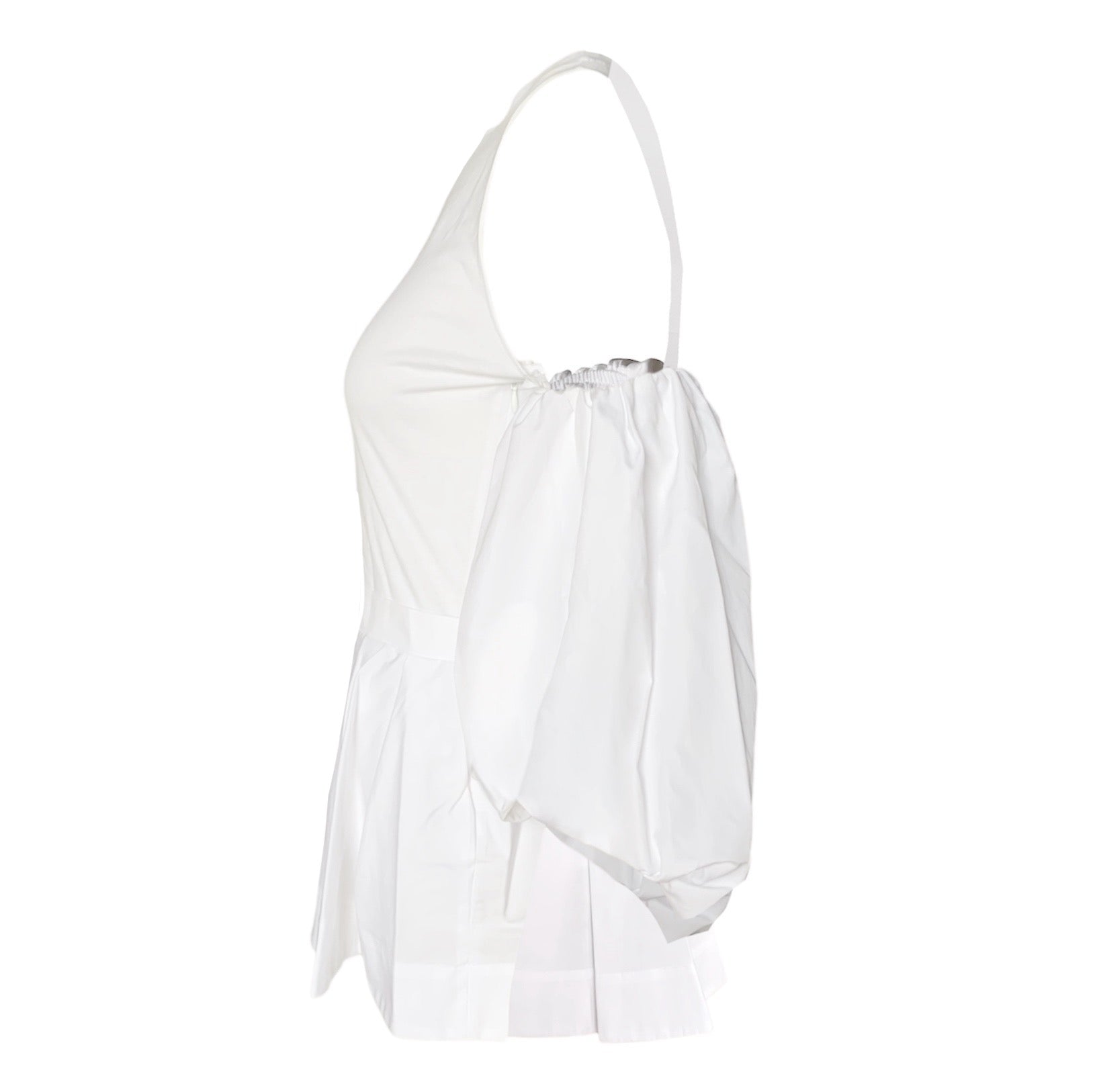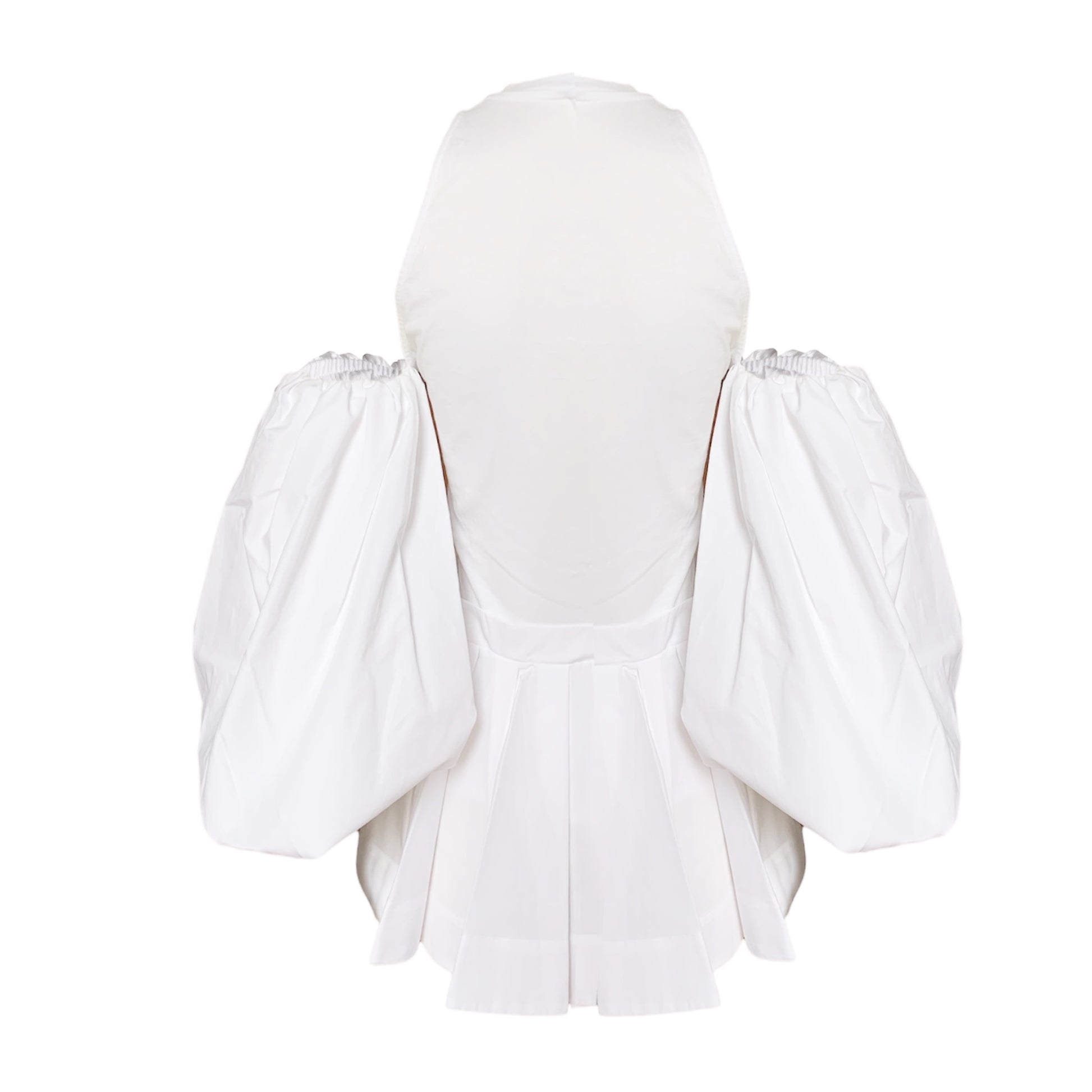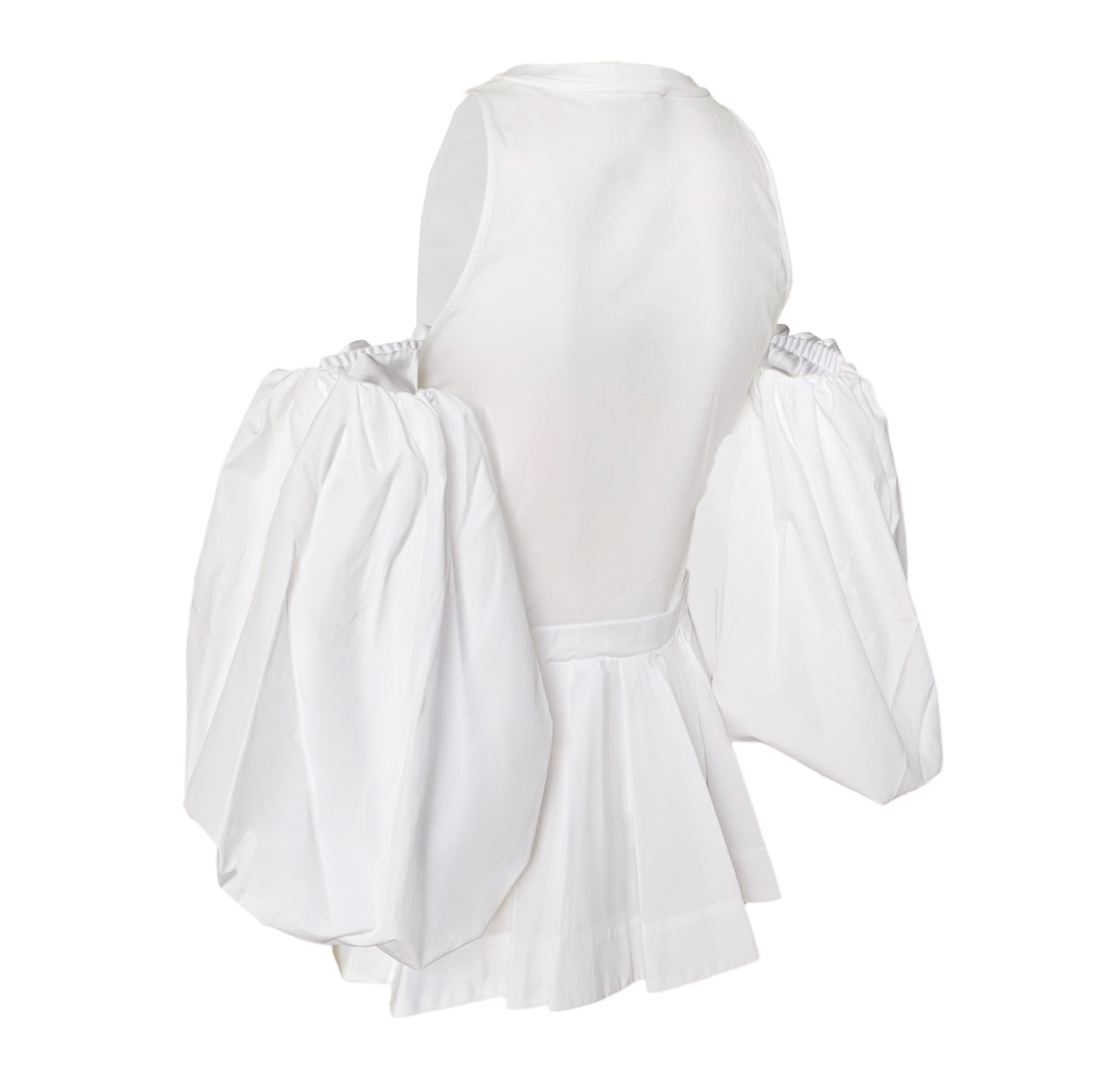 Mini abito con corpetto a canotta ed ampie maniche a sbuffo che lasciano intravedere le spalle, gonna a pieghe con sottogonna in tinta. Chiusura con zip laterale nascosta.