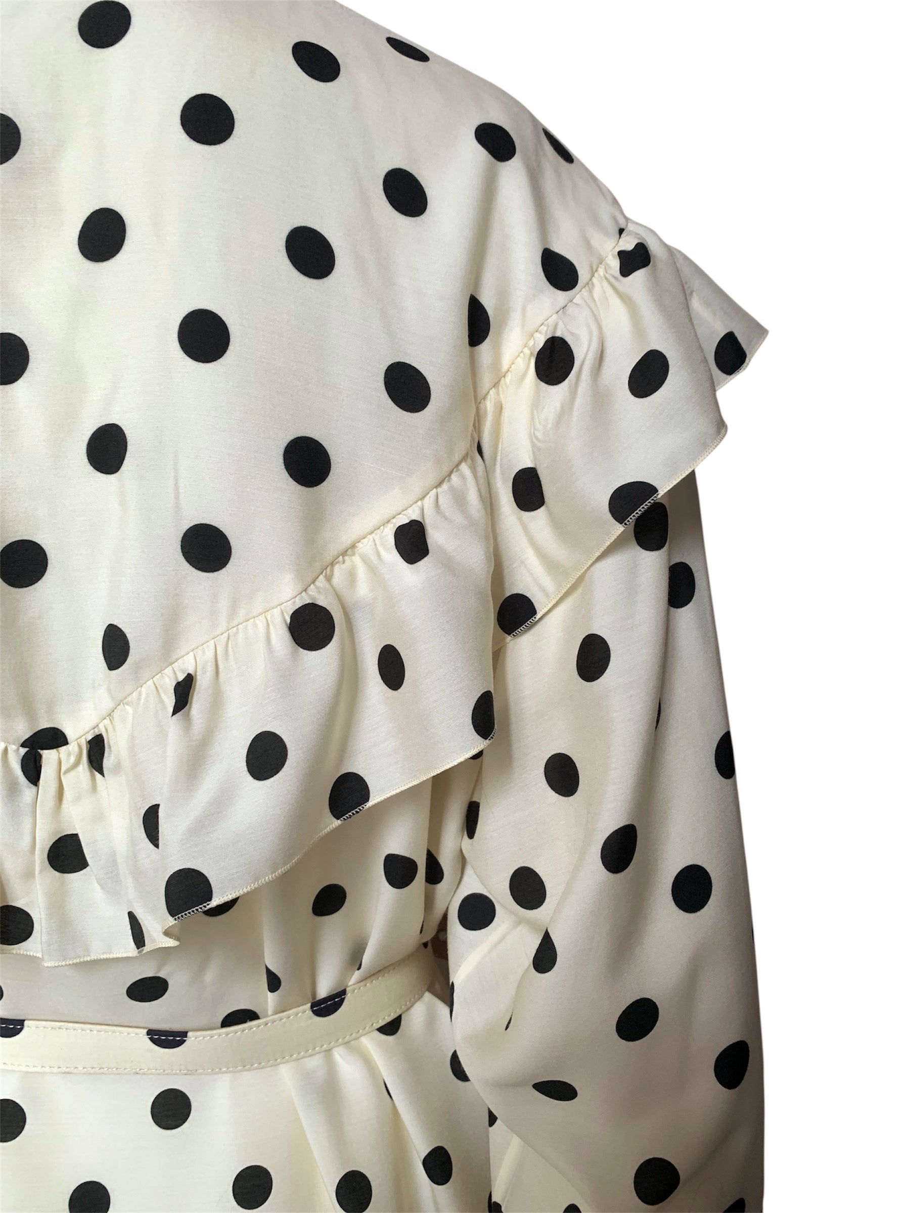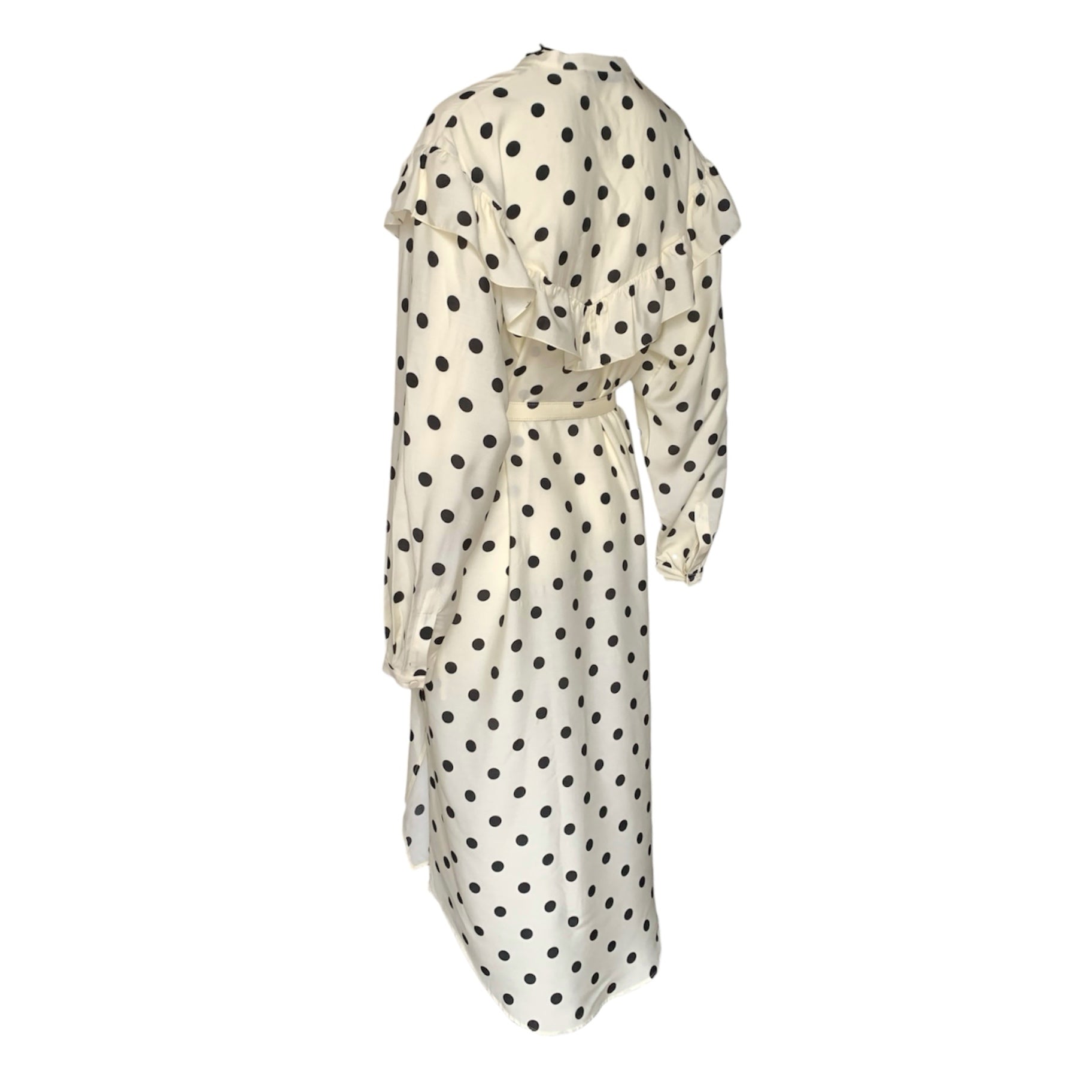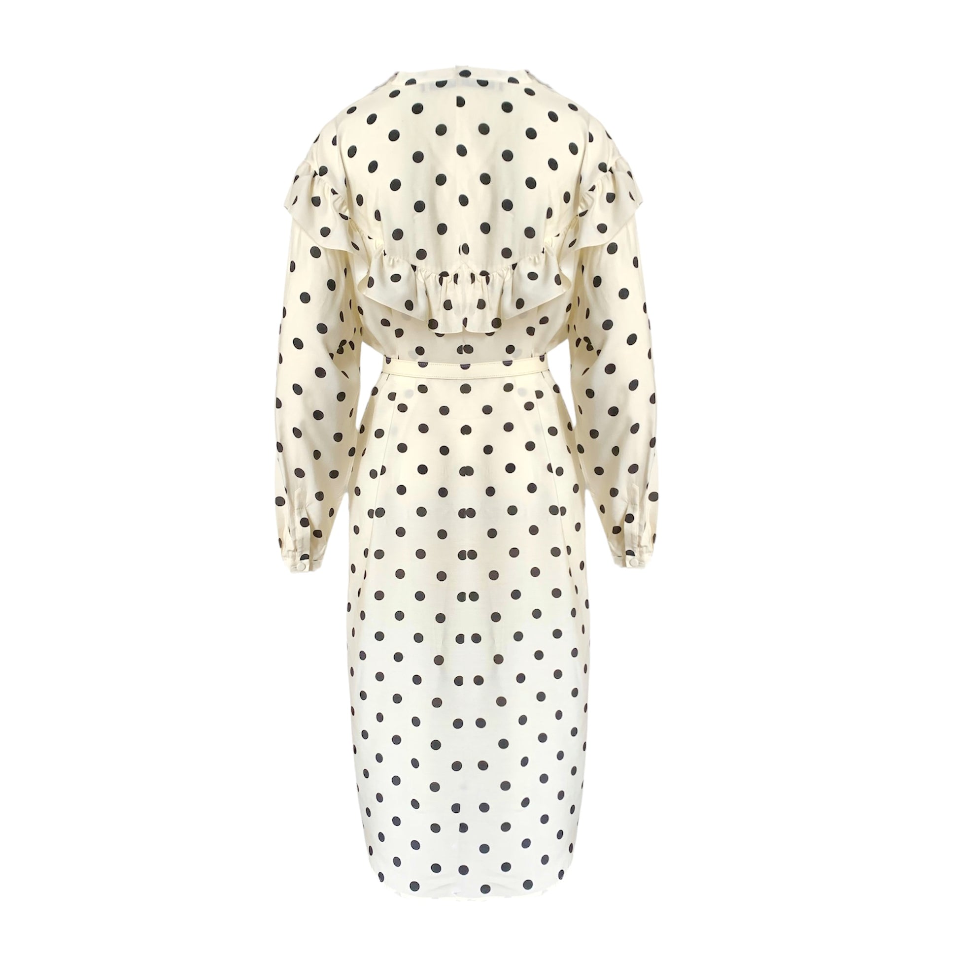 Maxi abito chemisier con colletto classico a girocollo e chiusura frontale sul busto con bottoni. Maniche lunghe leggermente blusanti fermate da polsino con bottoni. Dettagli di volants sul busto ripresi sulla schiena, tasche lungo le cuciture laterali, spacchi laterali. Orlo posteriore curvo. Cintura in tono. Sfoderato.