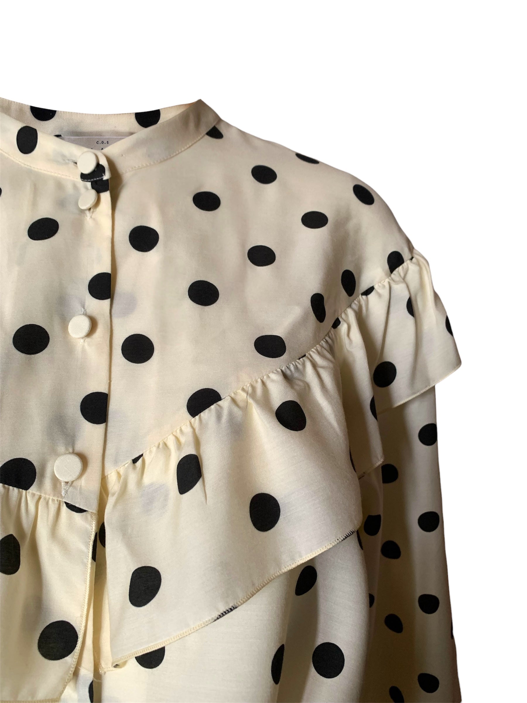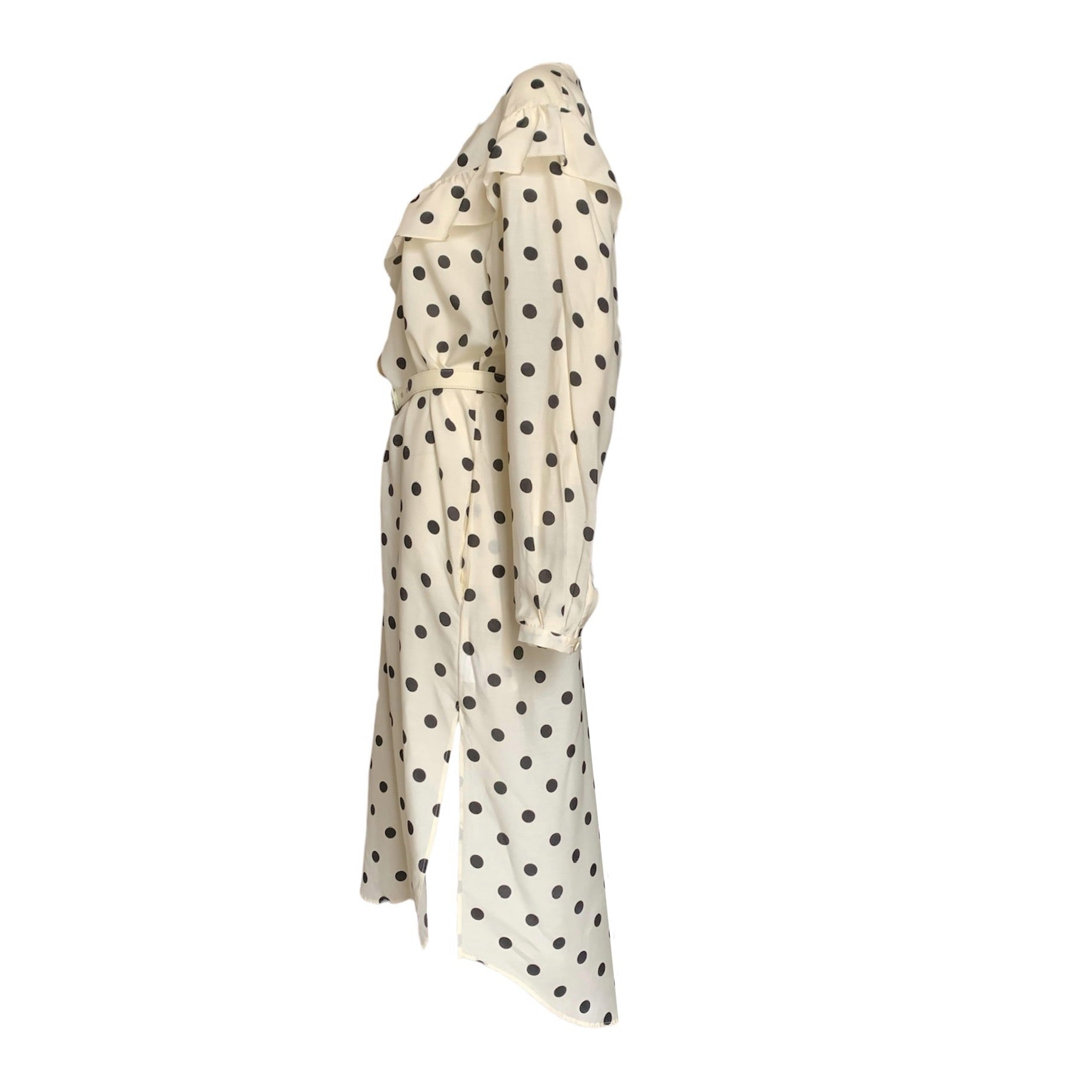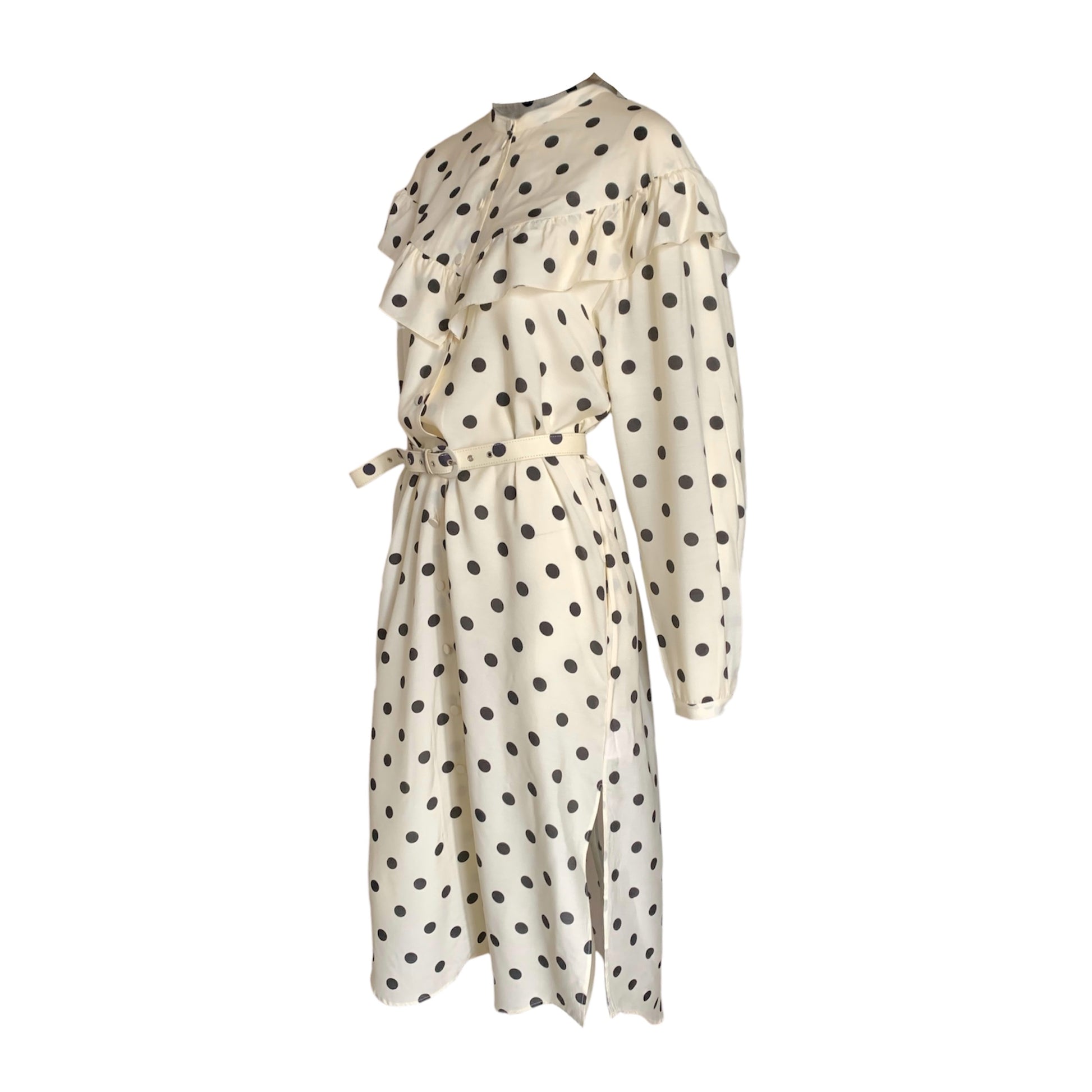Maxi abito chemisier con colletto classico a girocollo e chiusura frontale sul busto con bottoni. Maniche lunghe leggermente blusanti fermate da polsino con bottoni. Dettagli di volants sul busto ripresi sulla schiena, tasche lungo le cuciture laterali, spacchi laterali. Orlo posteriore curvo. Cintura in tono. Sfoderato.