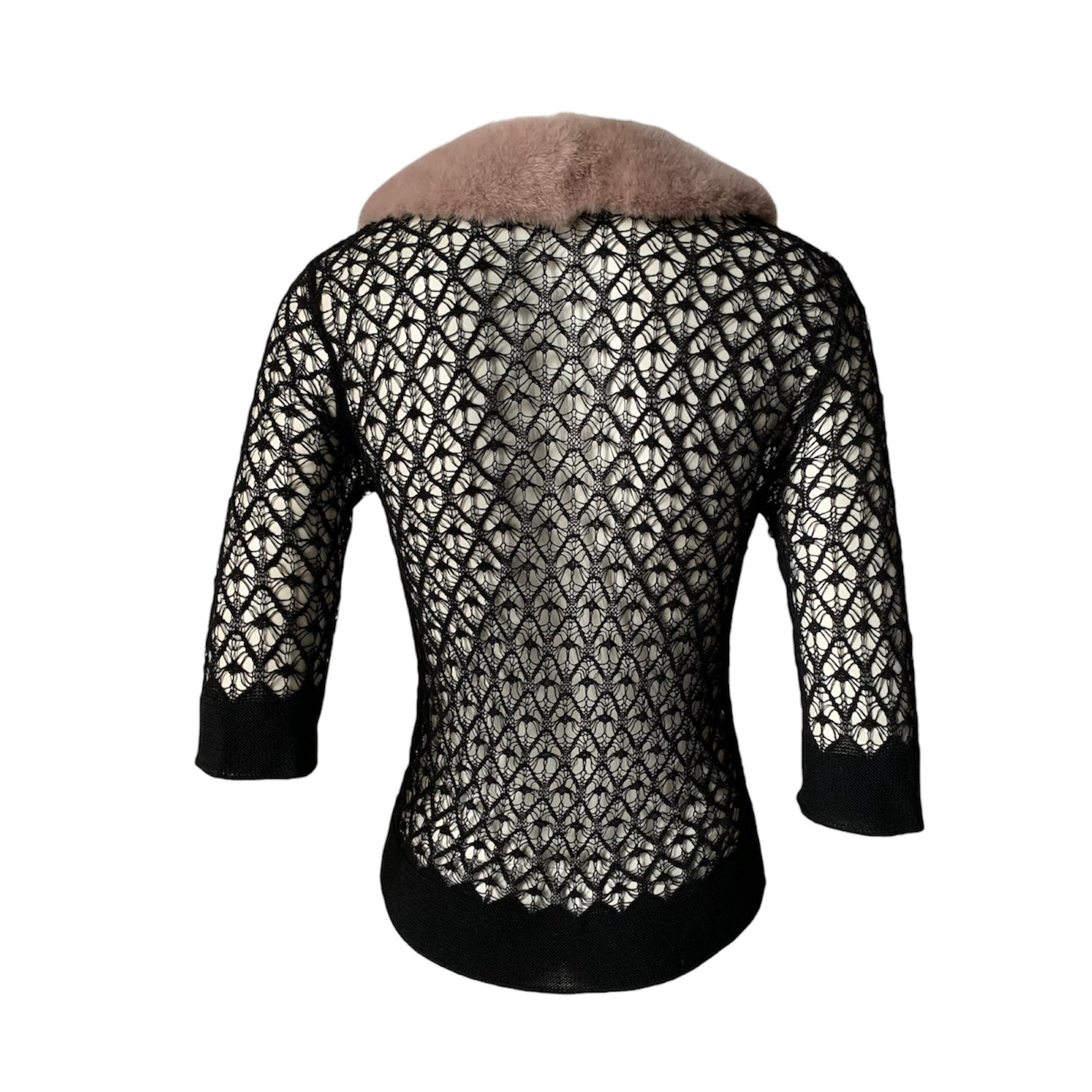 Cardigan in maglia vintage Blumarine con colletto in pelliccia. Raro pezzo iconico degli anni '90. Maglia traforata nera con pelliccia rosa non staccabile e graziosi bottoni ricoperti di tulle nero.