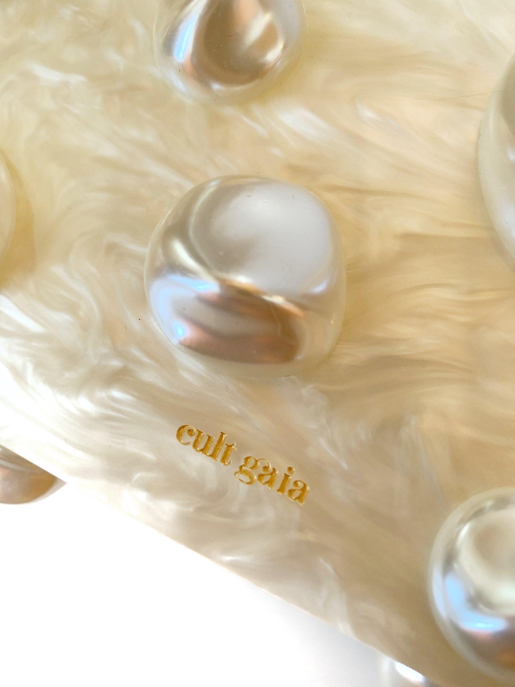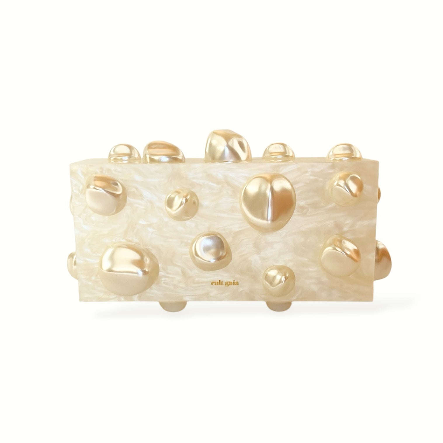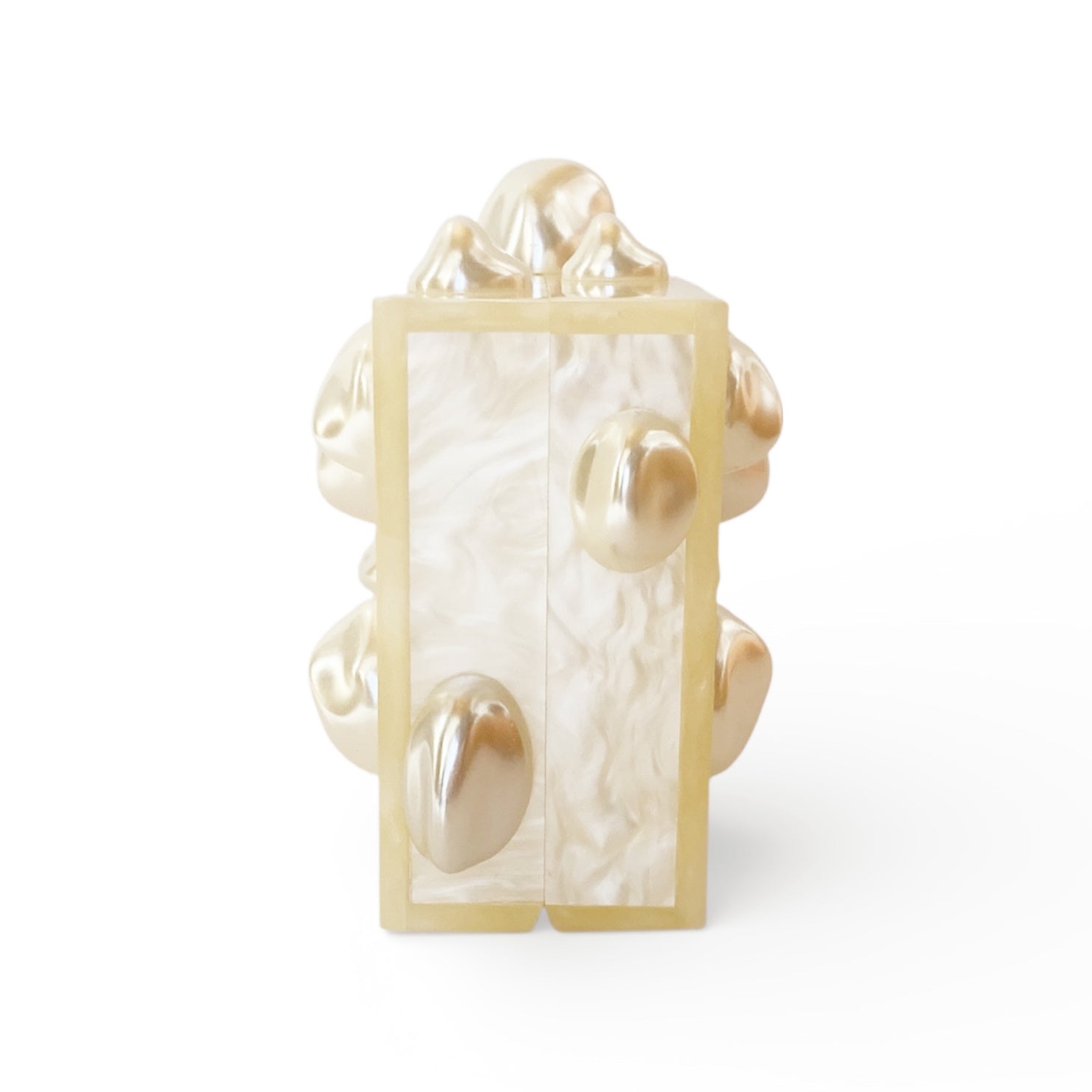 Pochette Orbs in acrilico con texture marmorizzata ed applicazioni di finte perle. Chiusura superiore.