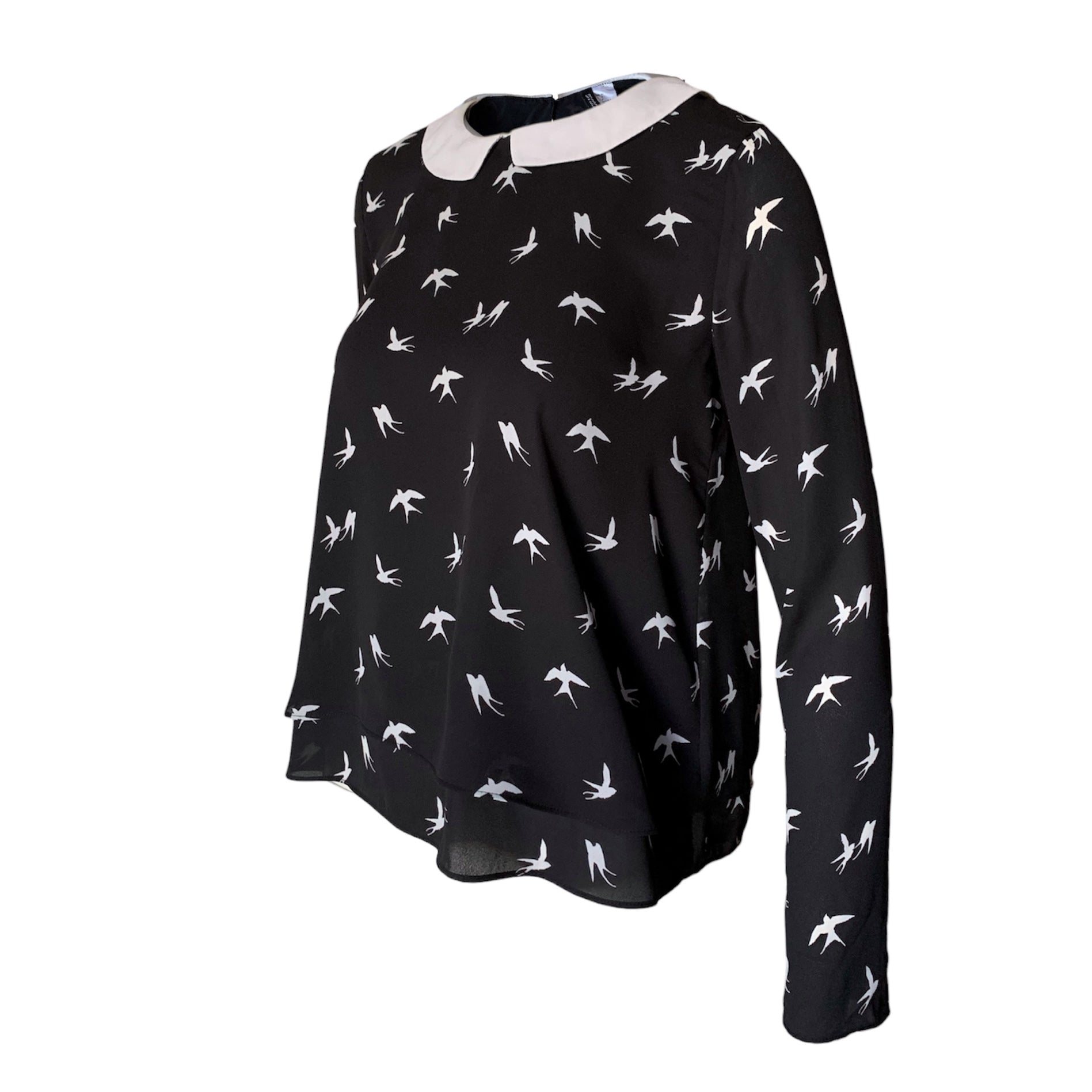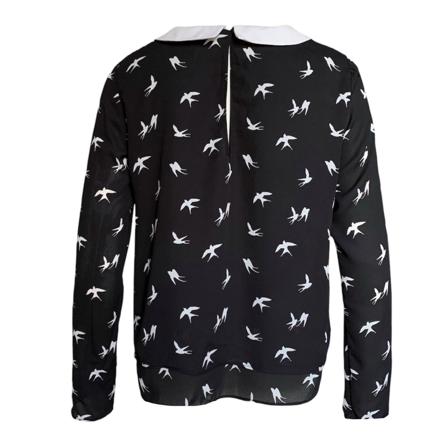 Blusa a doppio strato e maniche lunghe, con colletto bianco a contrasto. Chiusura a goccia posteriore con bottone. Fodera parziale.