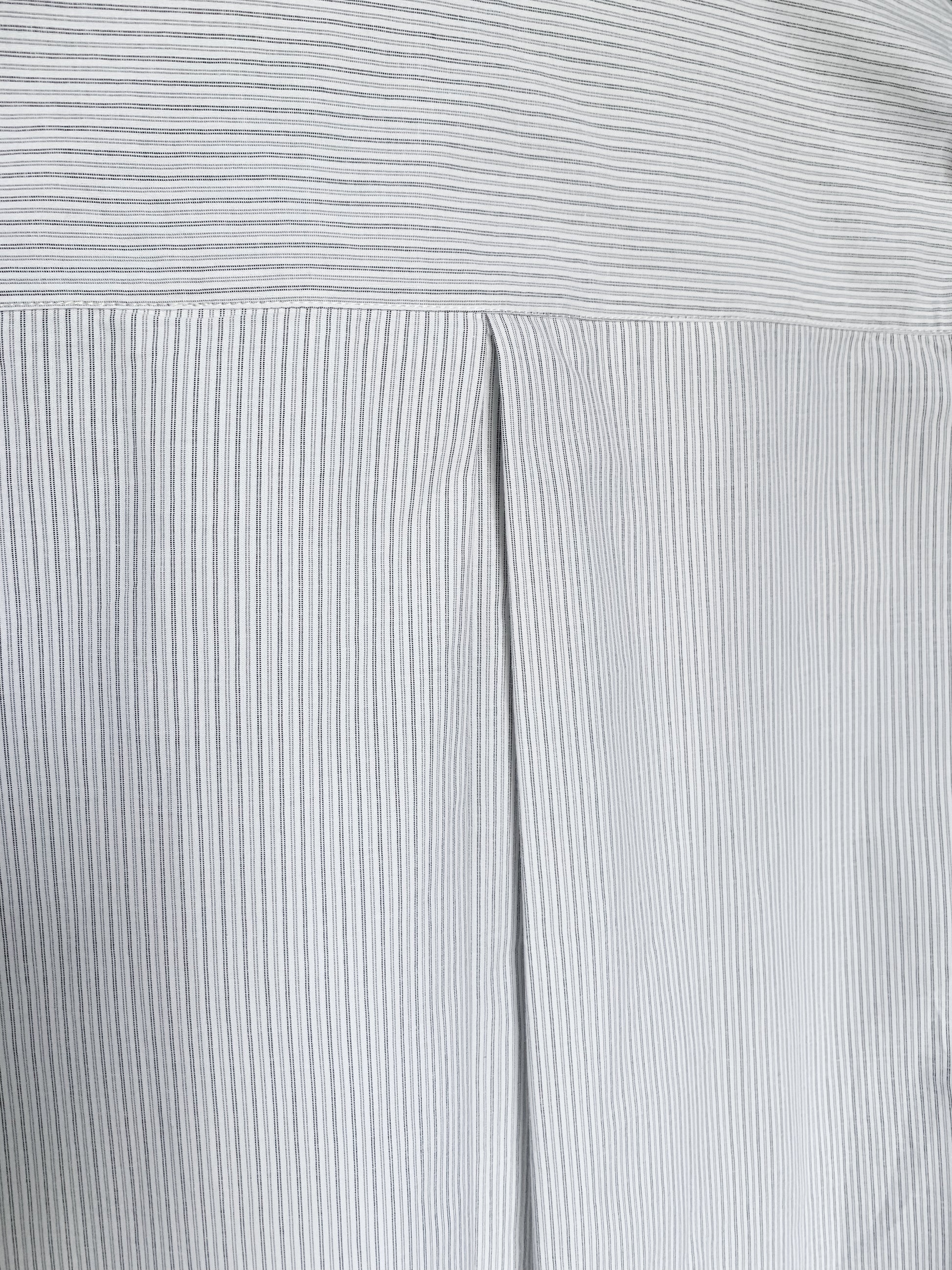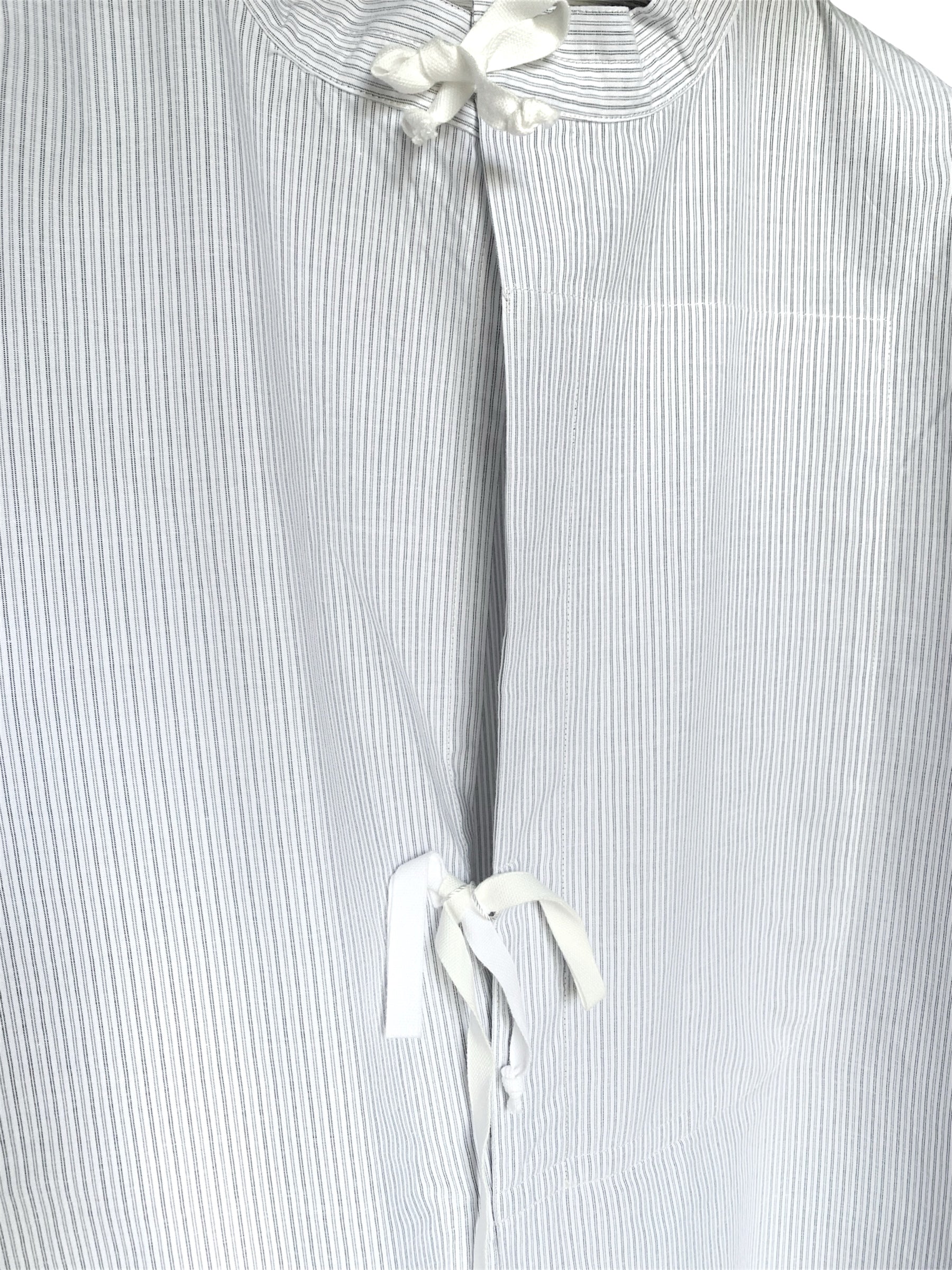 Camicia con pieghe a maniche lunghe e collo alla coreana chiuso da lacci con coulisse, tasche tagliate lateralmente sui fianchi e nascoste da doppia piega, polsino con bottoni.