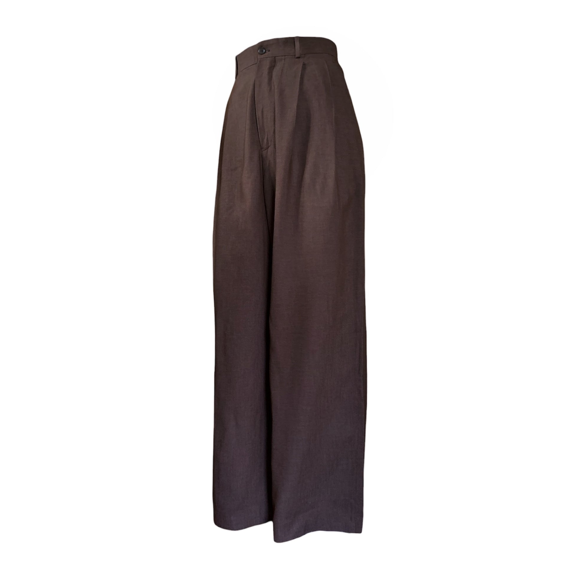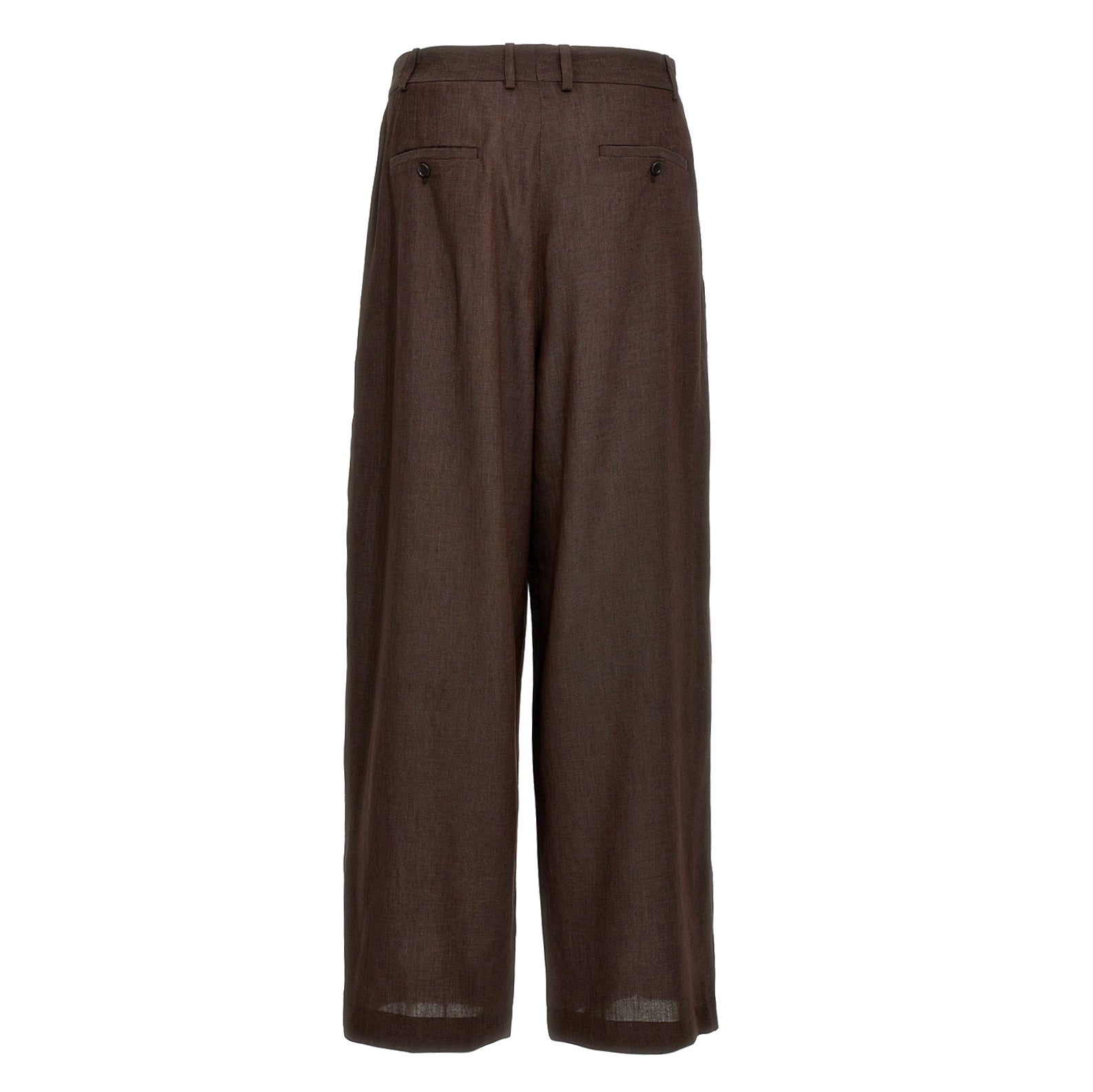 Pantaloni oversize dalla linea allungata in misto lana viscosa dal taglio ampio con pinces davanti in vita, passanti, chiusura frontale con bottoni e zip, due tasche con inserti.
