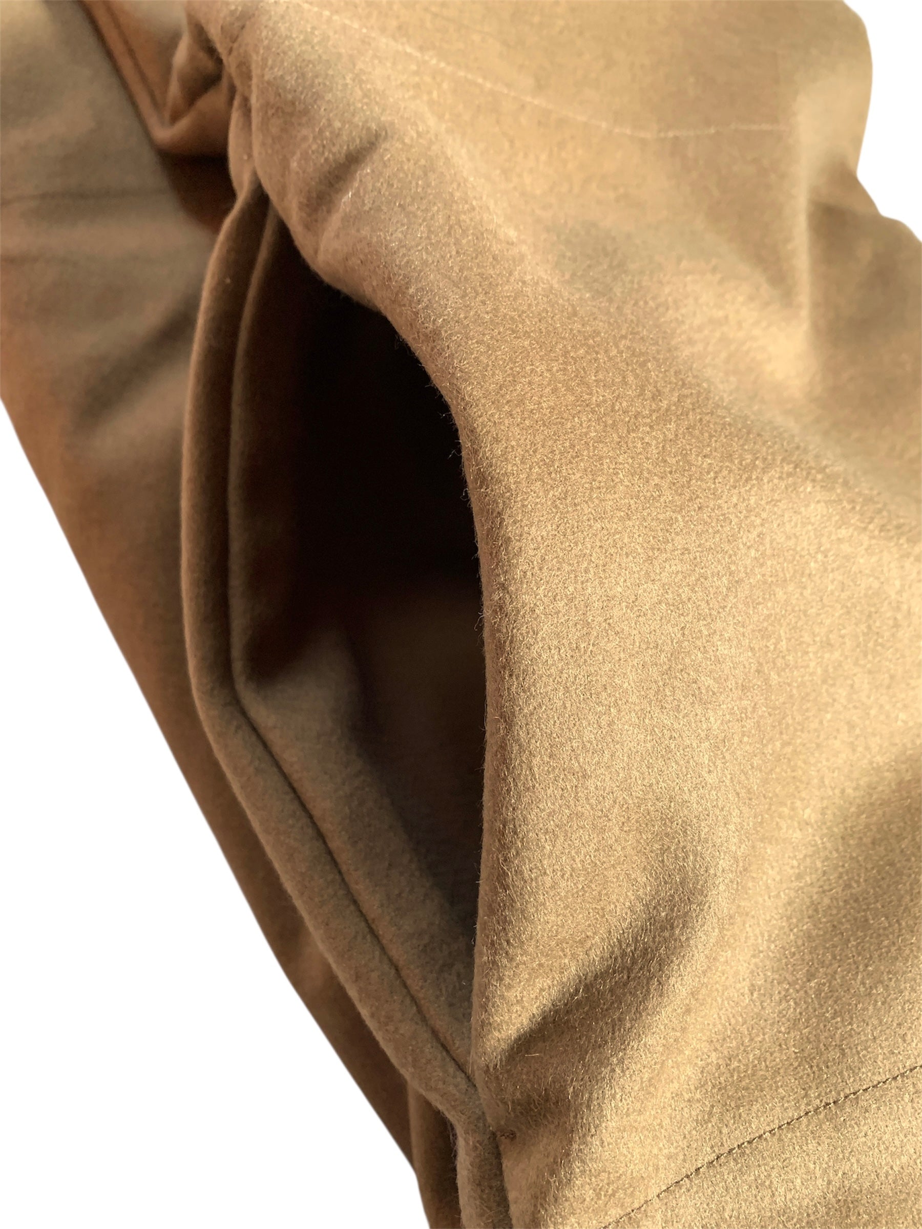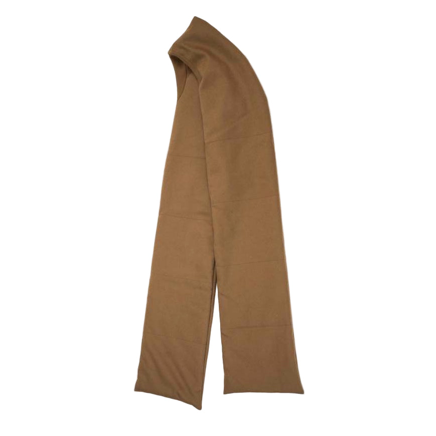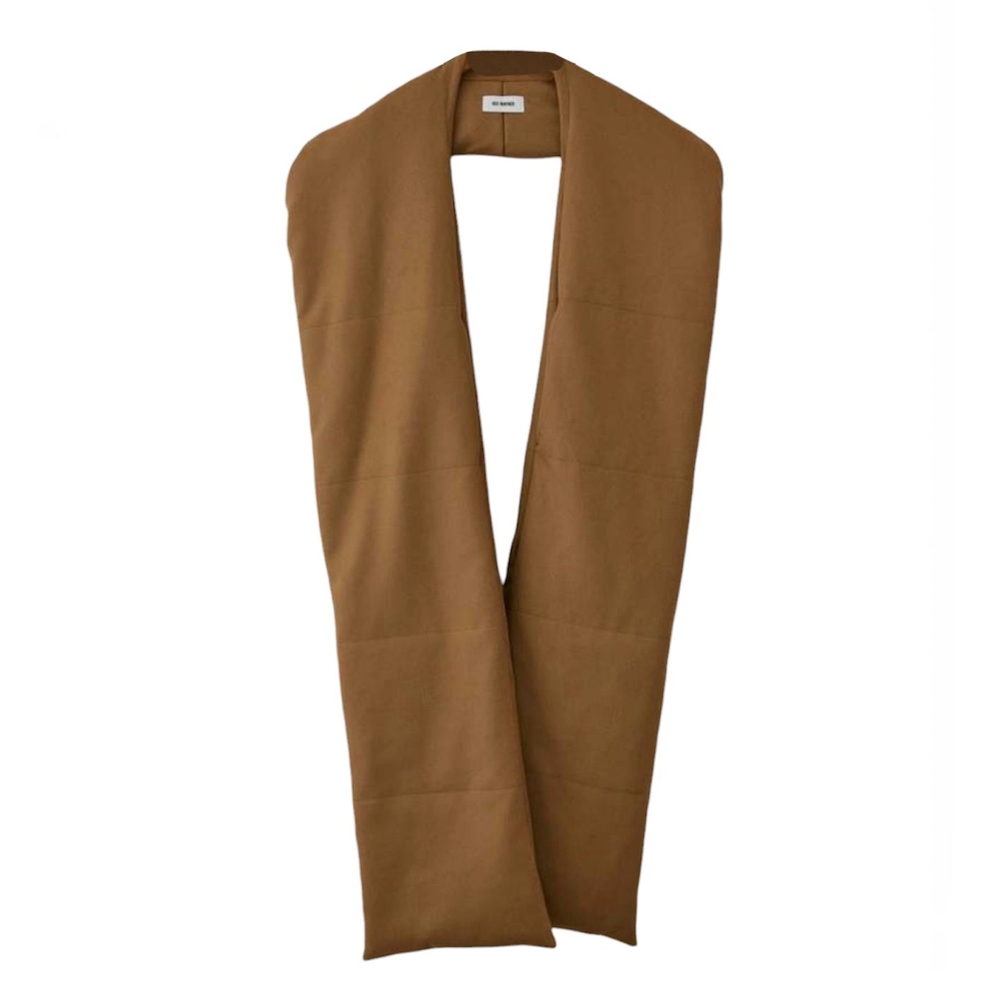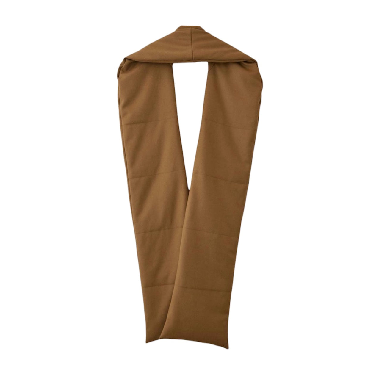 Sciarpa puffer marrone caramello. Presenta due tasche laterali per guanti, chiusura a gancio sulla faccia anteriore e una finitura a coste lungo il colletto posteriore. Può essere in alternativa stile come uno scialle o come un colletto rialzato.