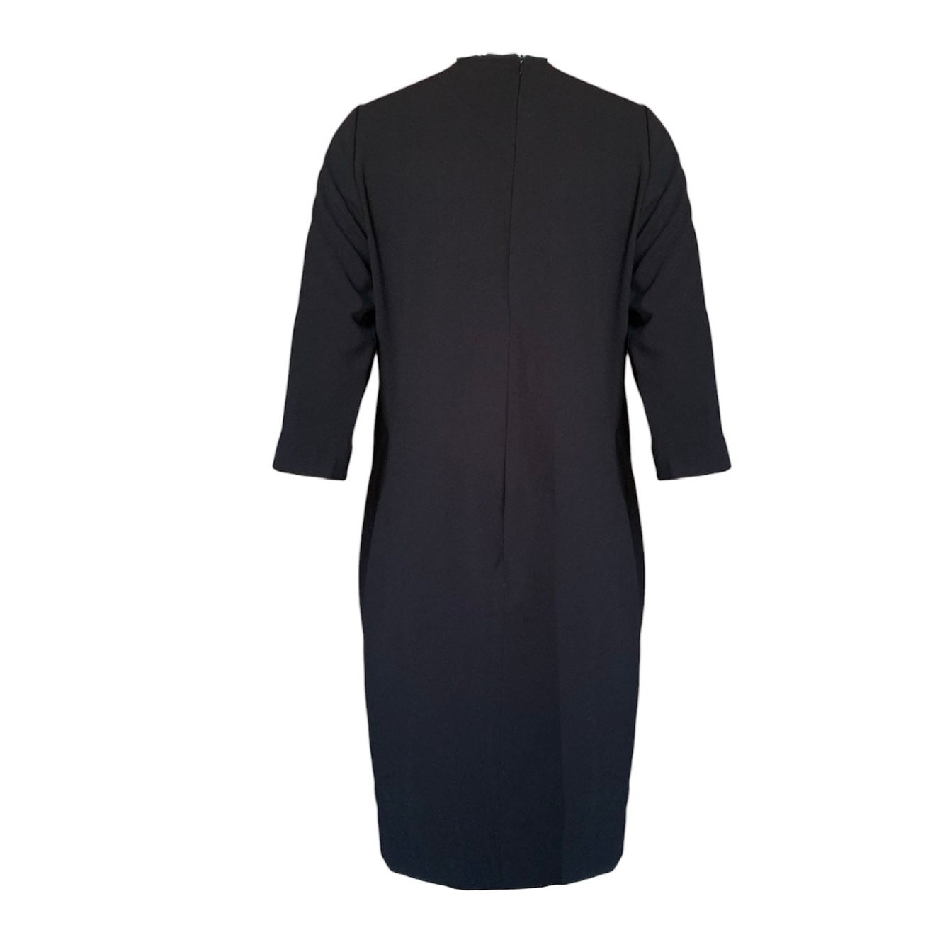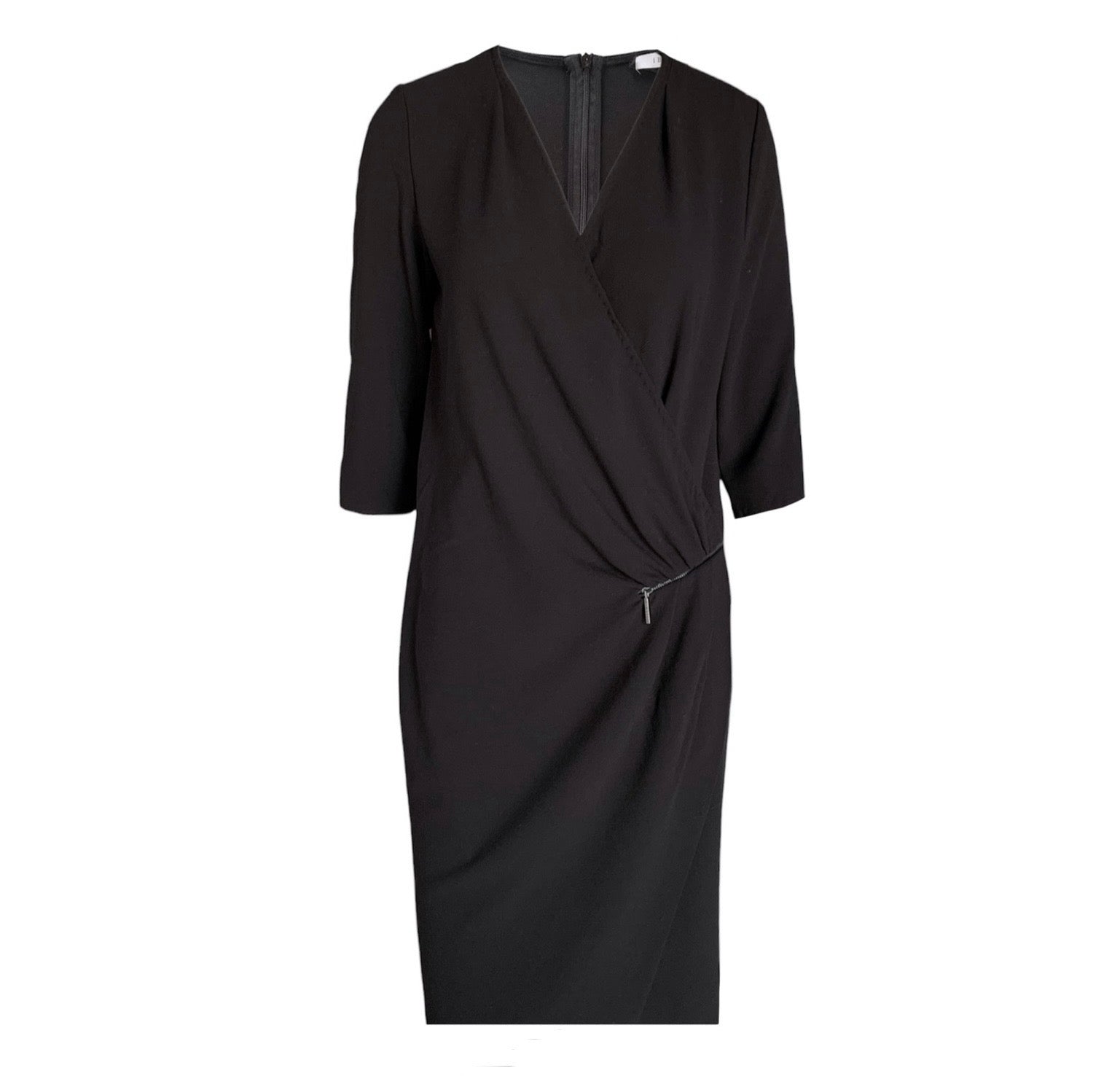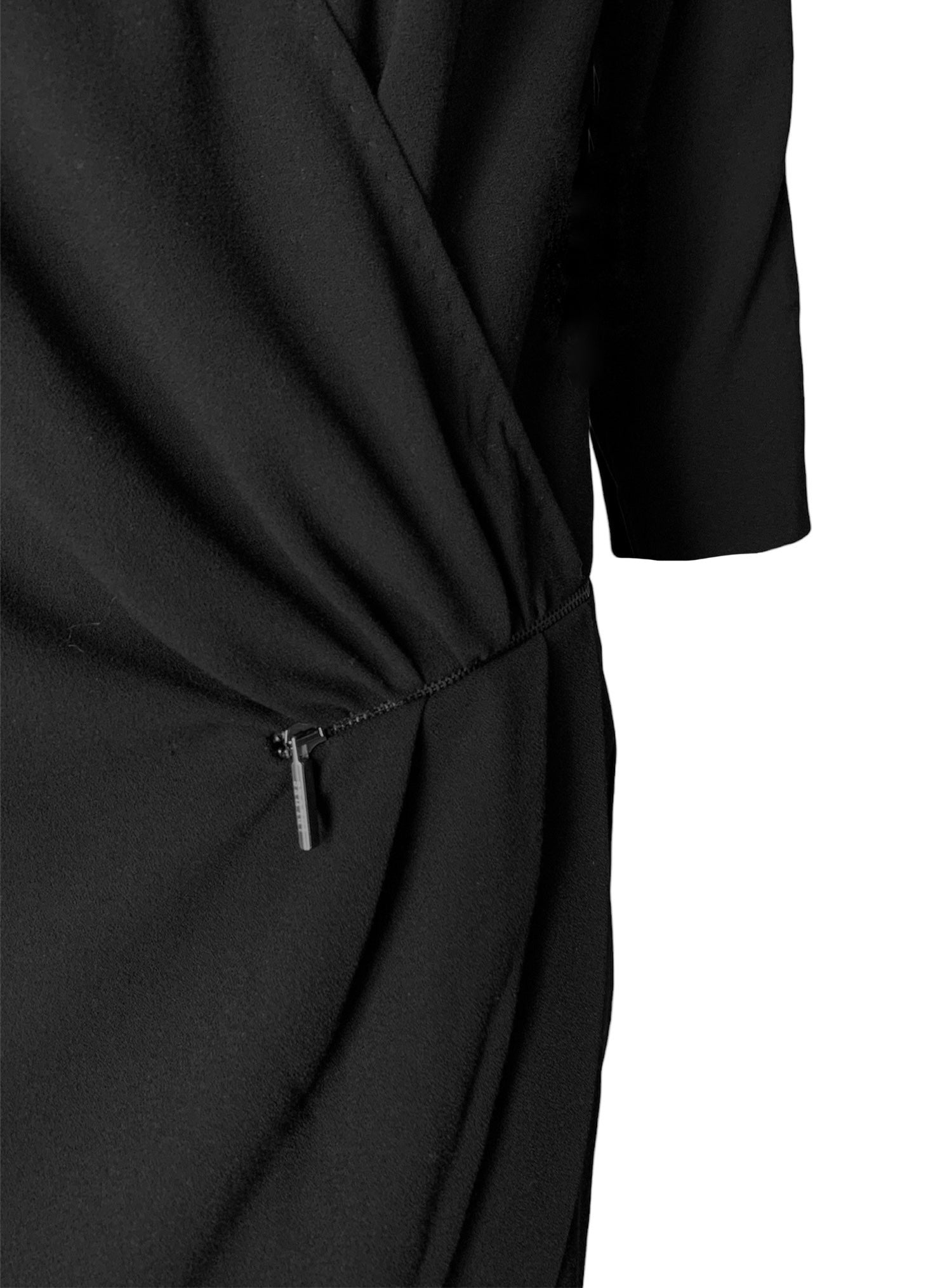 Abito midi con maniche a 3/4 e scollo incrociato a V, cerniera decorativa su un lato con pieghe, zip posteriore.