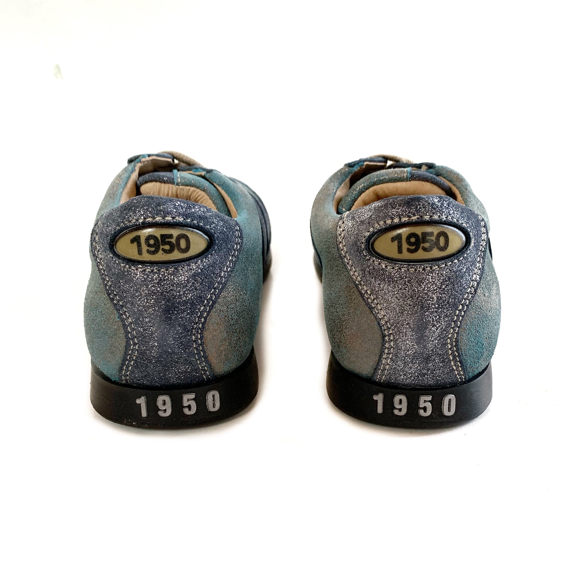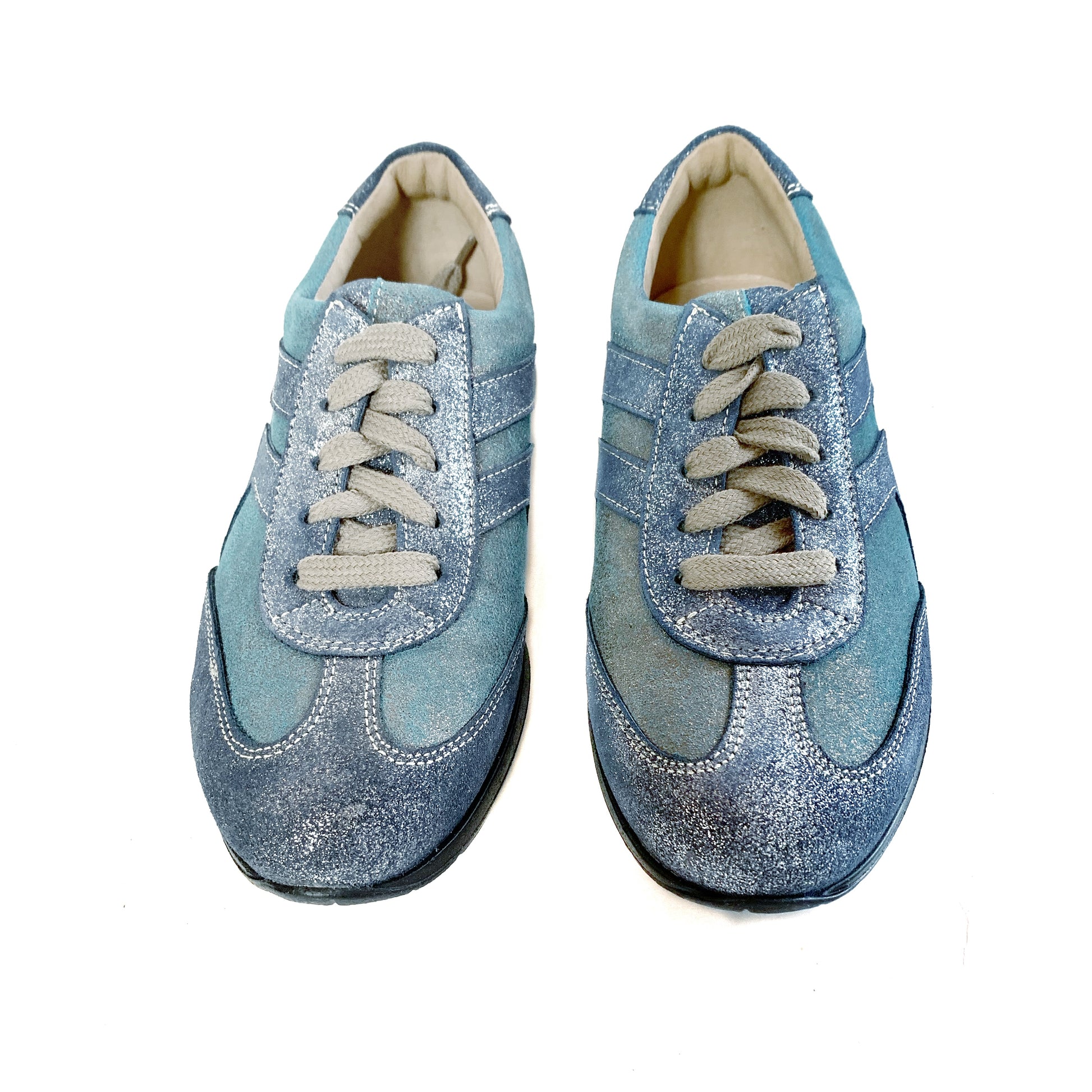 Sneakers in pelle effetto glitterati nei toni dell’azzurro e dell’oro, stringhe, punta tonda. Interno in pelle, suola in gomma.