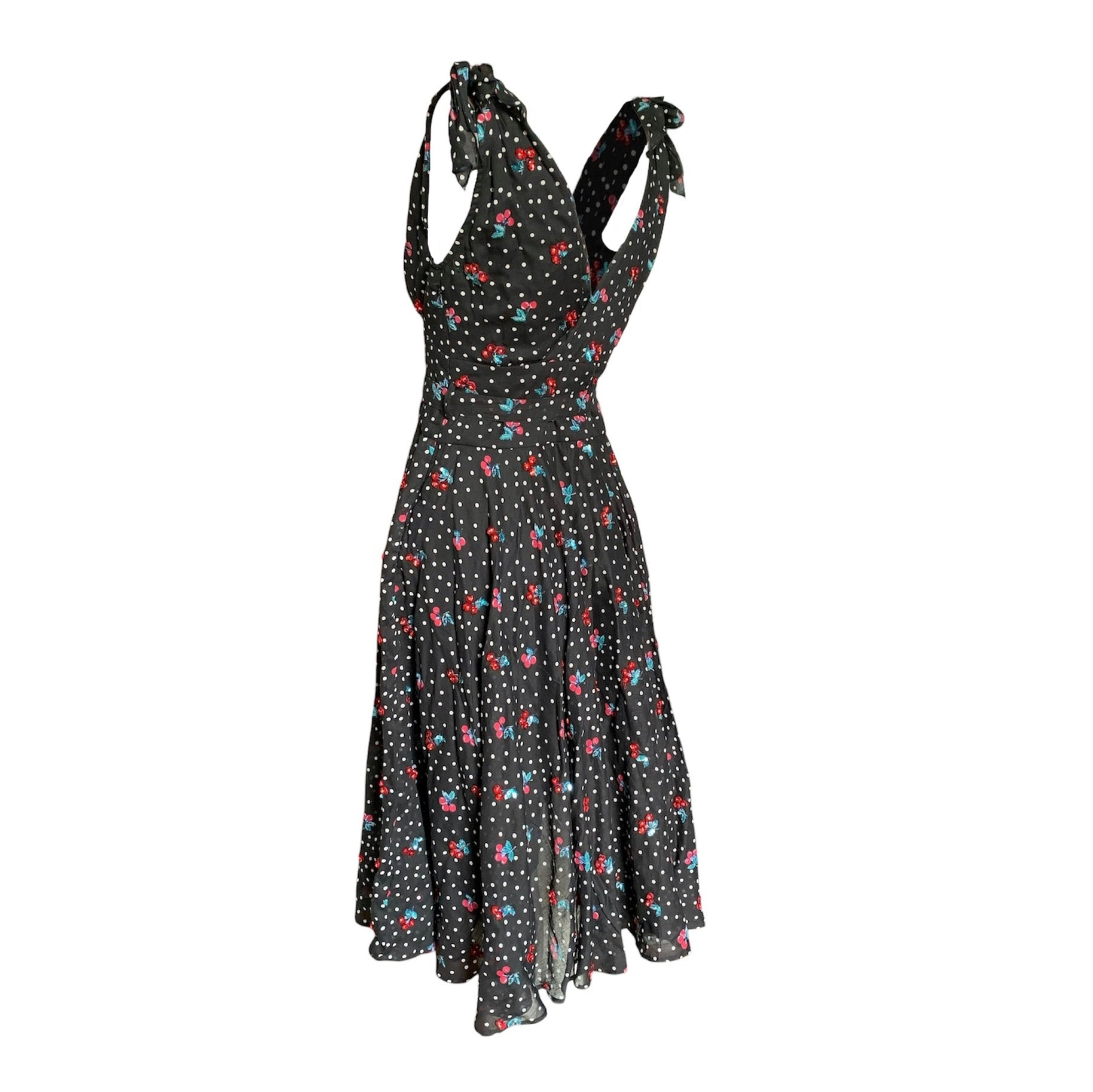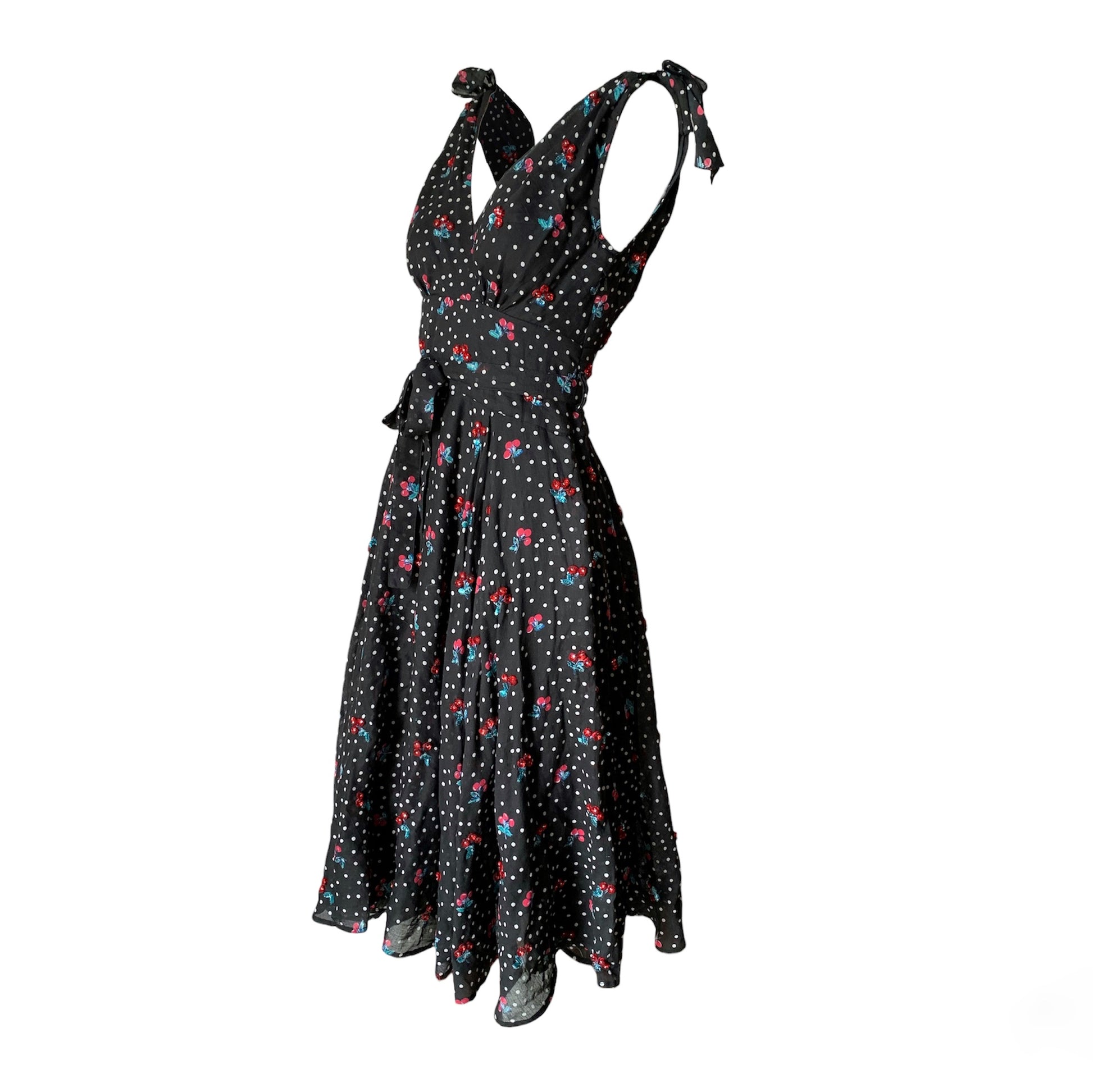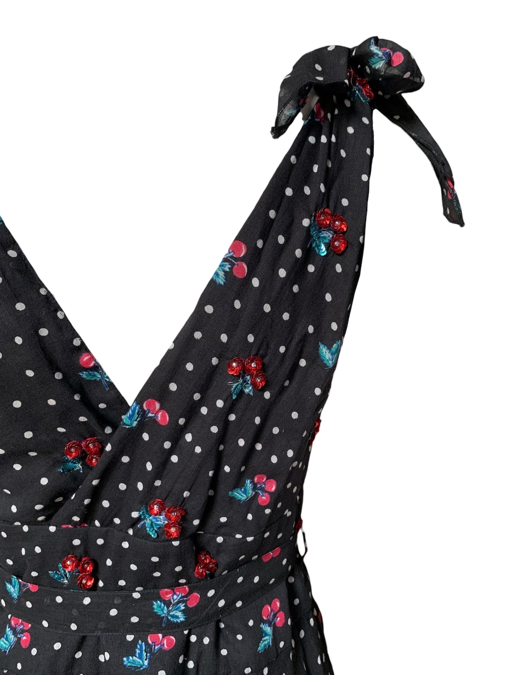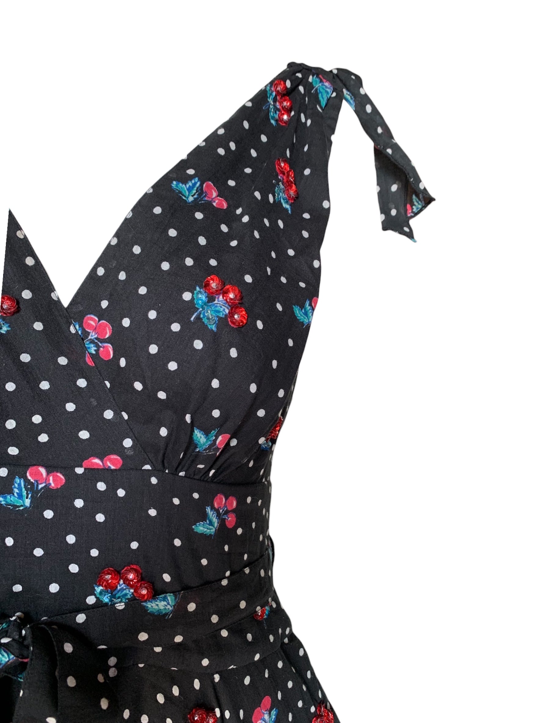 Abito realizzato interamente a mano con ampio scollo a V incrociato ripreso sulla schiena, ampia gonna rotonda, vita con passanti con cintura. Dettagli di fiocchi sulle spalle regolabili. Foderato.