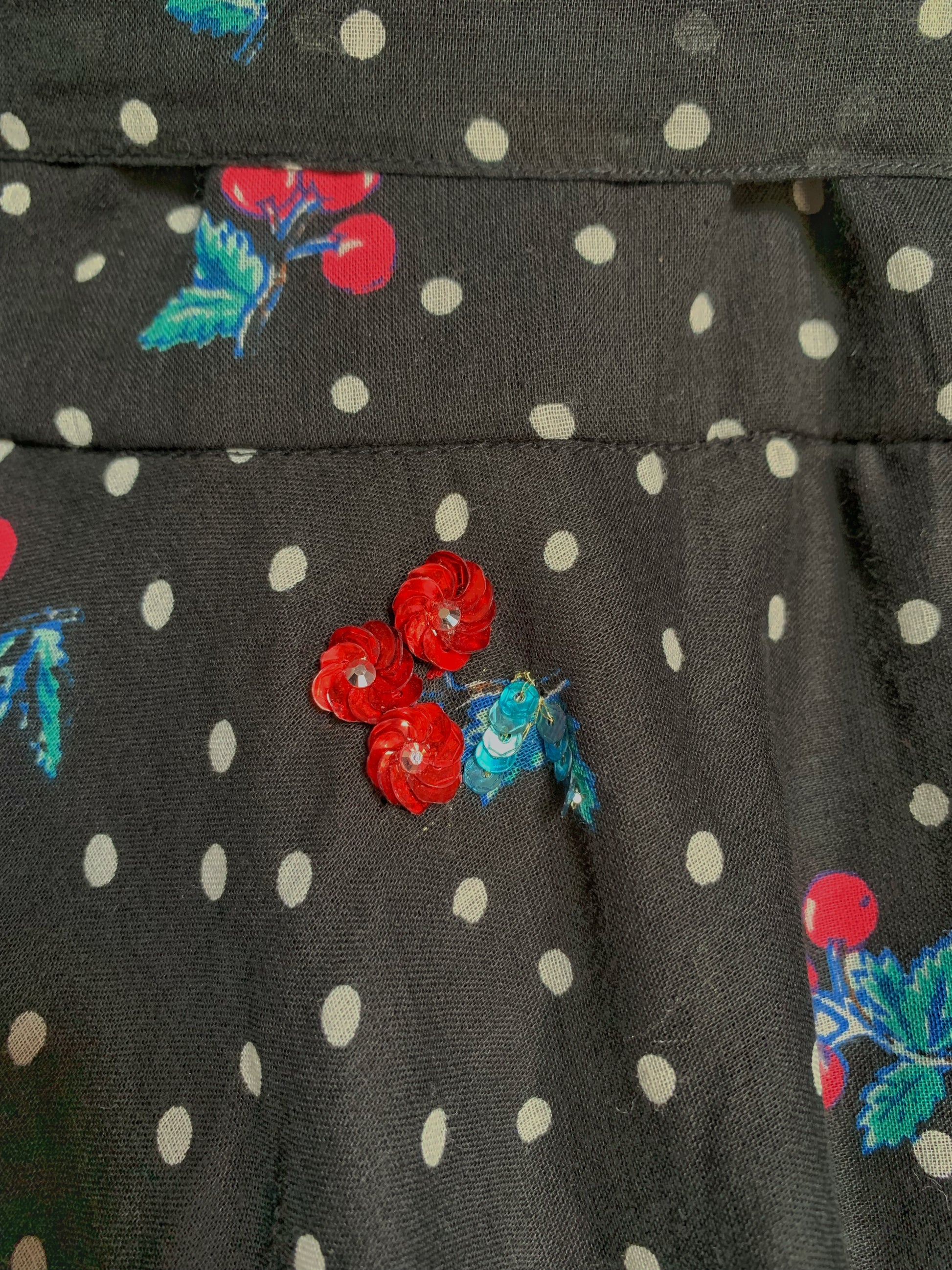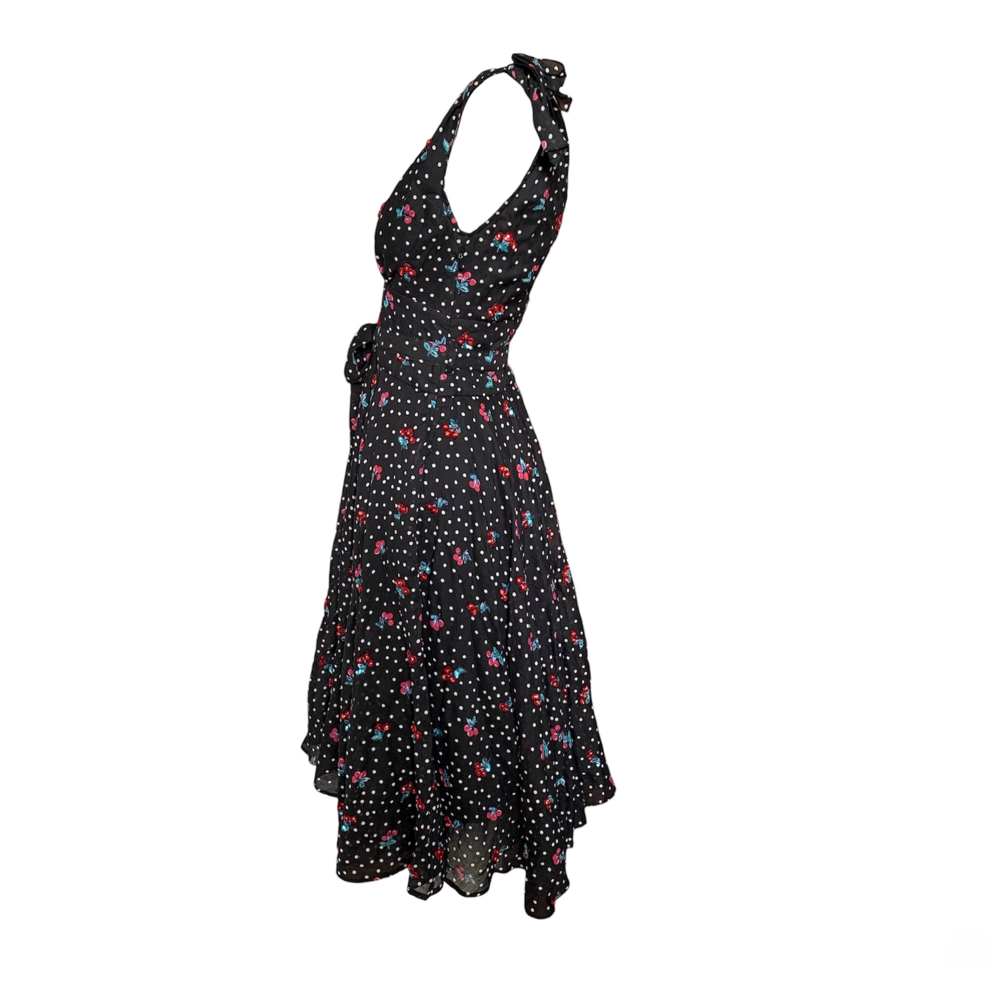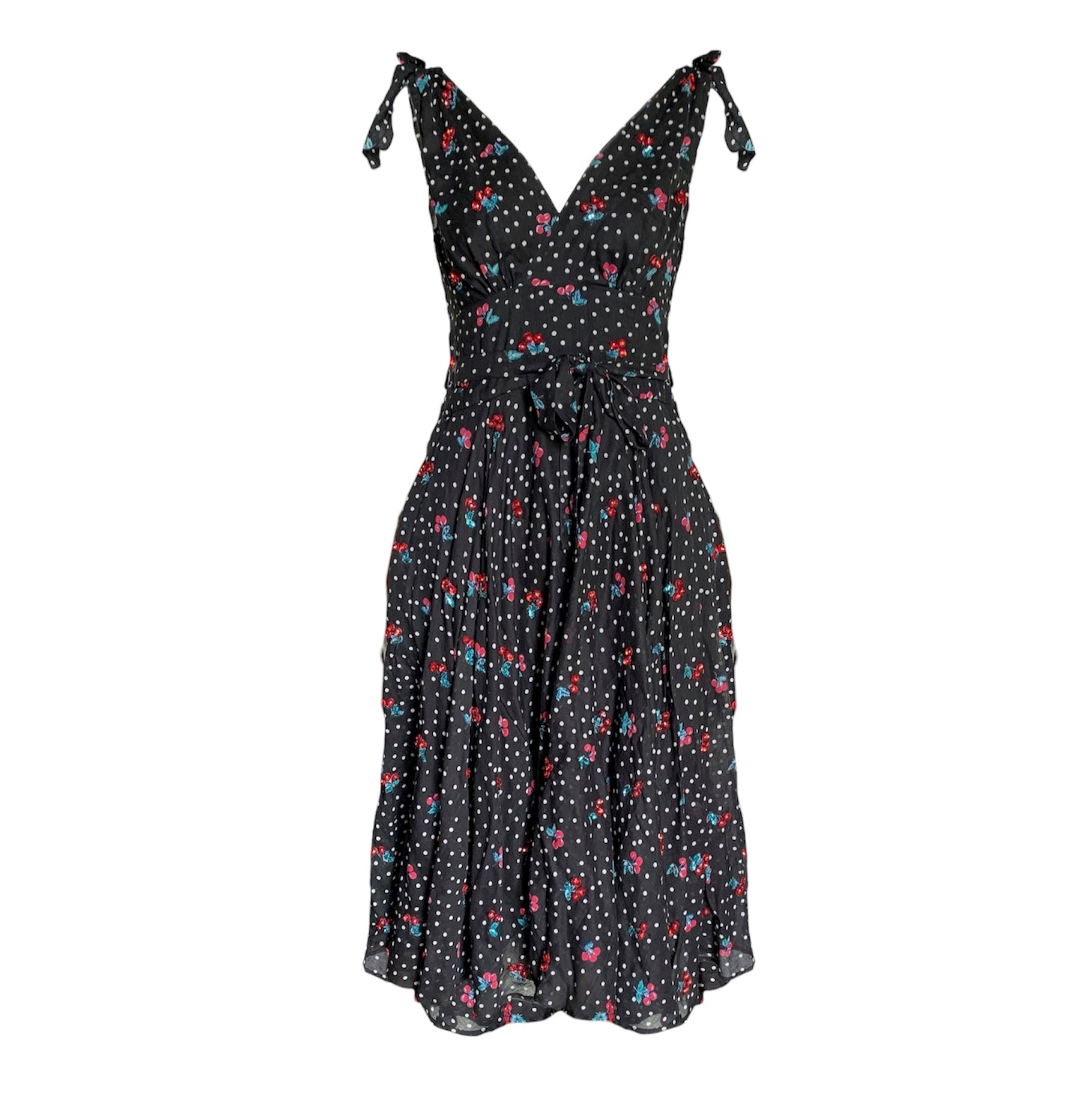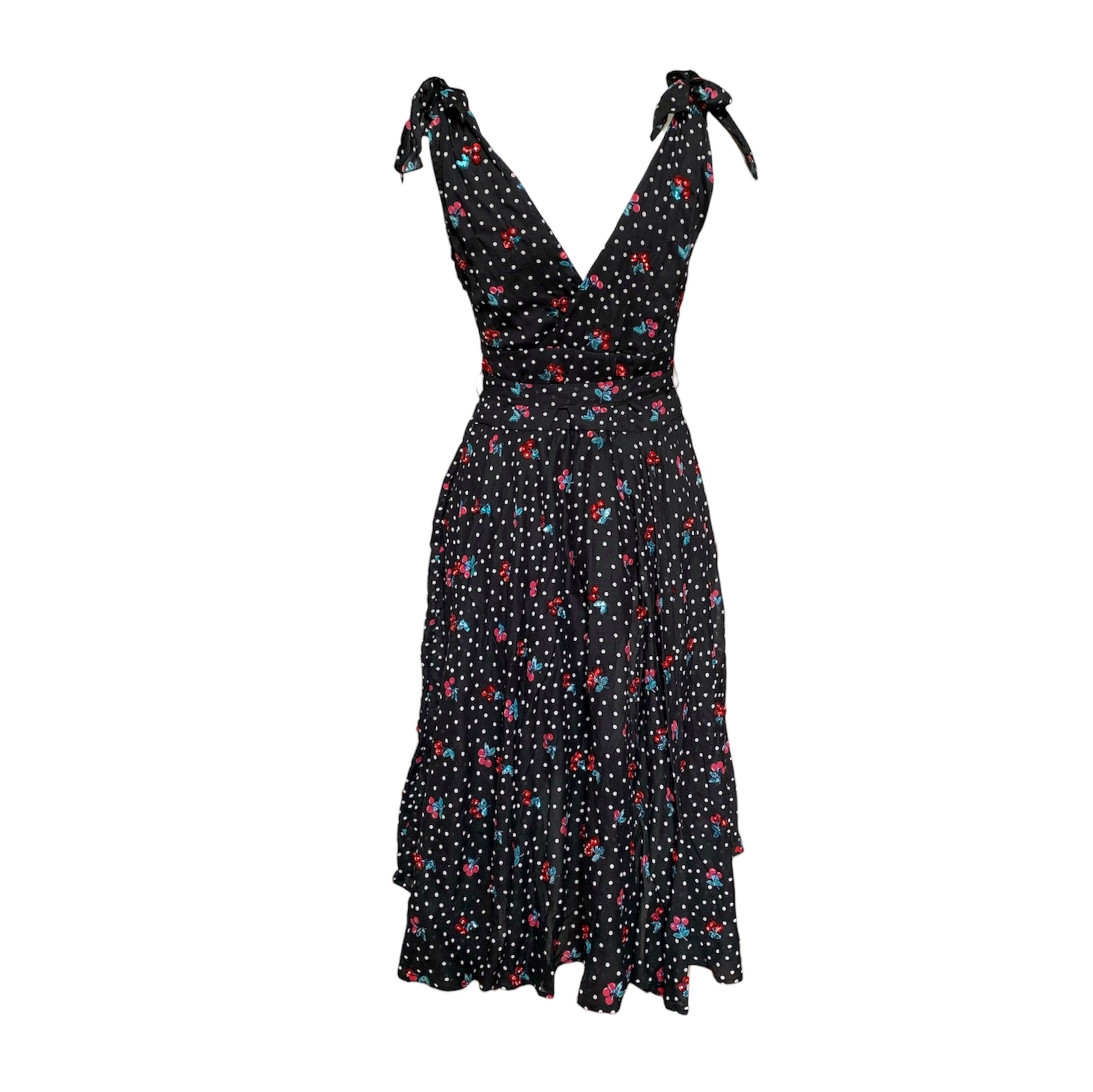 Abito realizzato interamente a mano con ampio scollo a V incrociato ripreso sulla schiena, ampia gonna rotonda, vita con passanti con cintura. Dettagli di fiocchi sulle spalle regolabili. Foderato.