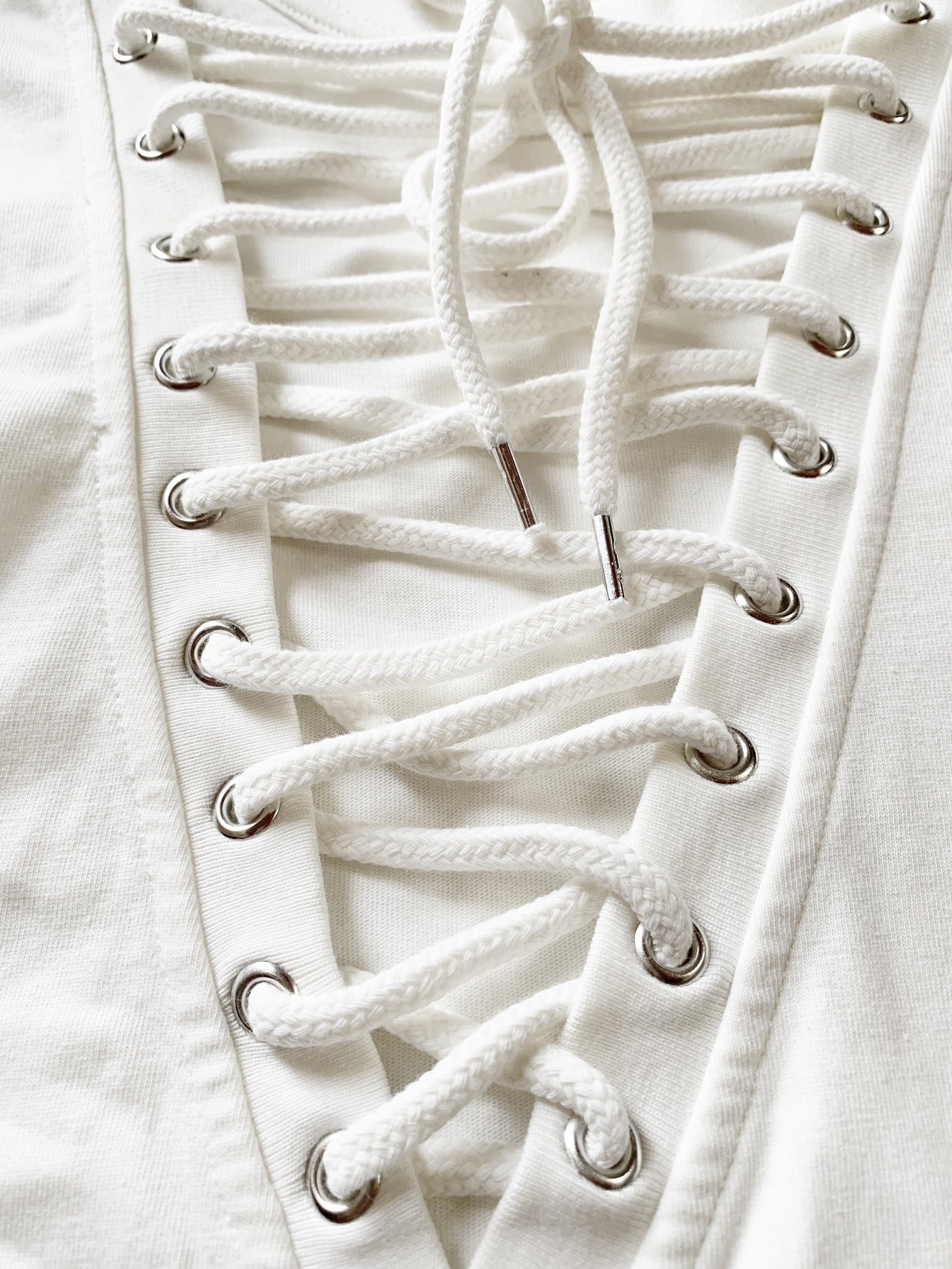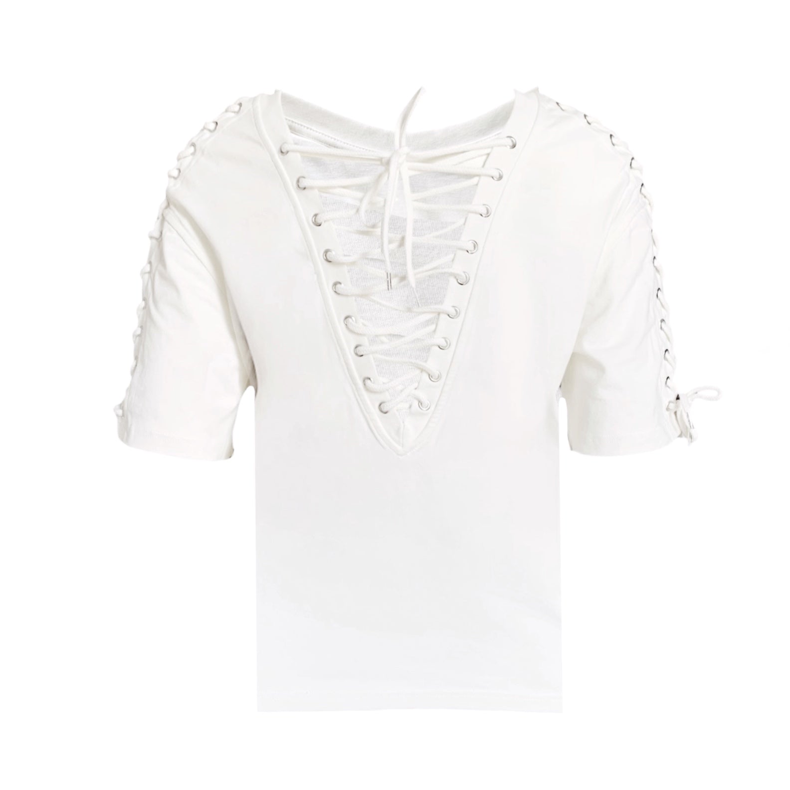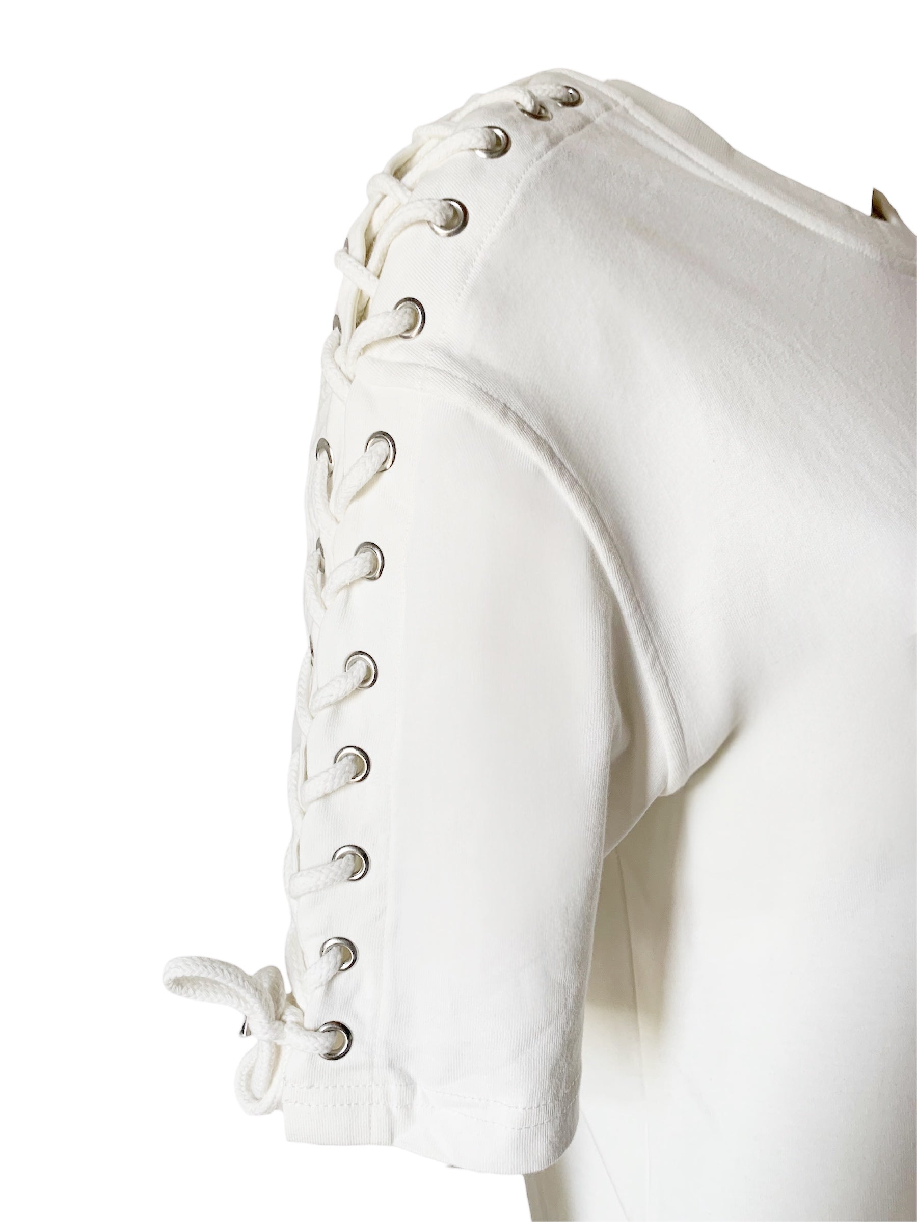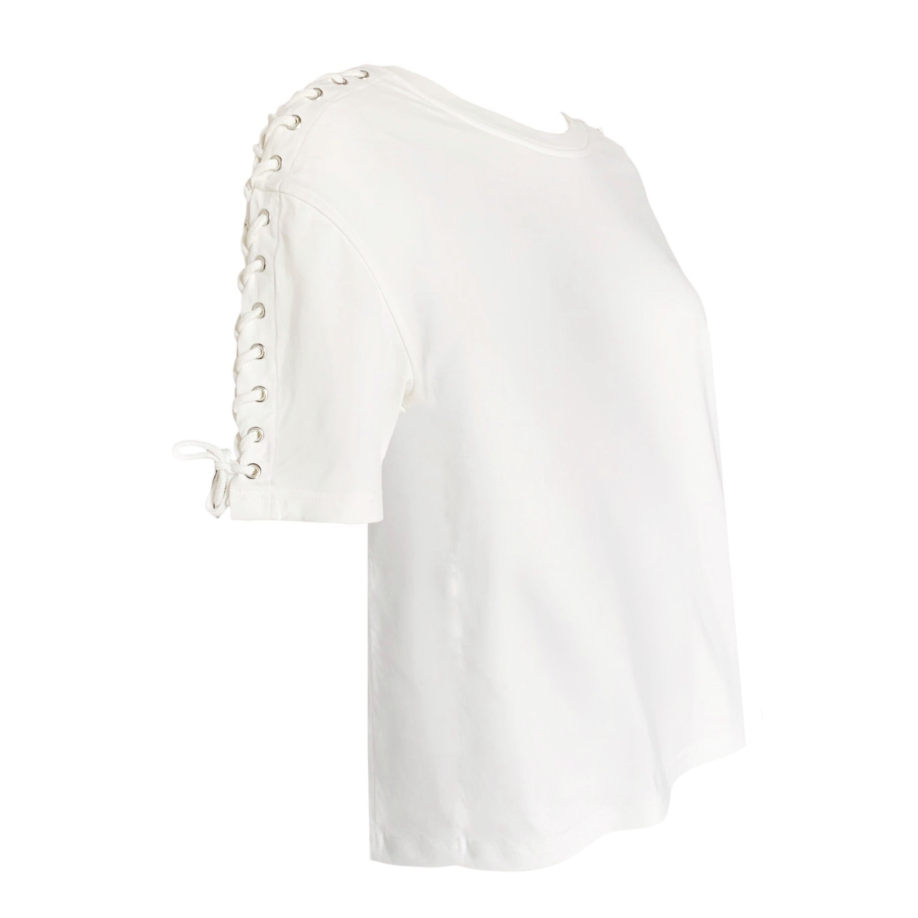 T-shirt a maniche corte e scollo tondo con lacci sulle maniche e sulla schiena. Hardware argento.