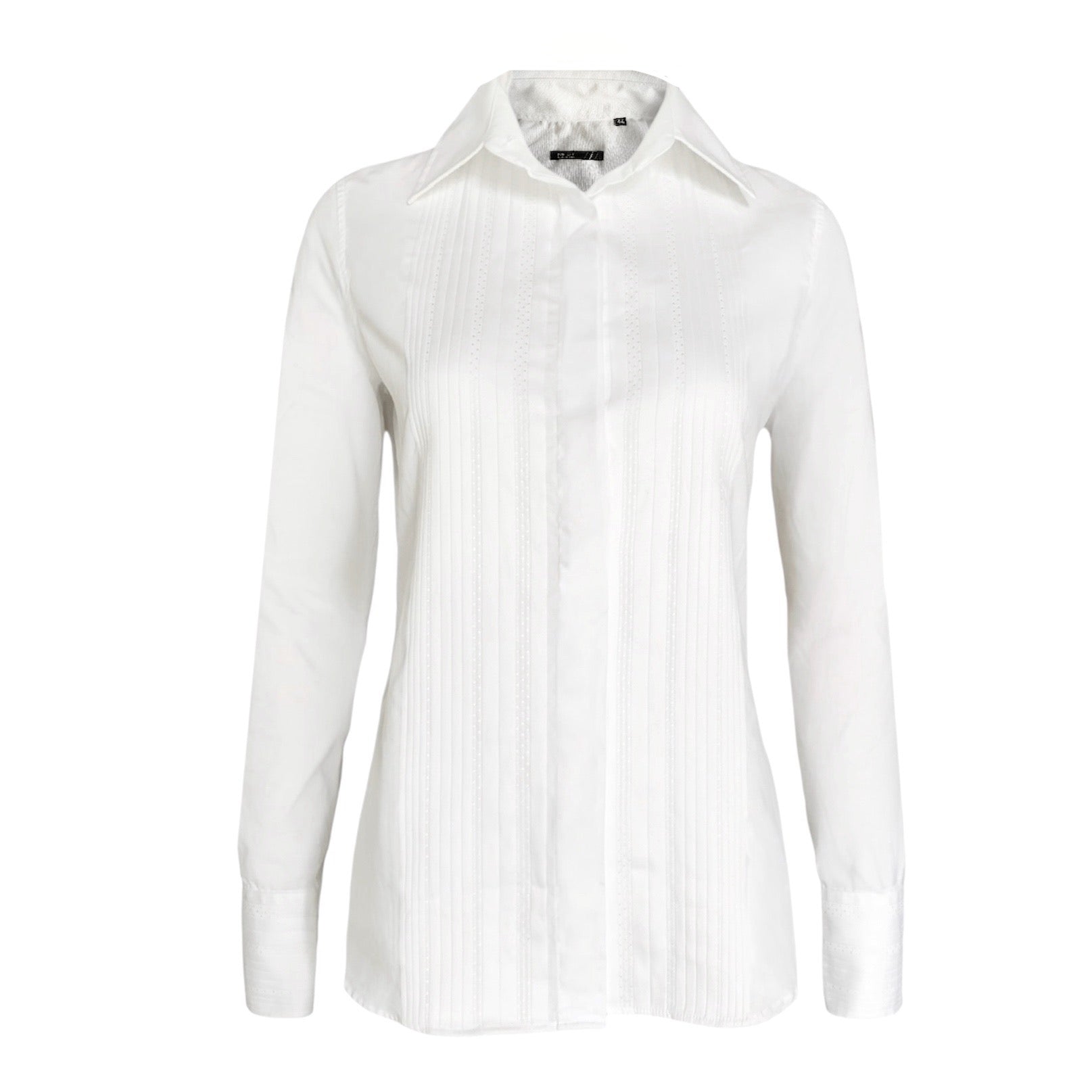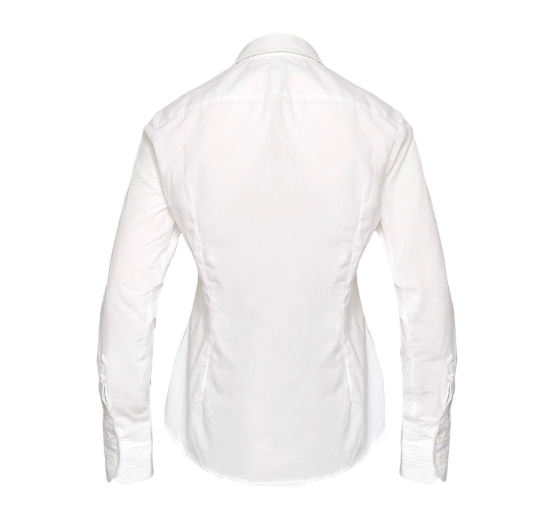 Camicia classica da donna dal taglio sciancrato con orlo tondo, pinces frontali e sul retro, chiusura a bottoni tono su tono, colletto stile classico. Cuciture tono su tono e maniche lunghe chiuse da bottoni sul fondo. Dettaglio di decorazione sul fronte.