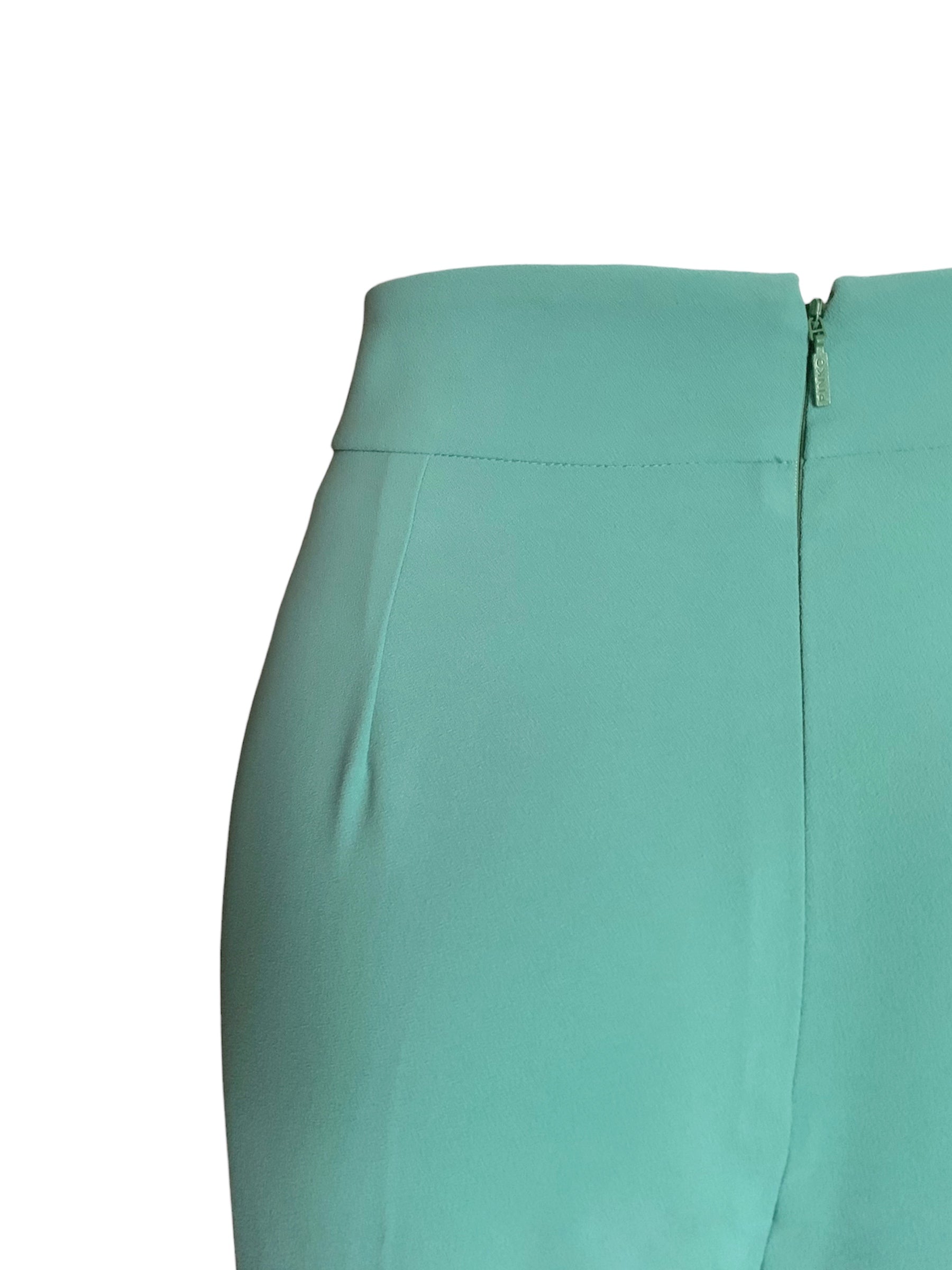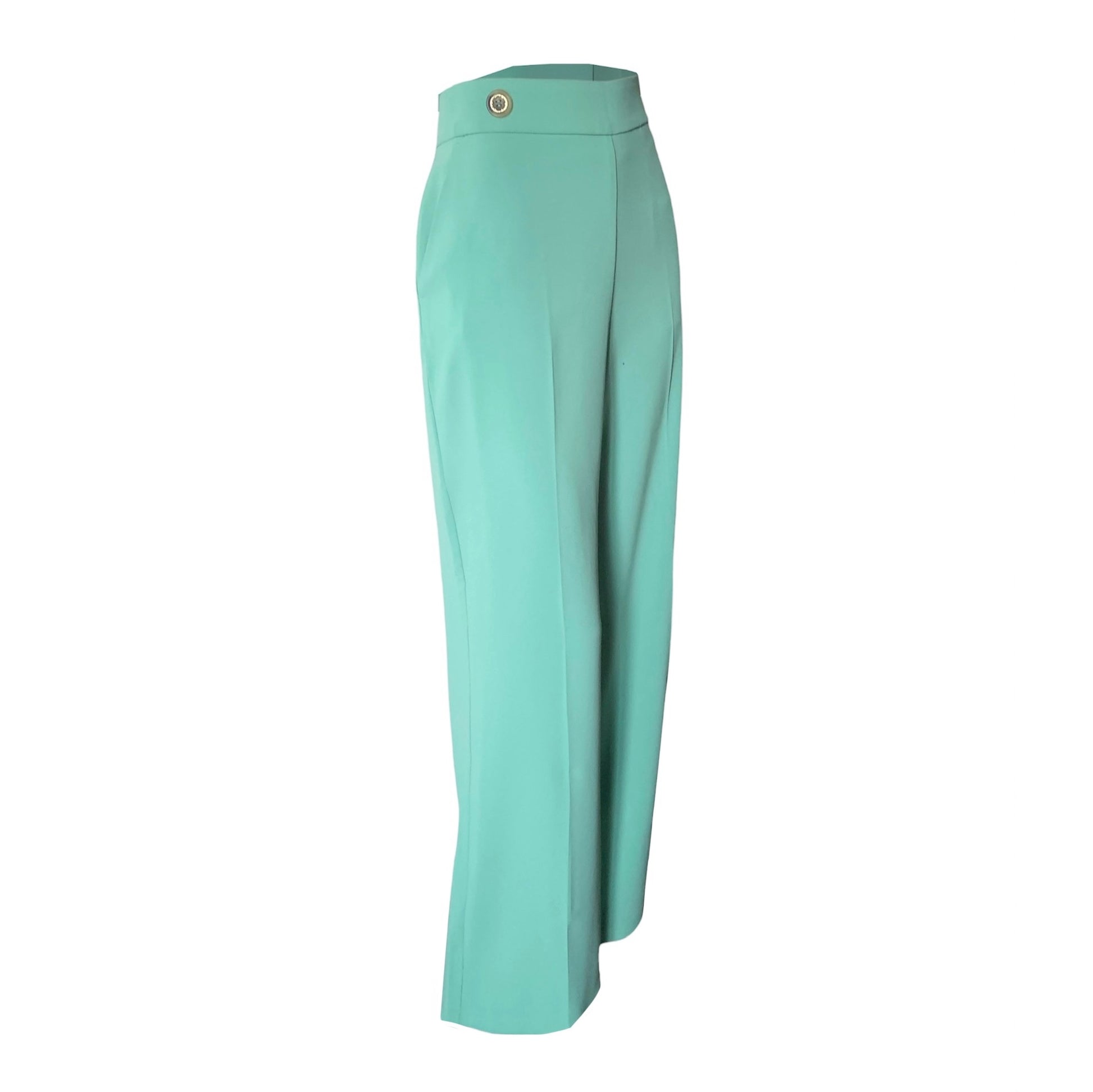 Pantaloni flare-fit in tessuto crêpe stretch con Vita alta e gamba dalla linea svasata con piega centrale. Bottoni decorativi in vita. Chiusura con zip e piccolo gancio.