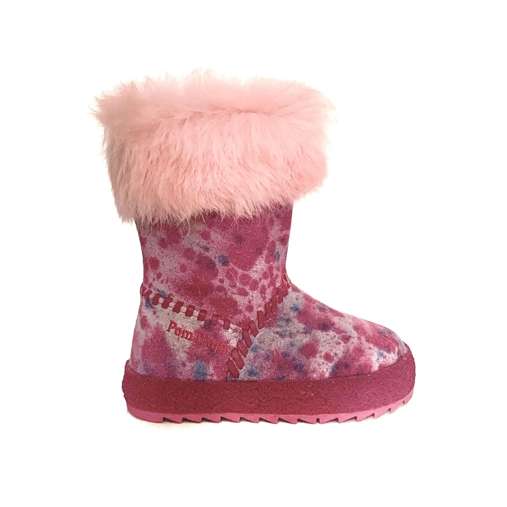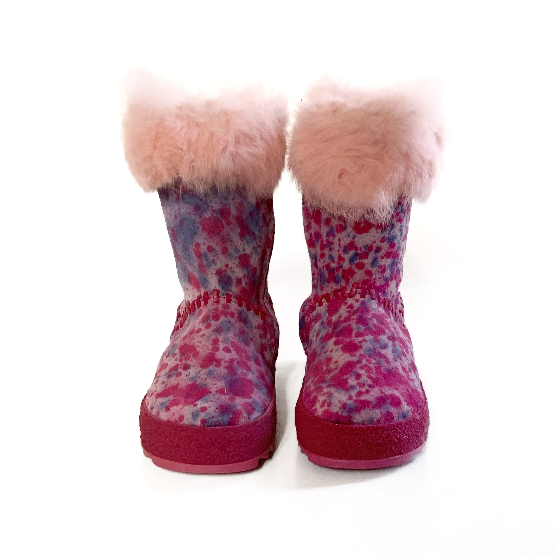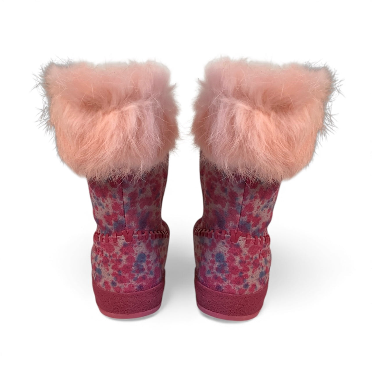 Stivaletti in pelle scamosciata multicolore sui toni del fucsia e decorazione di pelliccia, cuciture tono su tono. Cerniera sul fianco per una più facile allacciatura. Interno in pelle, suola in gomma.