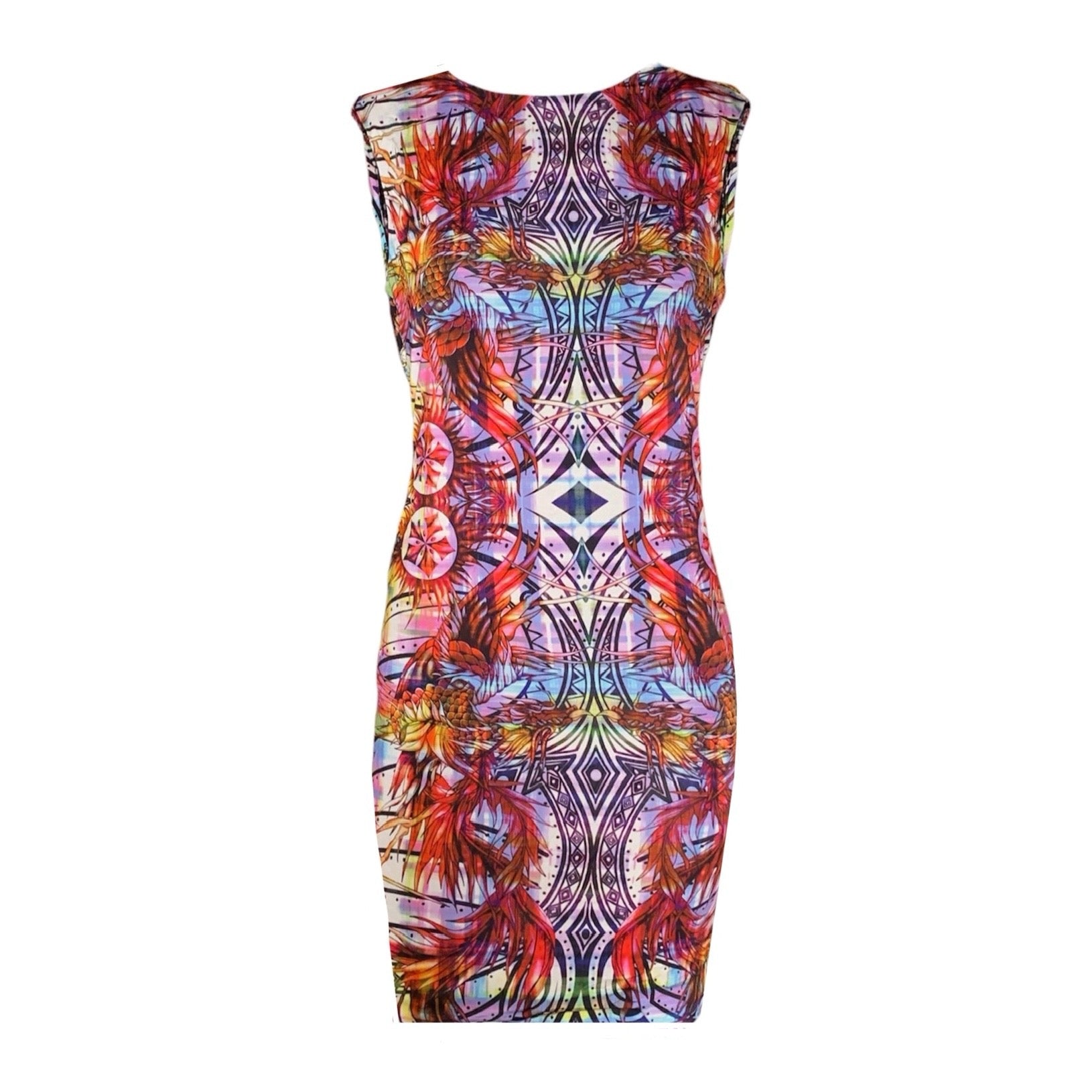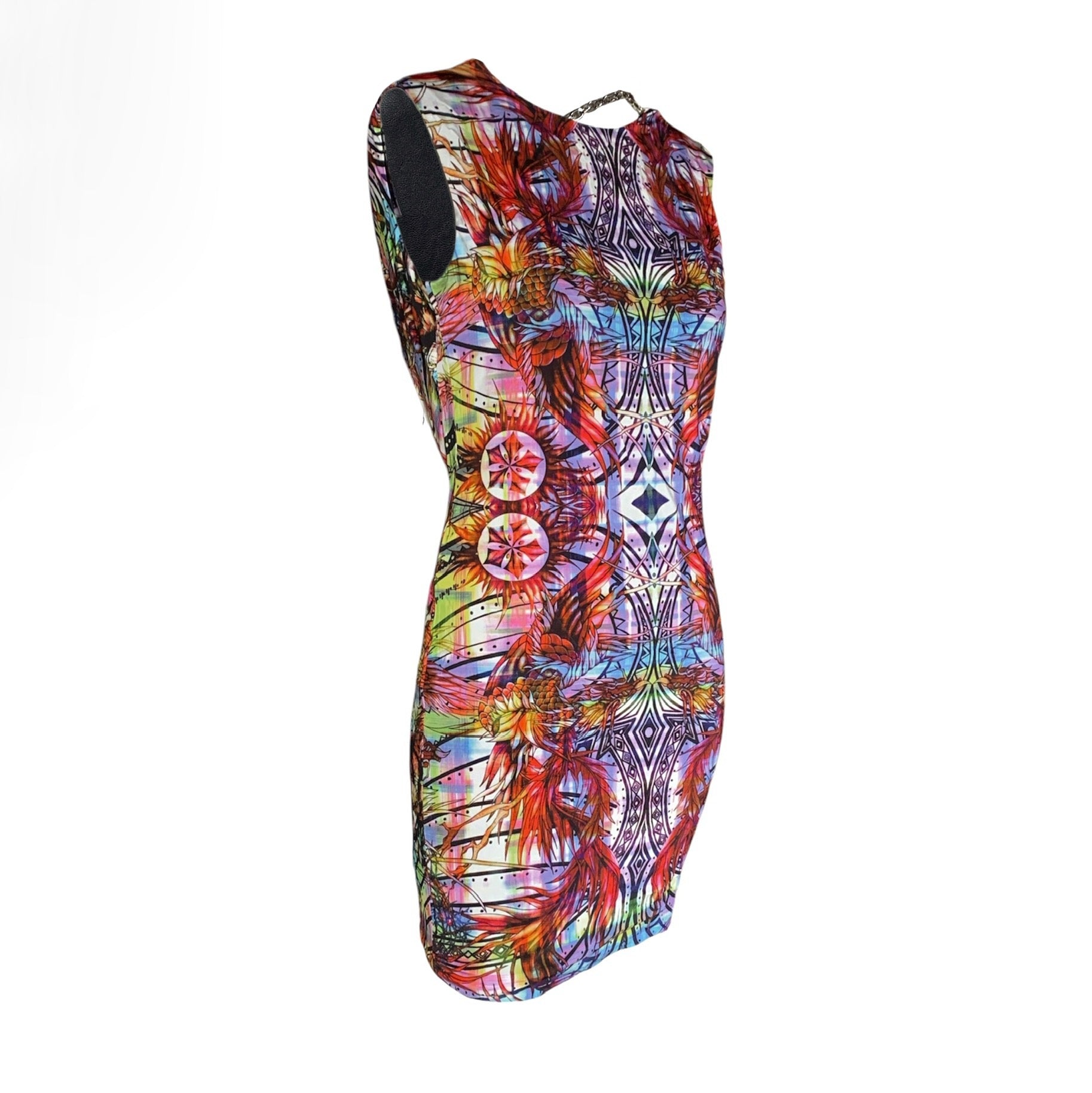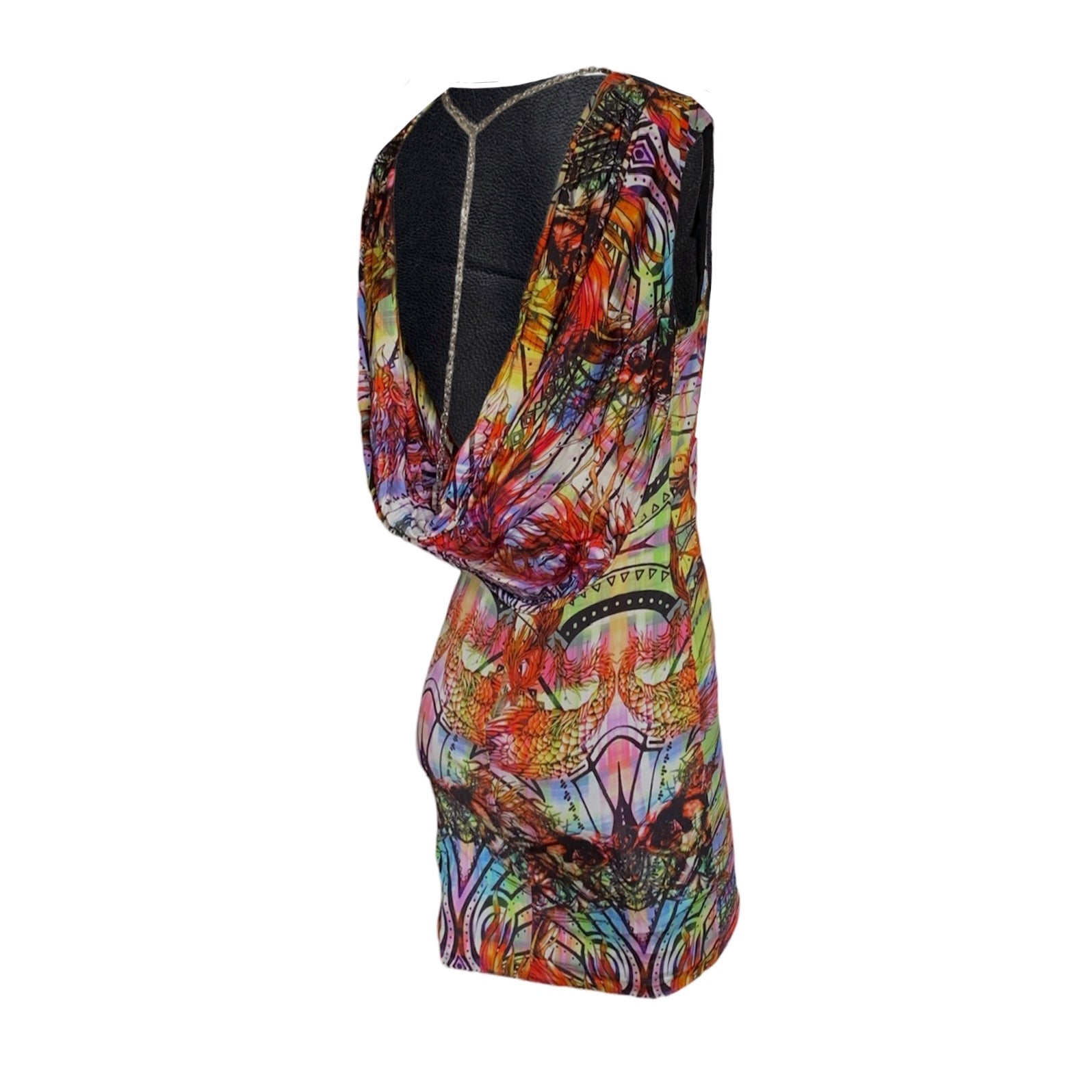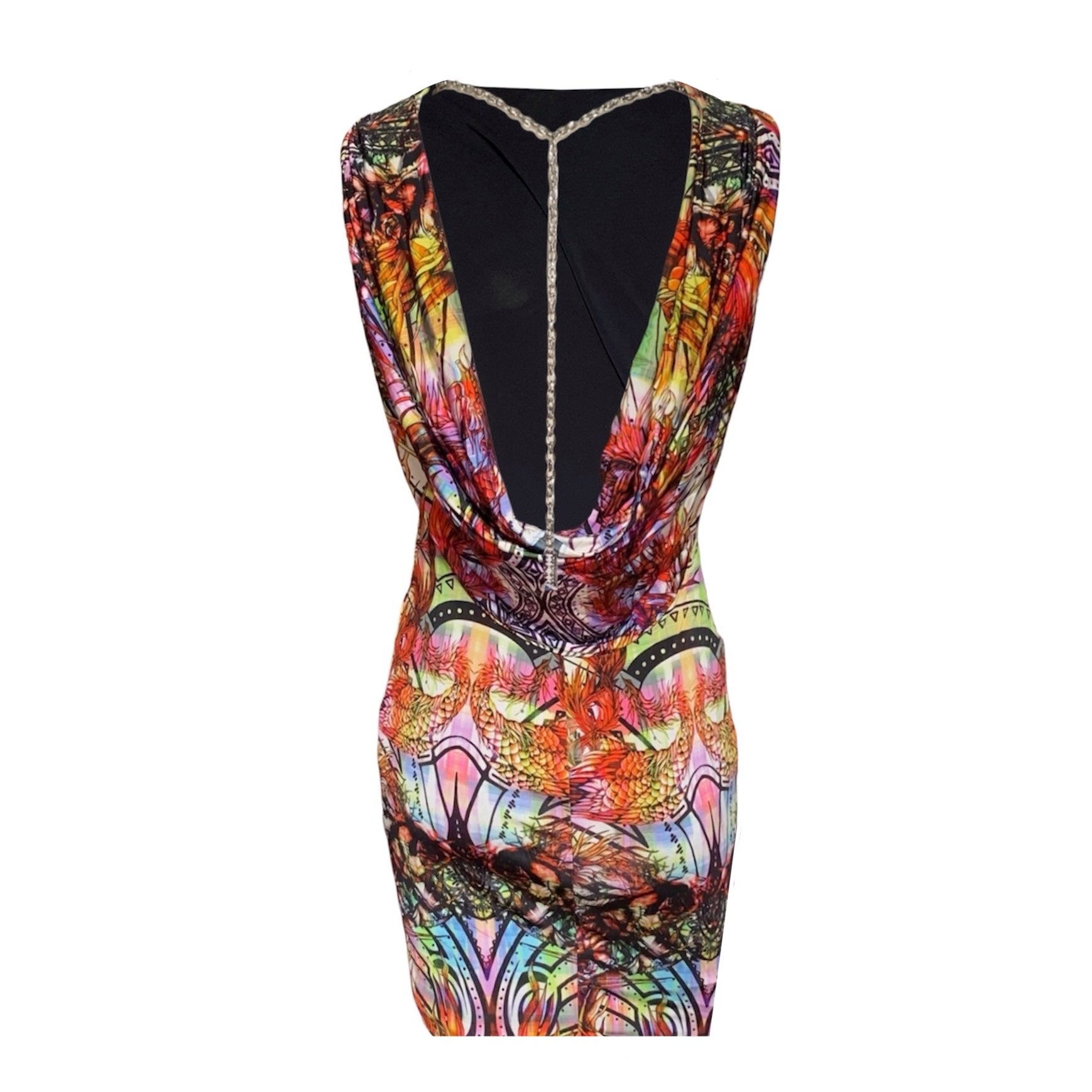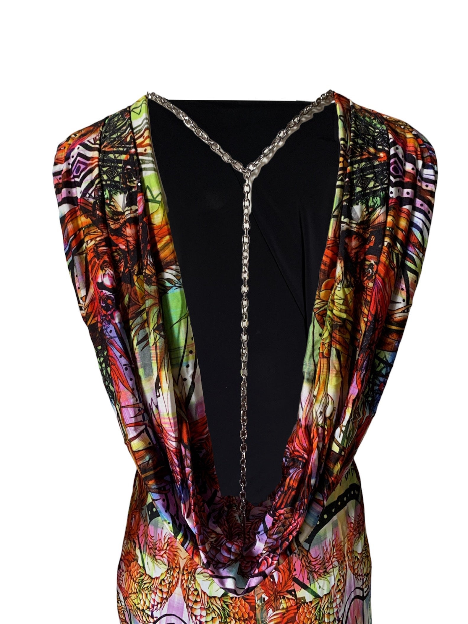 Abito mini dal taglio aderente con ampio scollo sciallato sul retro arricchito da una catena hardware argento. Girocollo, senza maniche. Foderato.