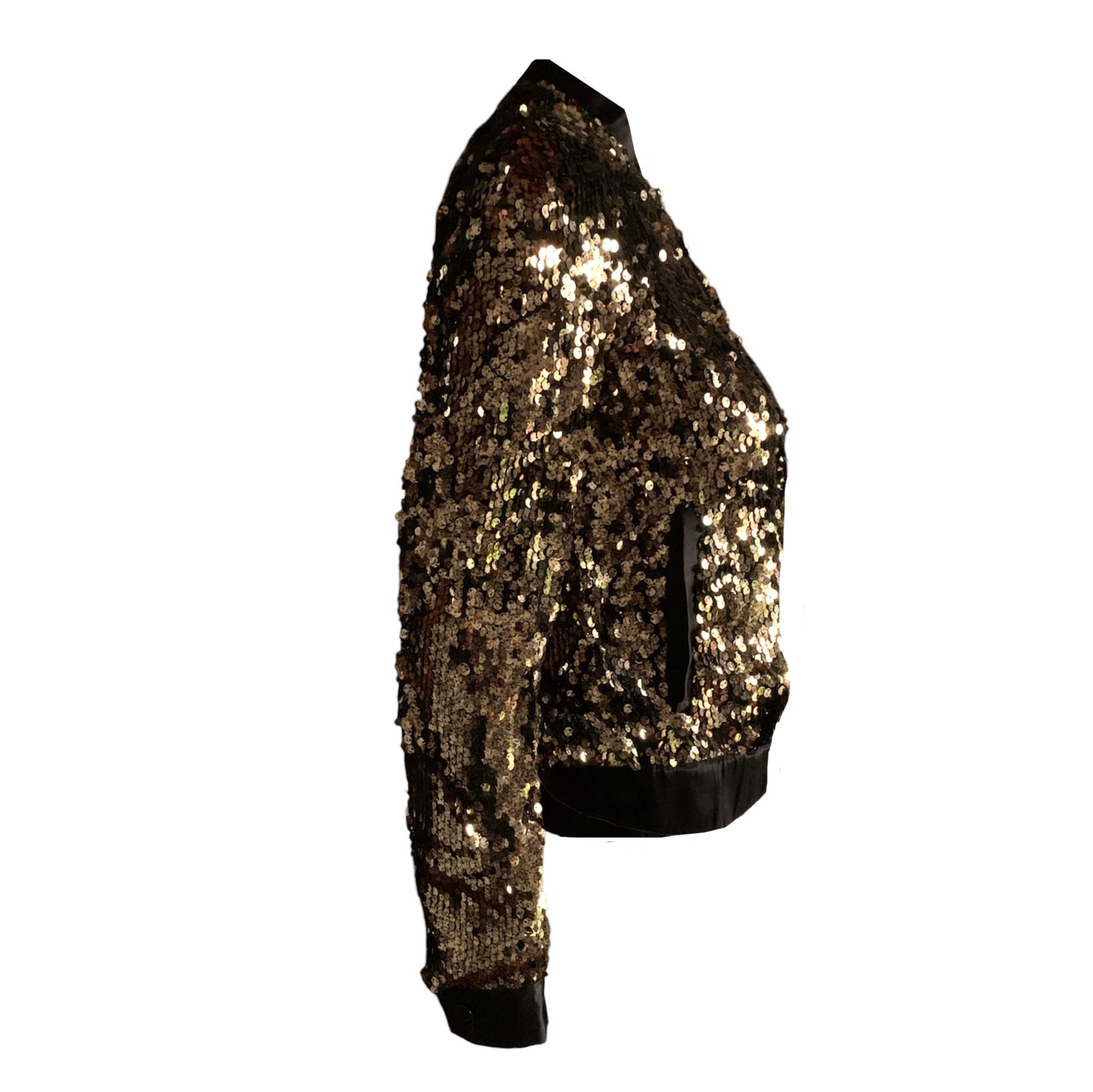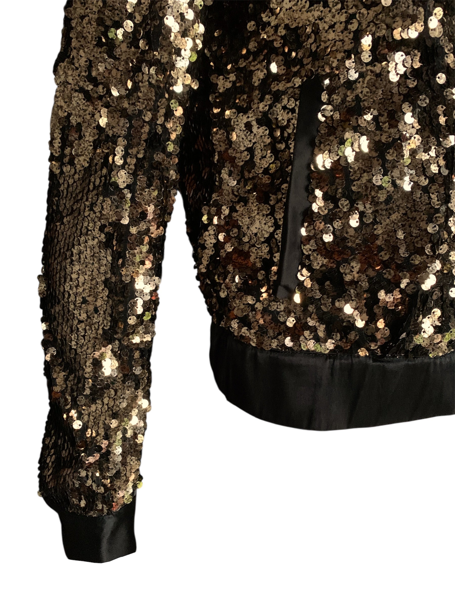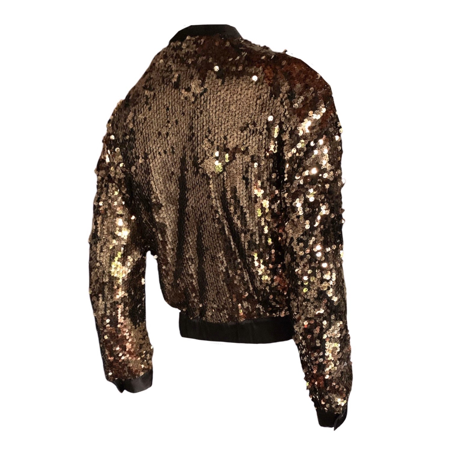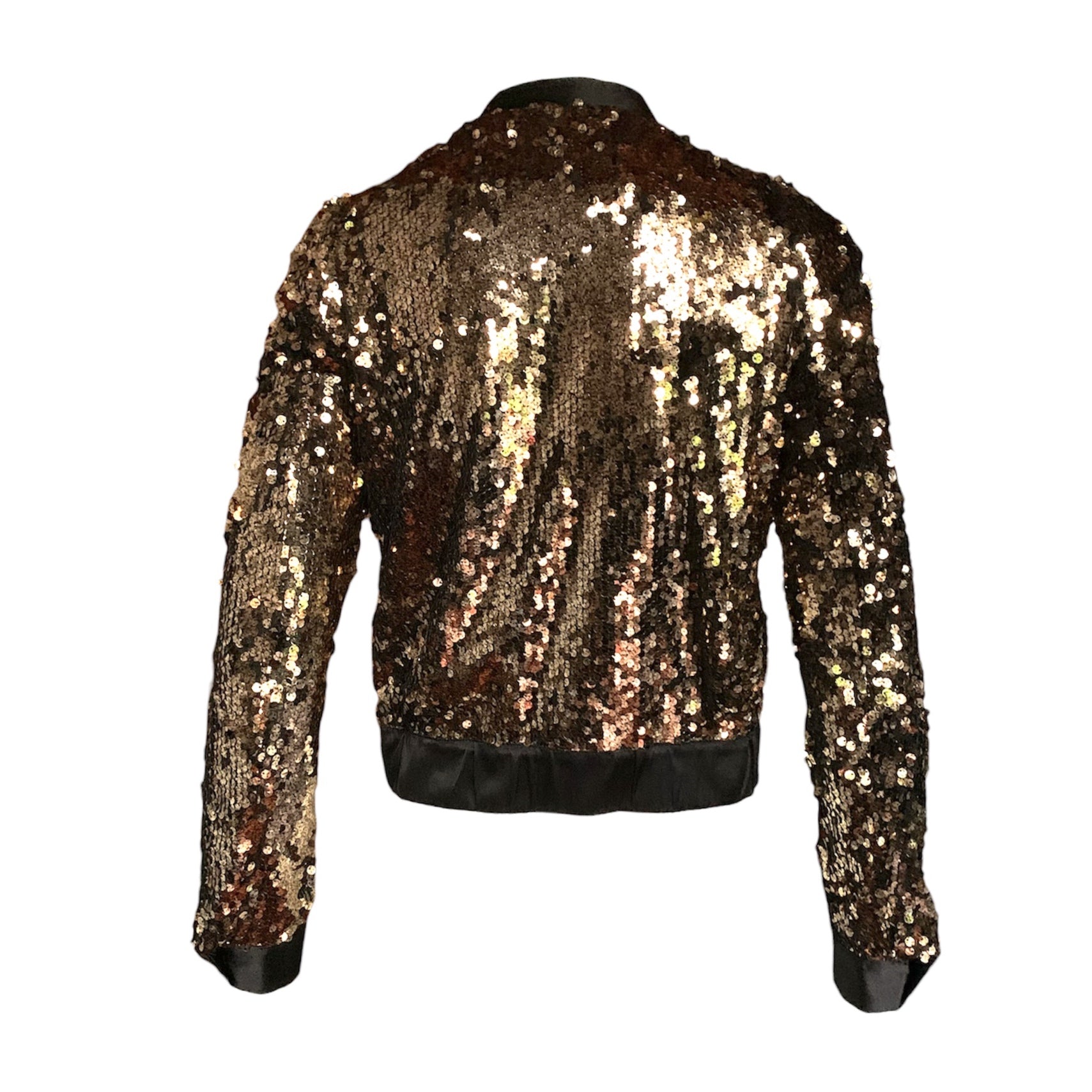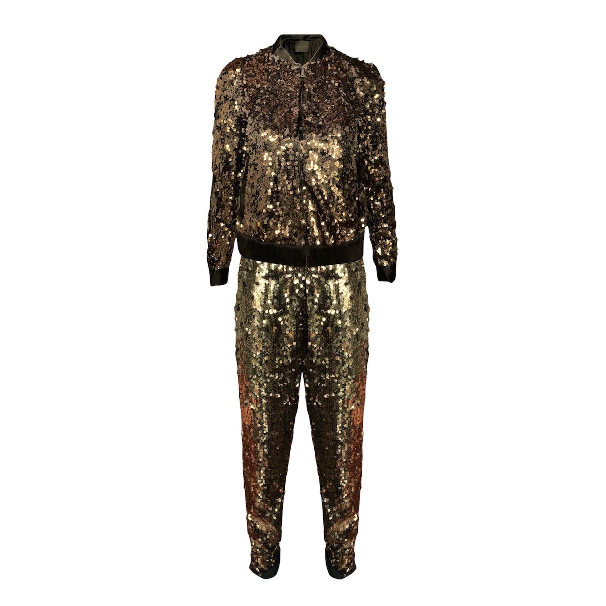 Completo bomber e pantaloni con paillettes oro/bronzo all-over.