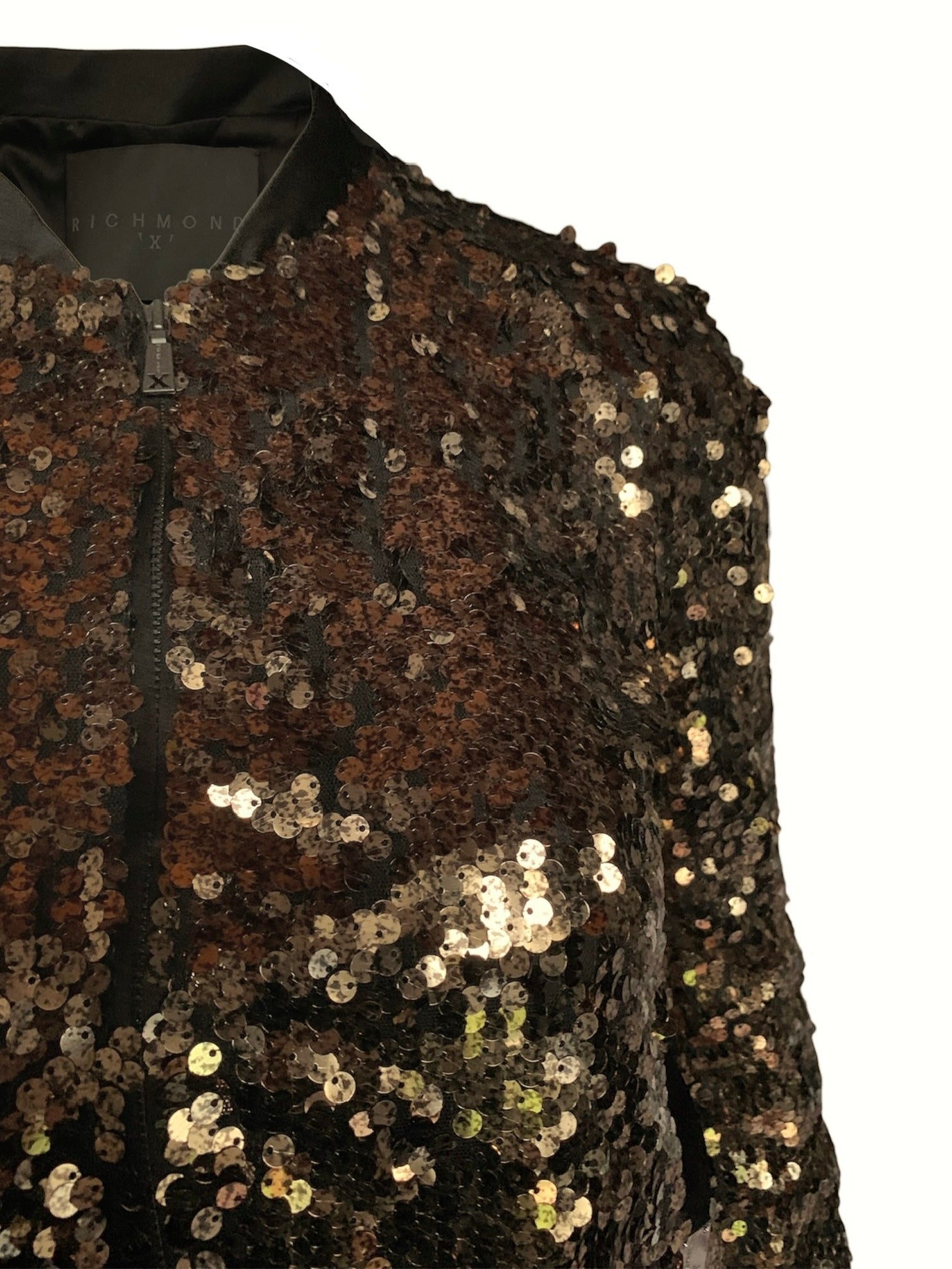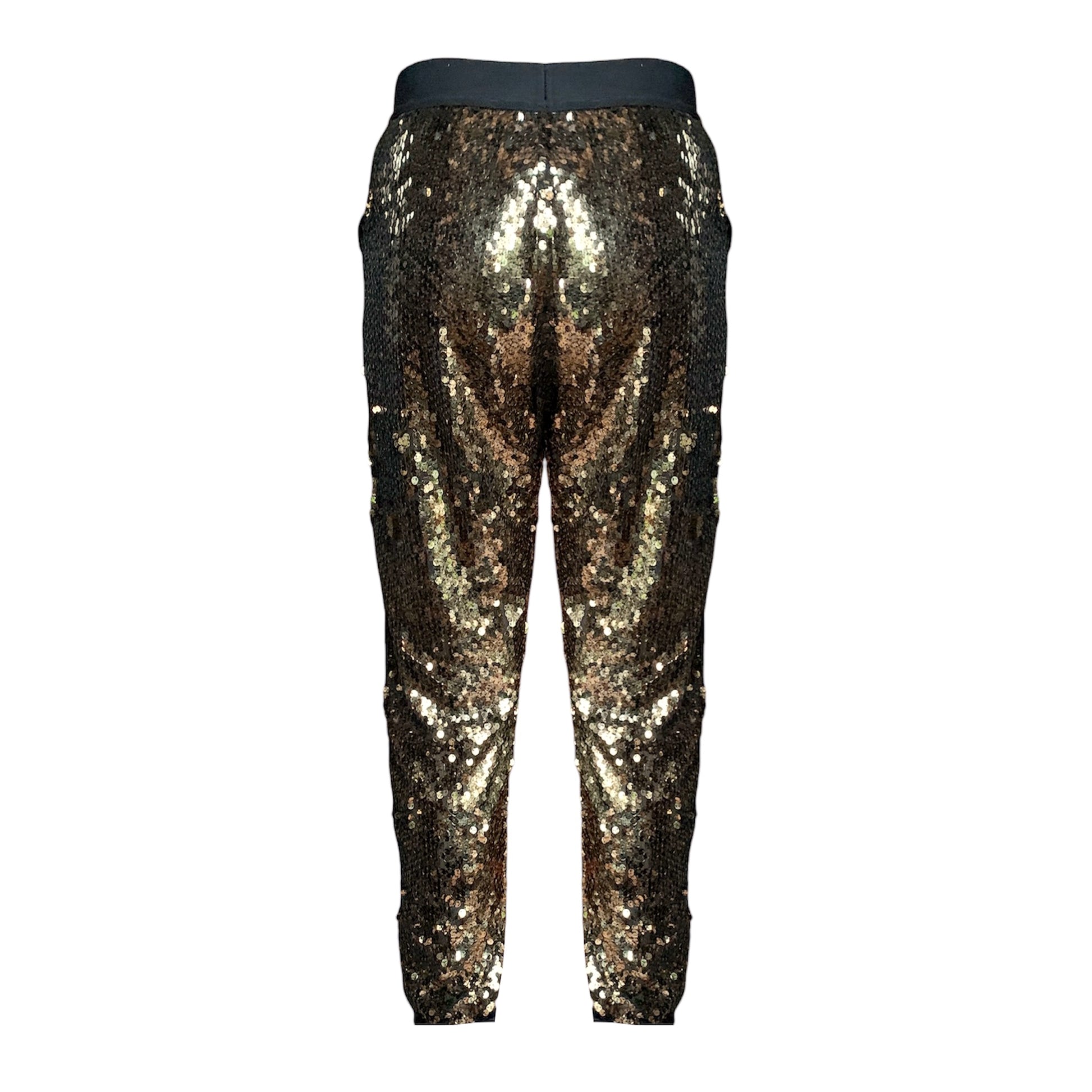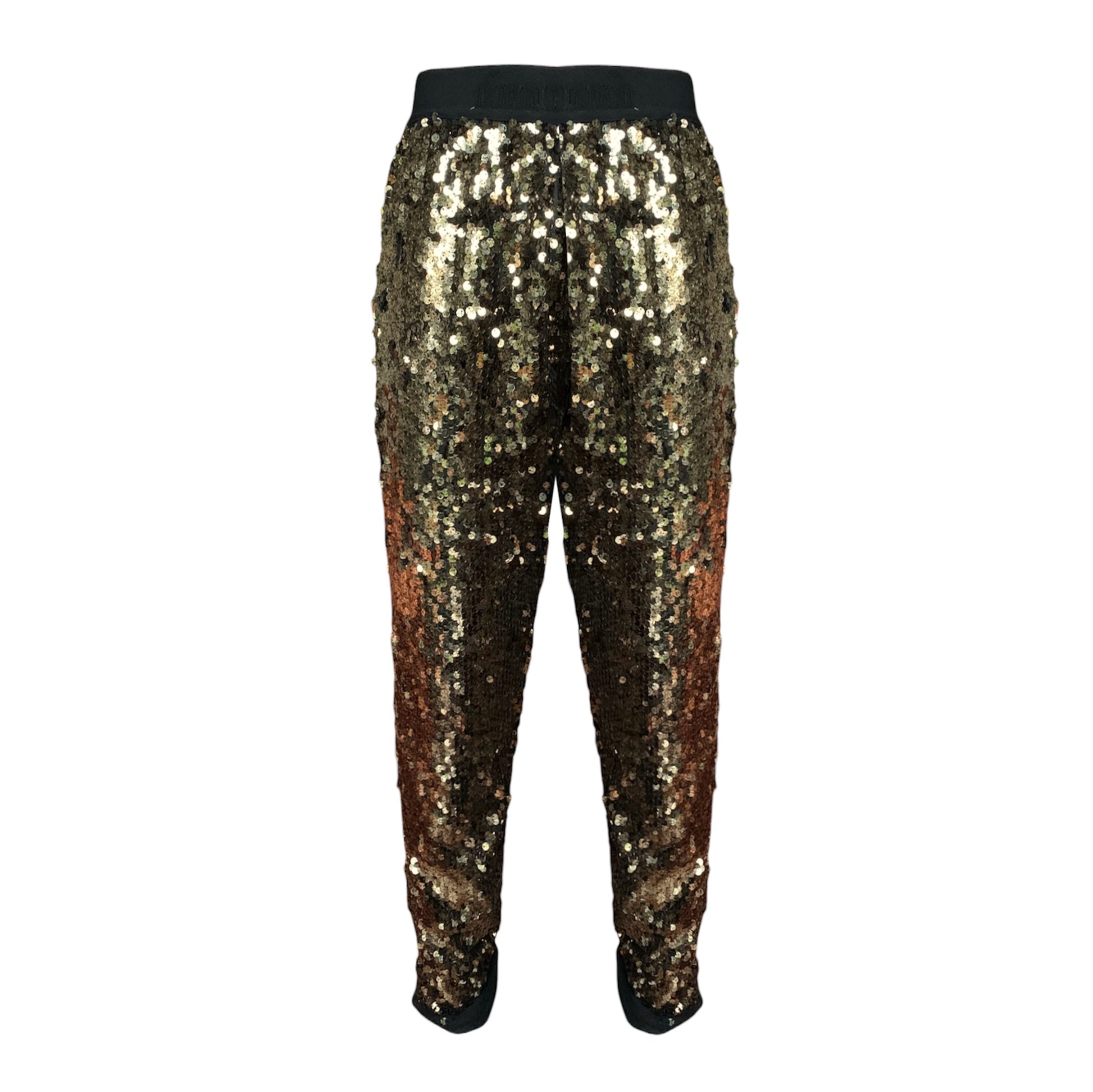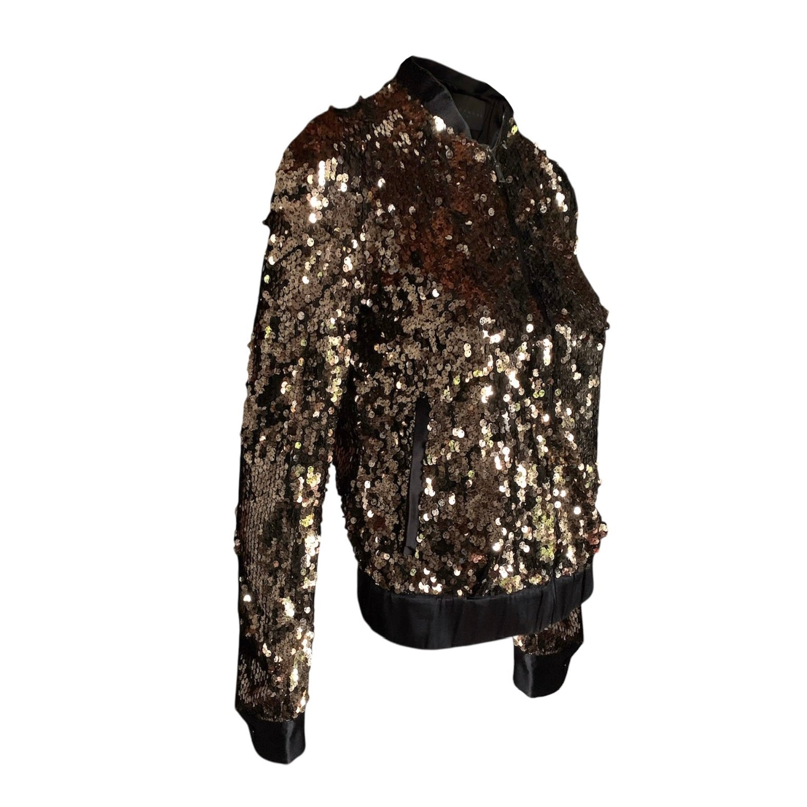 Completo bomber e pantaloni con paillettes oro/bronzo all-over.