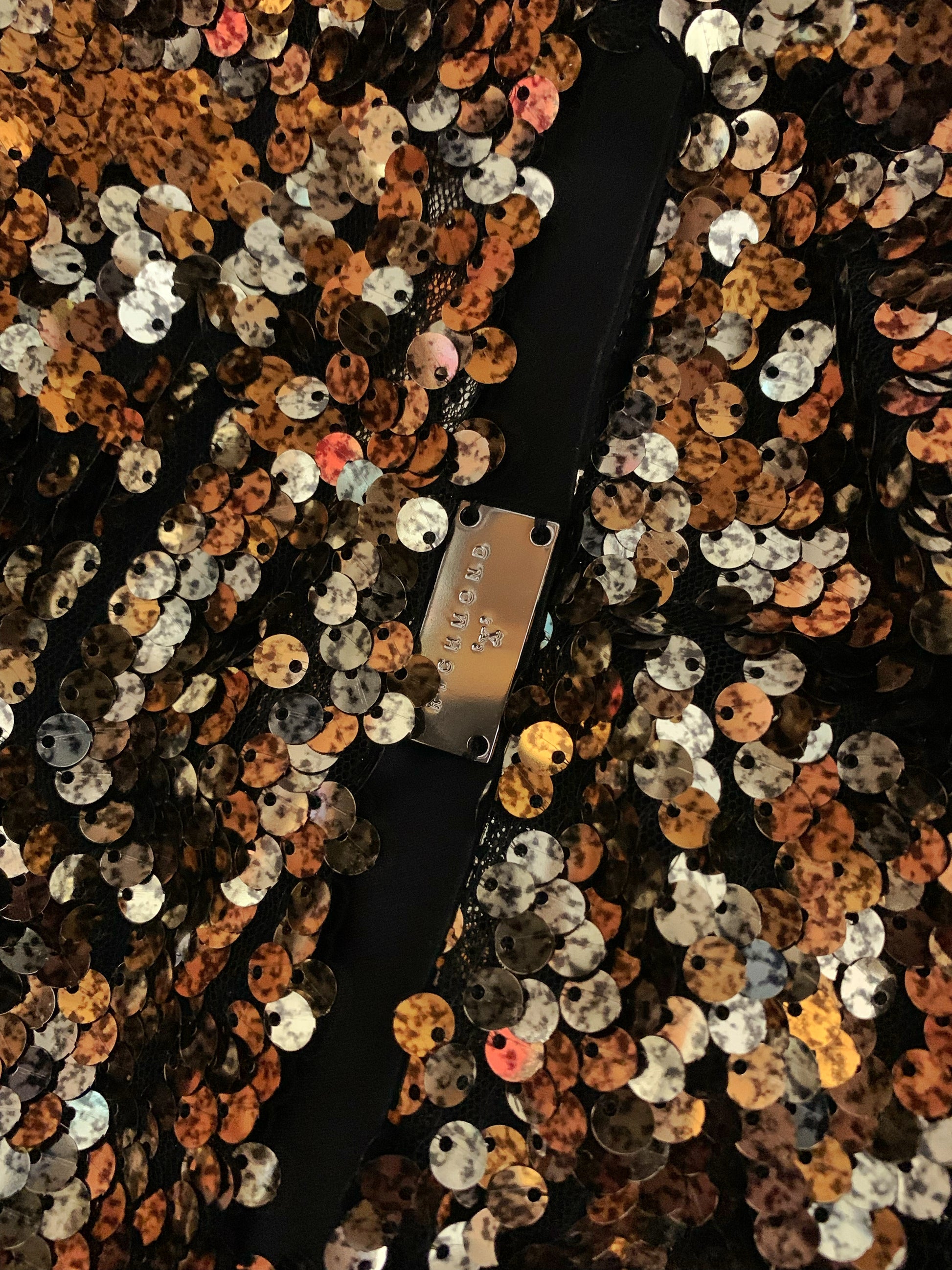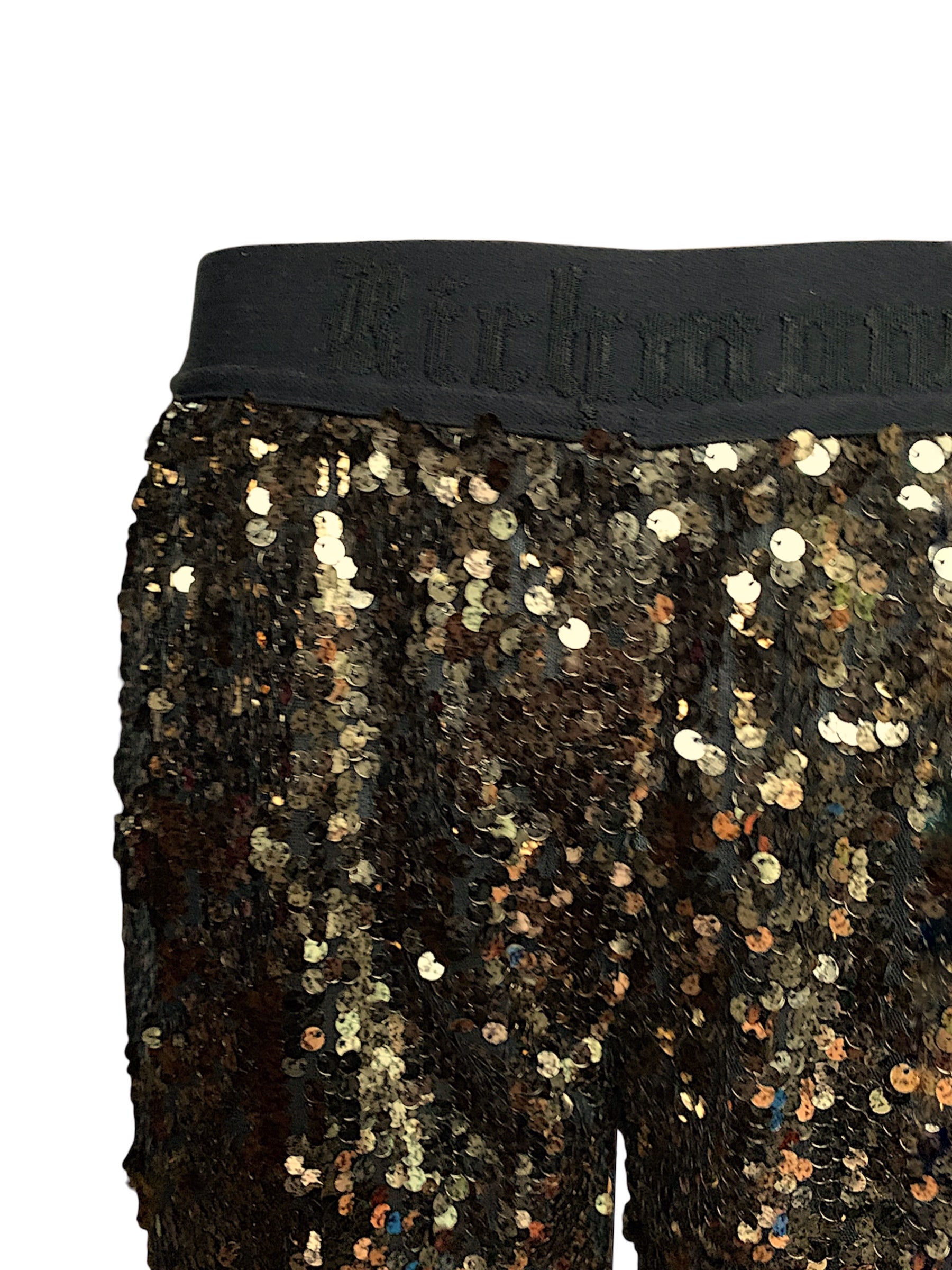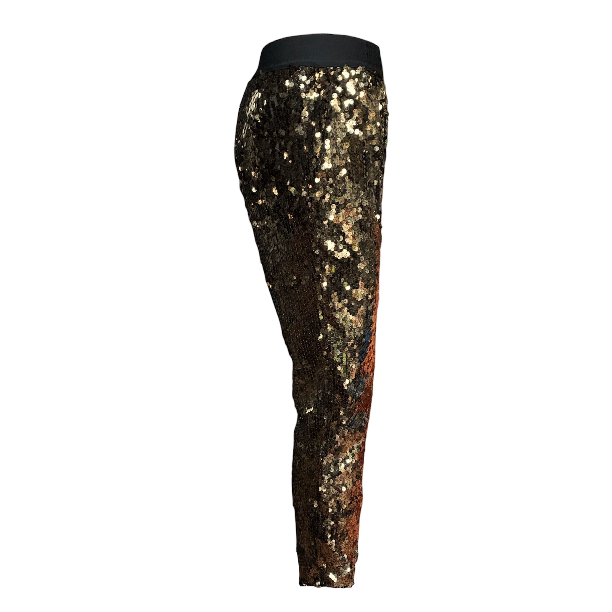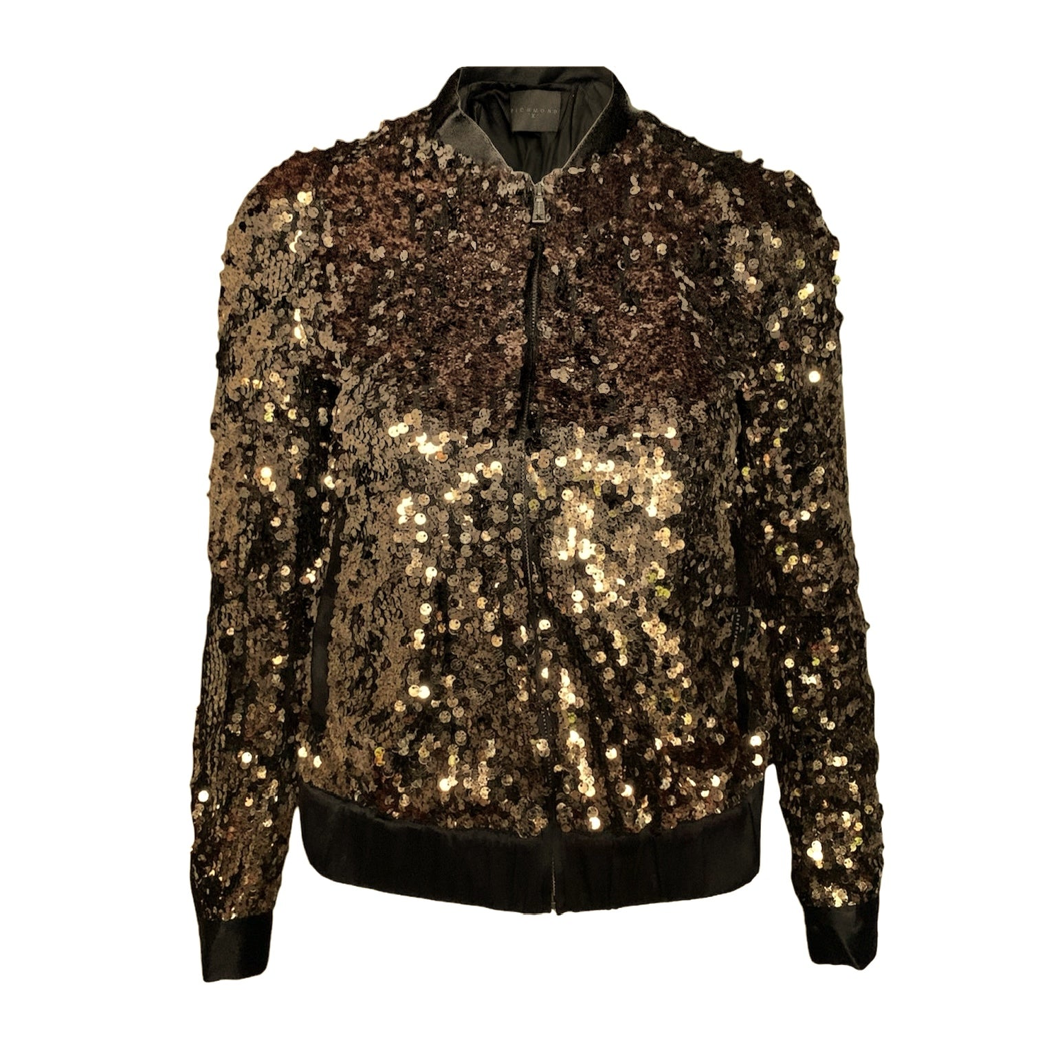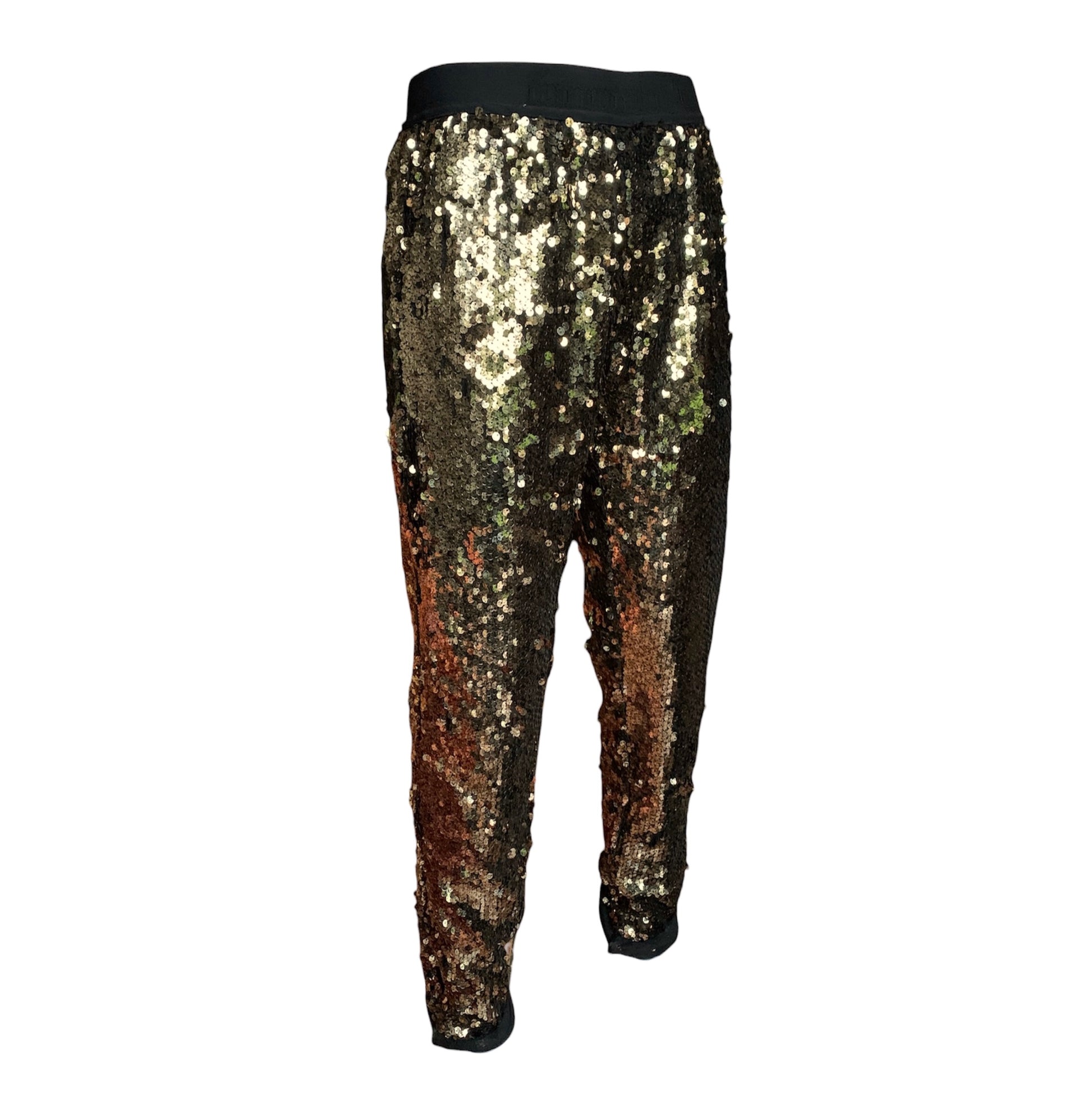 Completo bomber e pantaloni con paillettes oro/bronzo all-over.