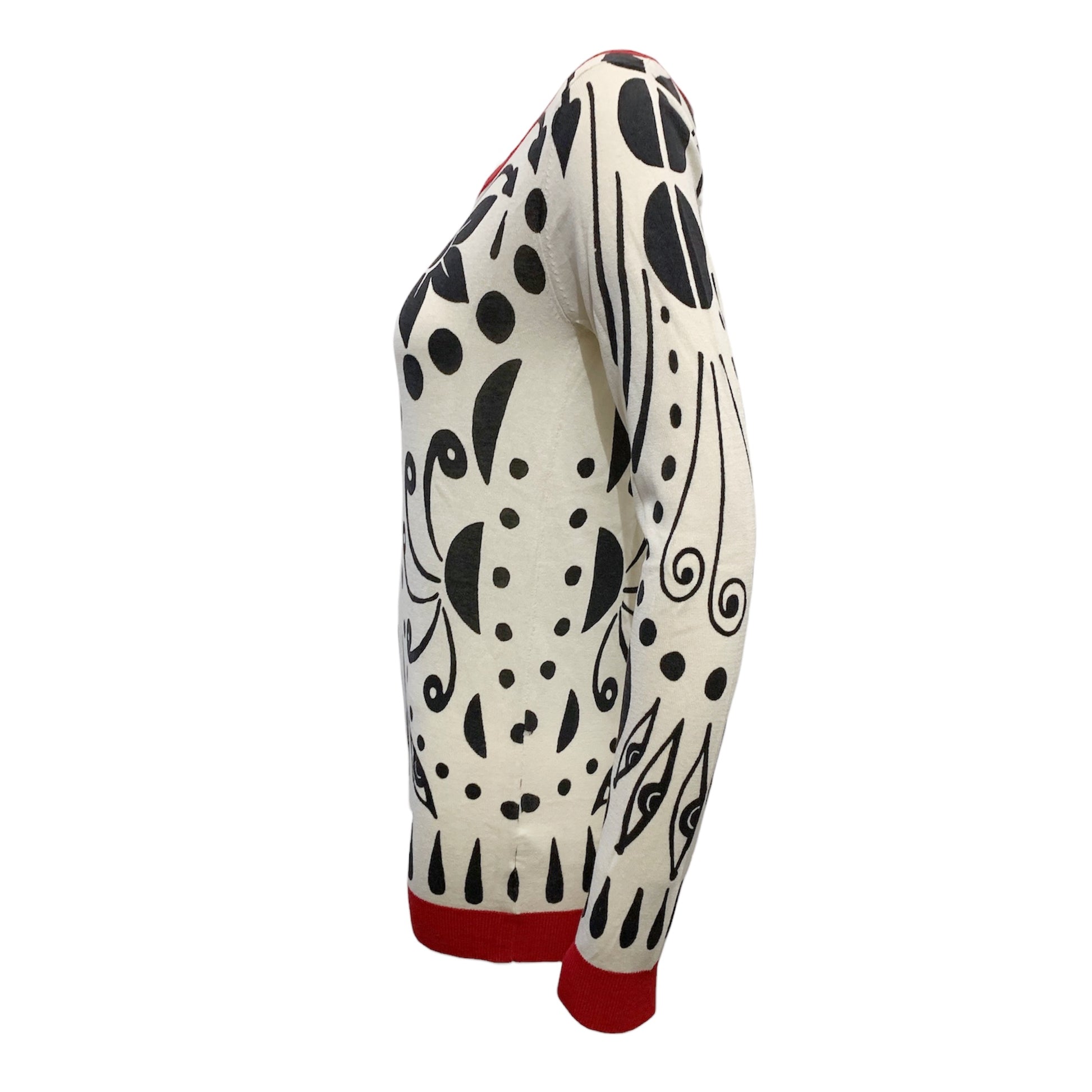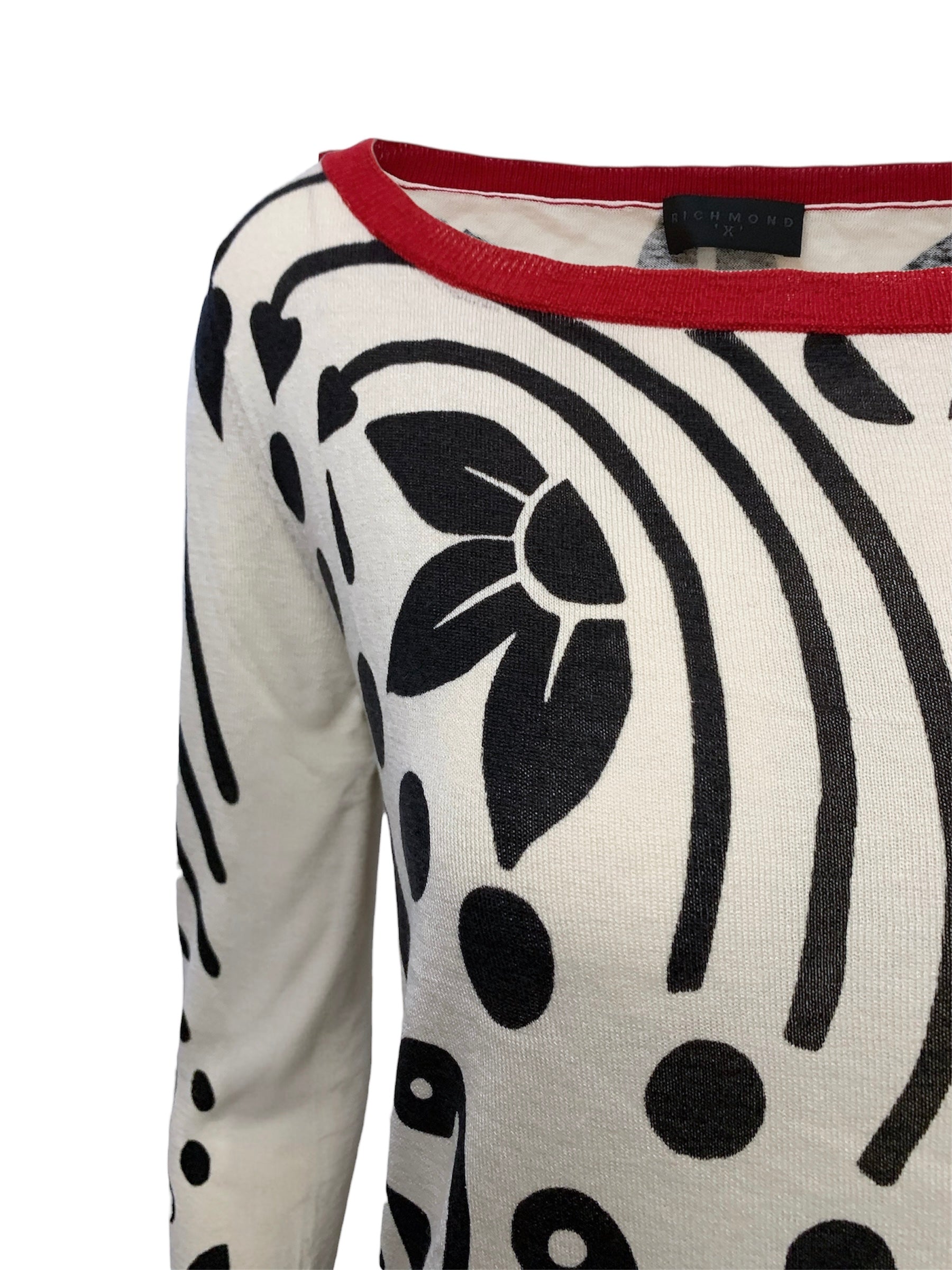 Maglioncino con ampio scollo a barca profilato in maglina a coste rossa (così come il fondo e le maniche) e decorazioni nere su sfondo bianco.