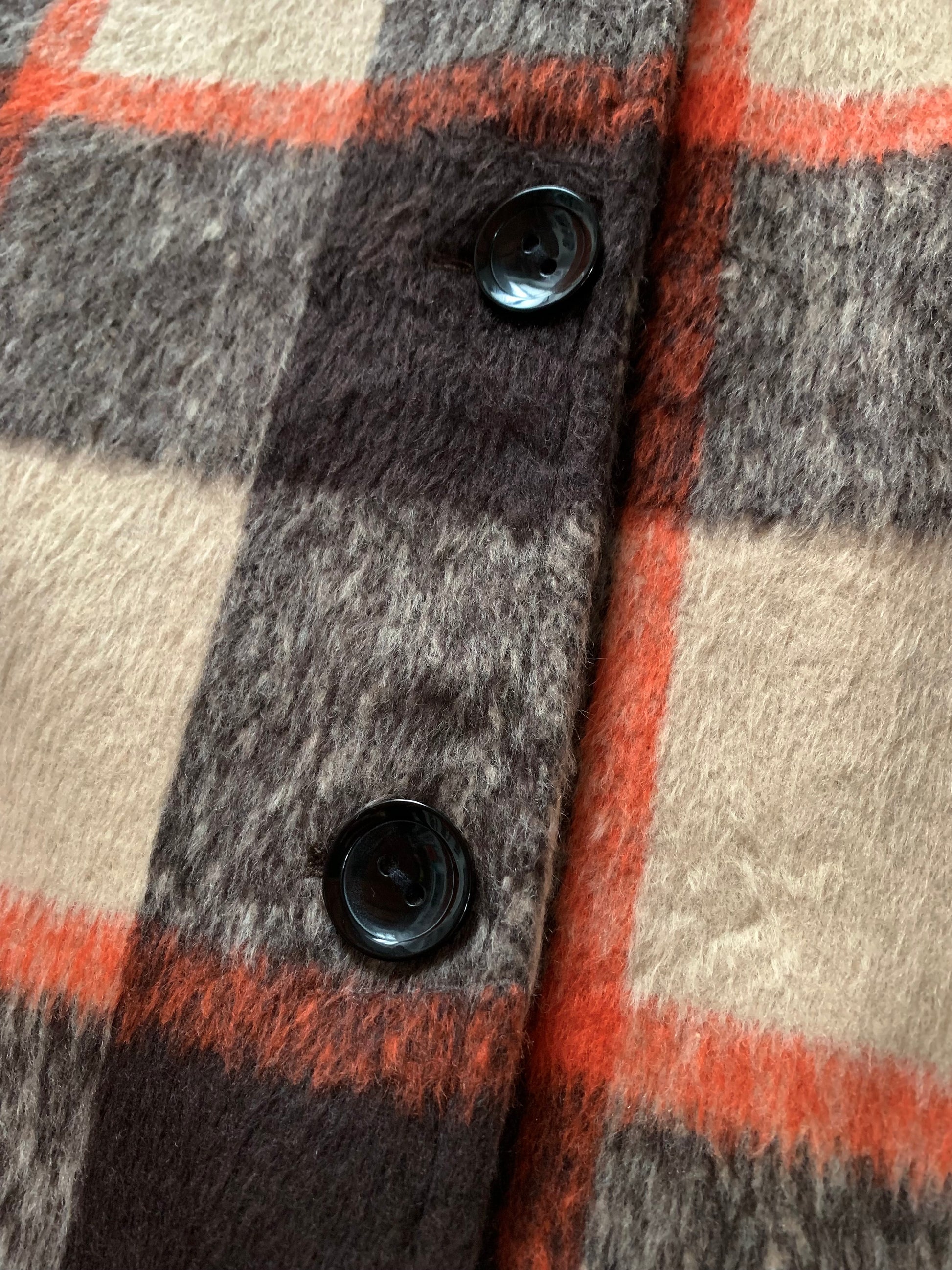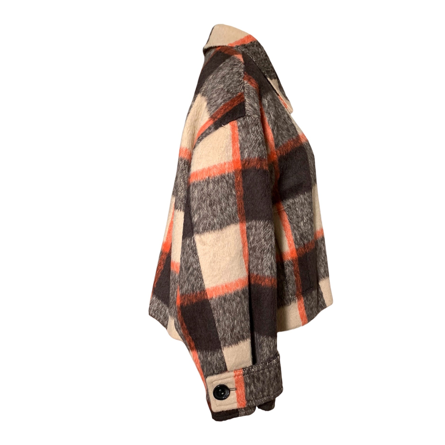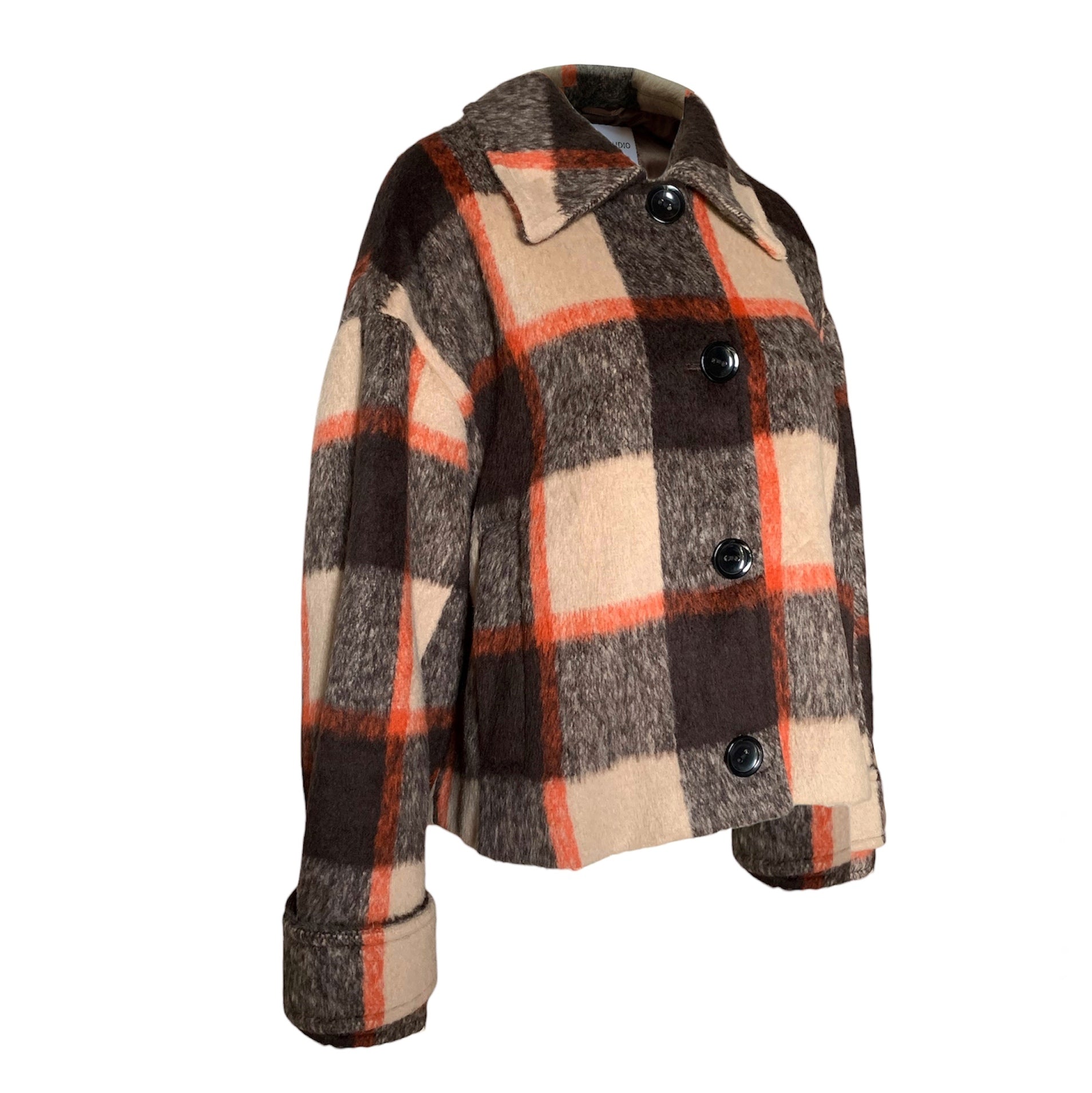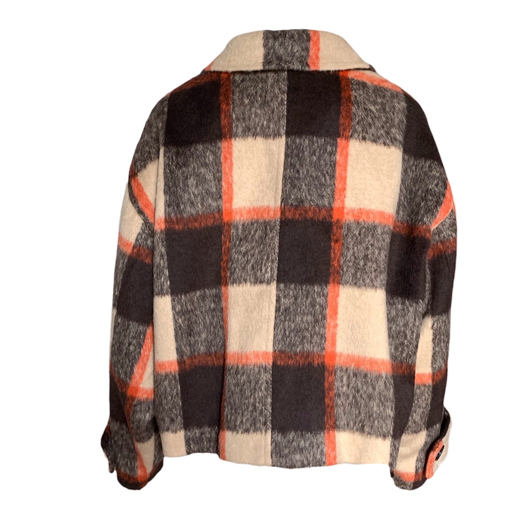 Giacca corta Alexia beige/marrone scuro/arancione con effetto spazzolato, audace motivo a quadri, colletto classico, chiusura frontale con bottoni, maniche lunghe, polsini abbottonati e orlo dritto. Foderato.