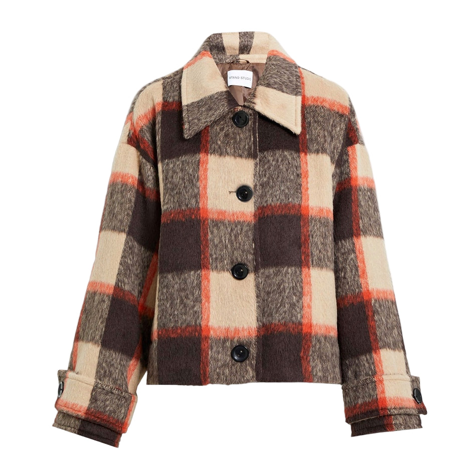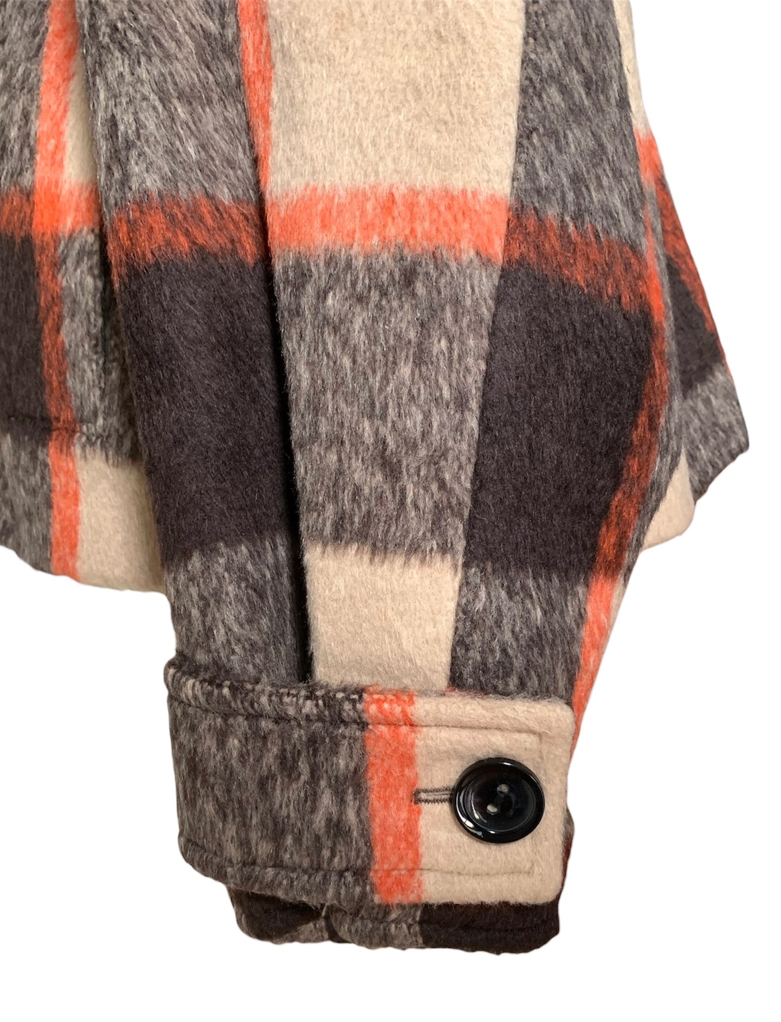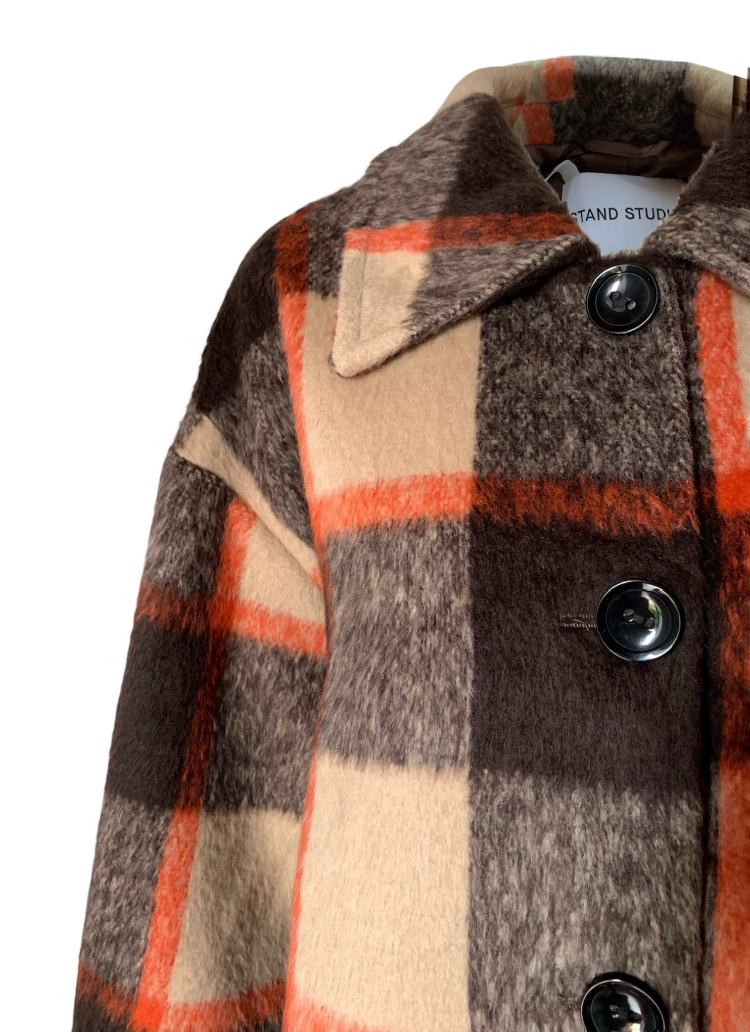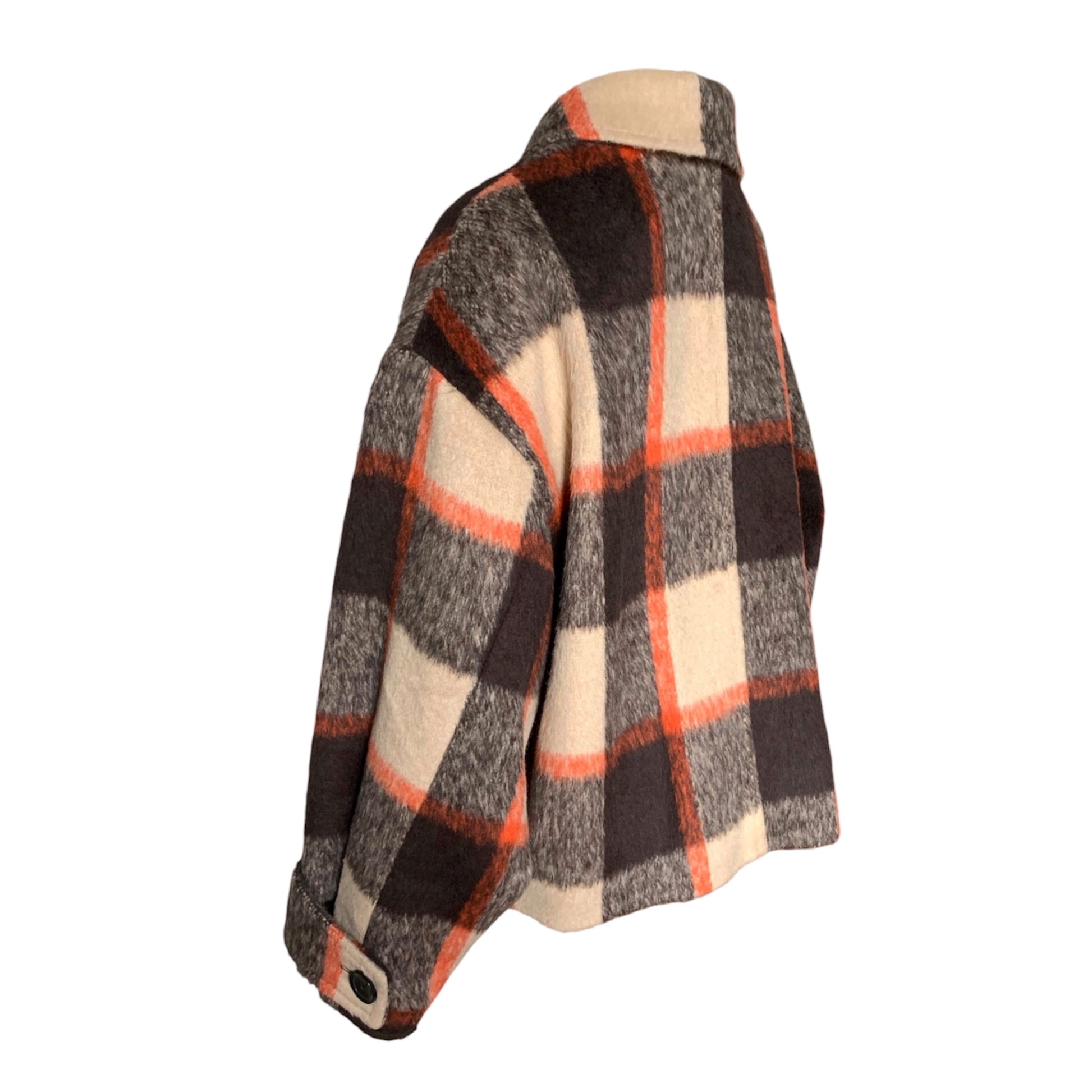 Giacca corta Alexia beige/marrone scuro/arancione con effetto spazzolato, audace motivo a quadri, colletto classico, chiusura frontale con bottoni, maniche lunghe, polsini abbottonati e orlo dritto. Foderato.
