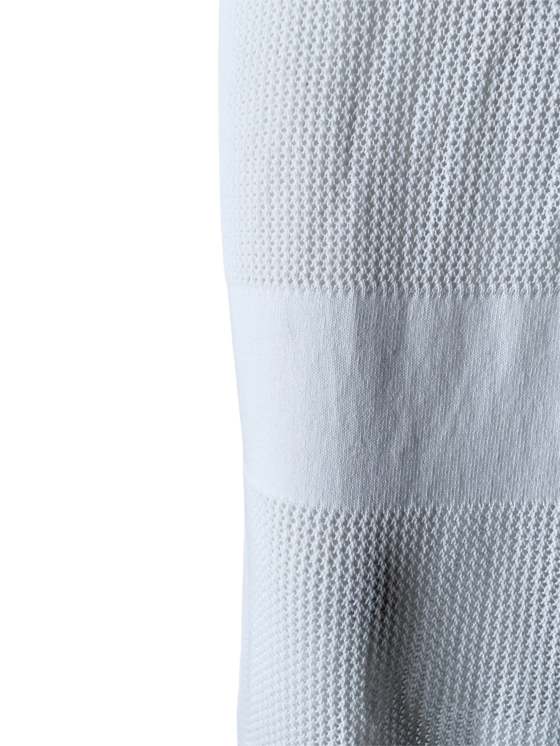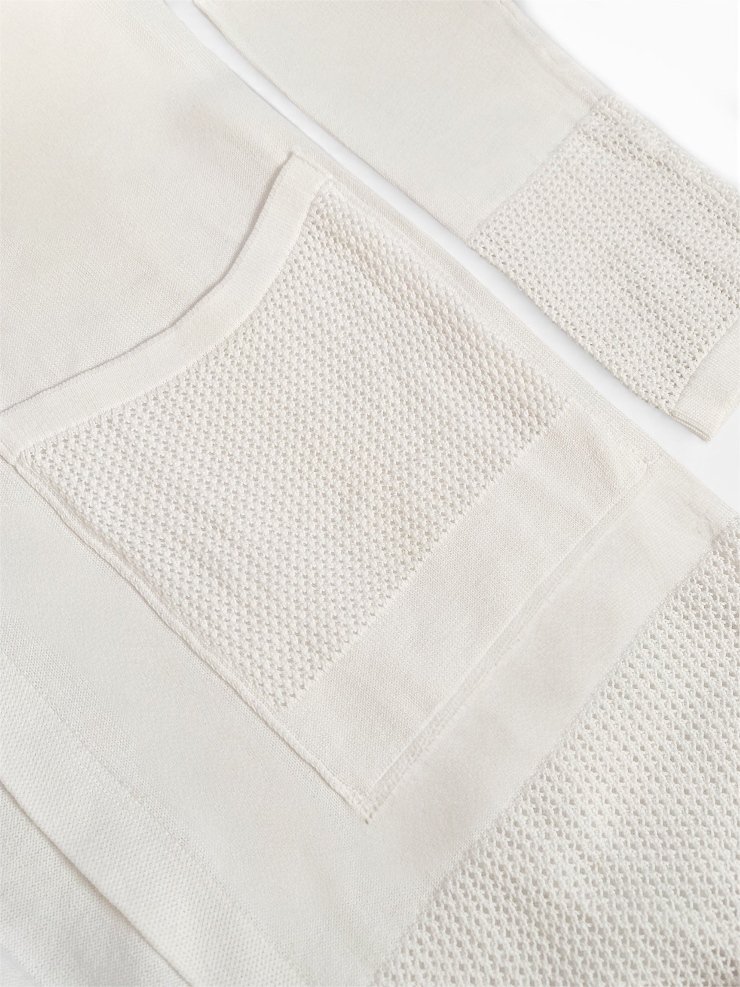 Cardigan in maglia di cotone alternato a tessuto in rete, senza allacciatura, spalle scese, maniche lunghe, collo tondo.