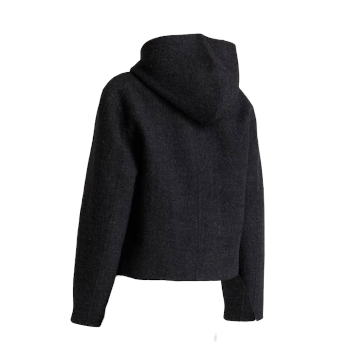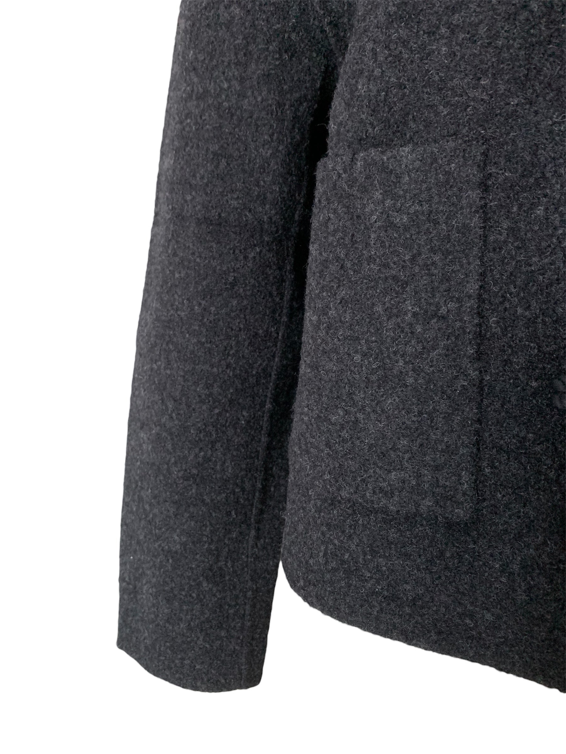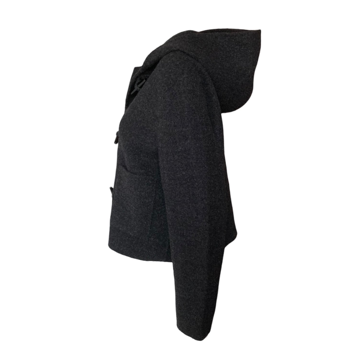 Giacca stile montgomery corto colore grigio antracite di realizzata in un morbido misto lana infeltrito. Maniche lunghe e dal taglio ampio, due tasche frontali applicate, l'orlo dritto, chiusura frontale con alamari in tinta, cappuccio.