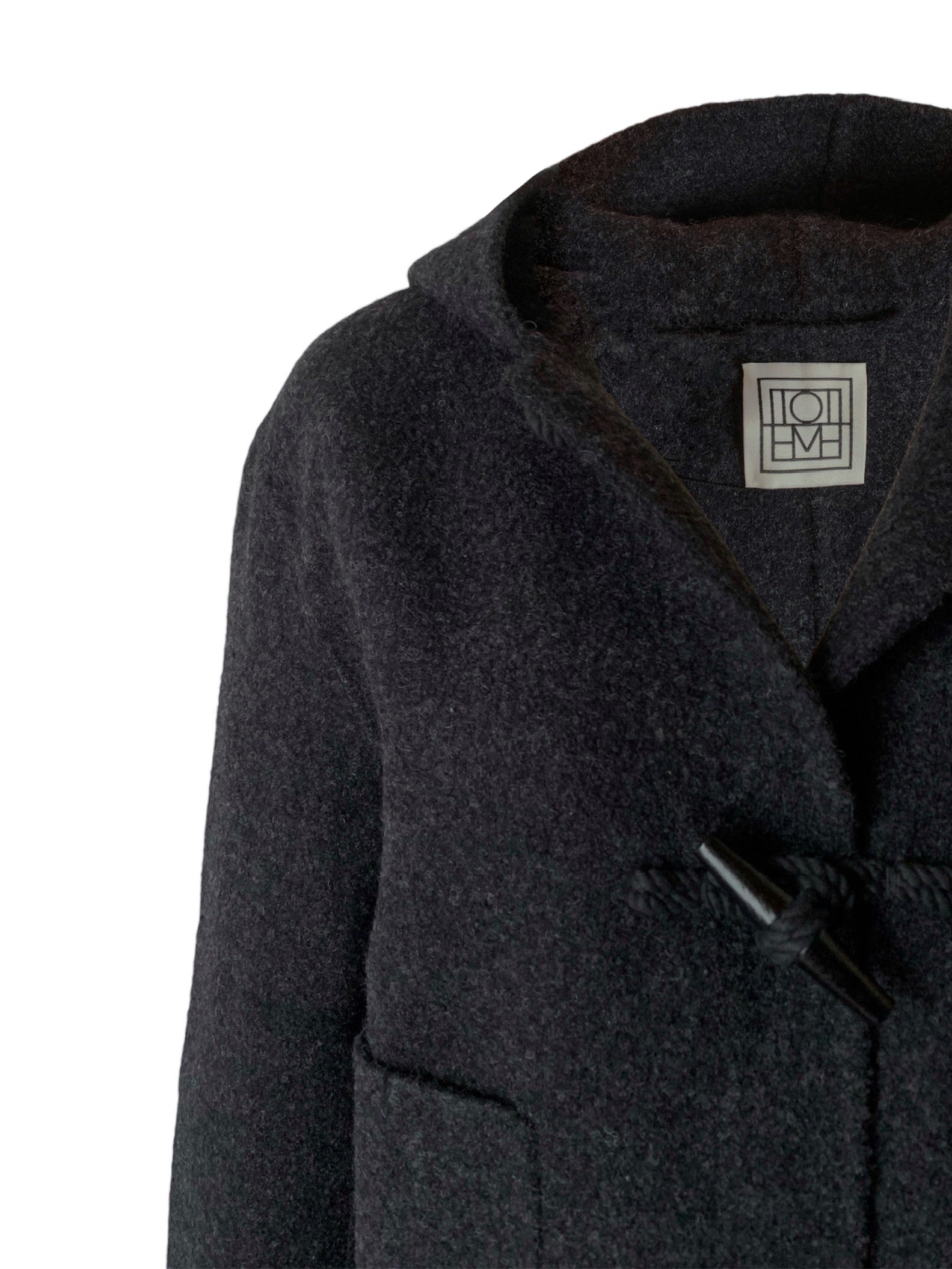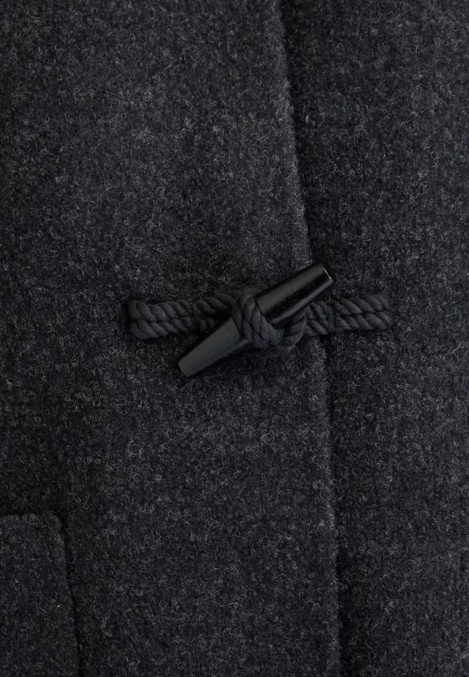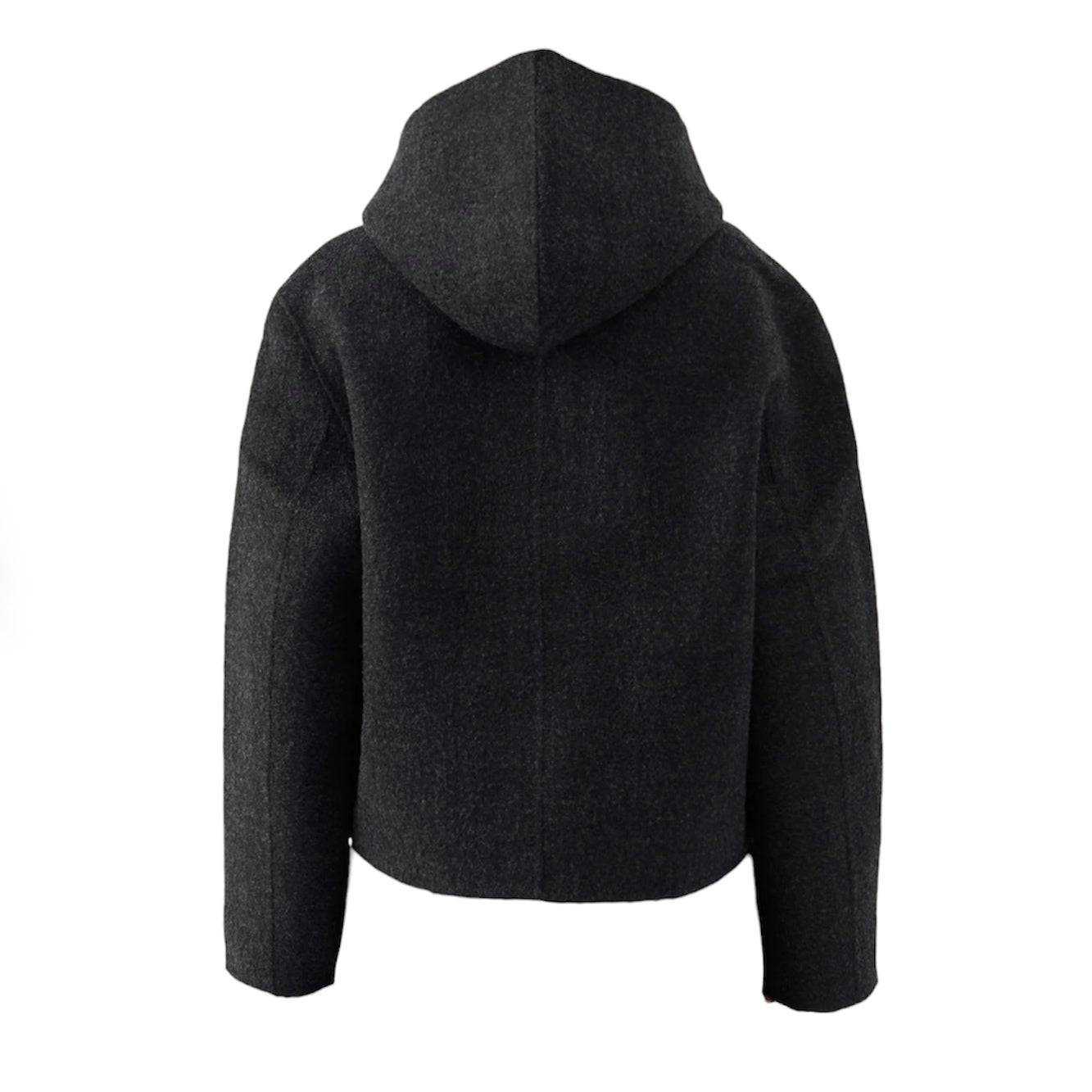 Giacca stile montgomery corto colore grigio antracite di realizzata in un morbido misto lana infeltrito. Maniche lunghe e dal taglio ampio, due tasche frontali applicate, l'orlo dritto, chiusura frontale con alamari in tinta, cappuccio.