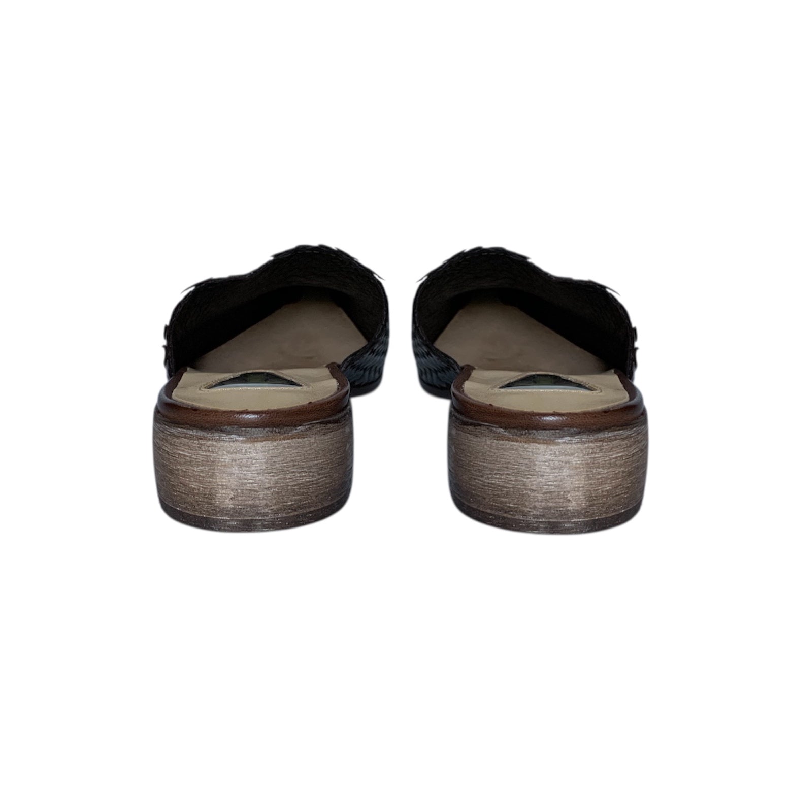 Mules in pelle intrecciata con punta rifinita in rame a contrasto. Punta inclinata. Suola in cuoio, tacco a blocco altezza 3 cm.