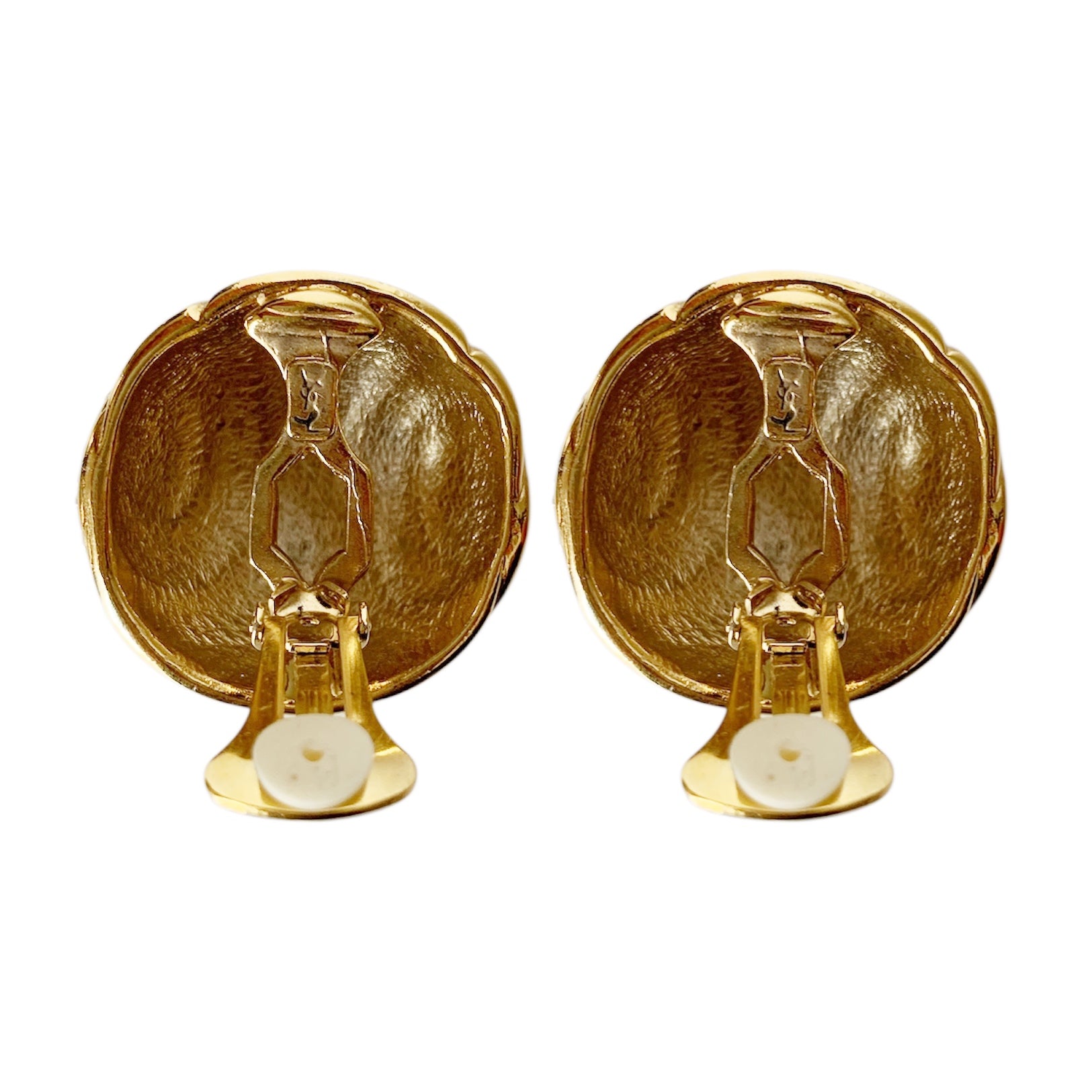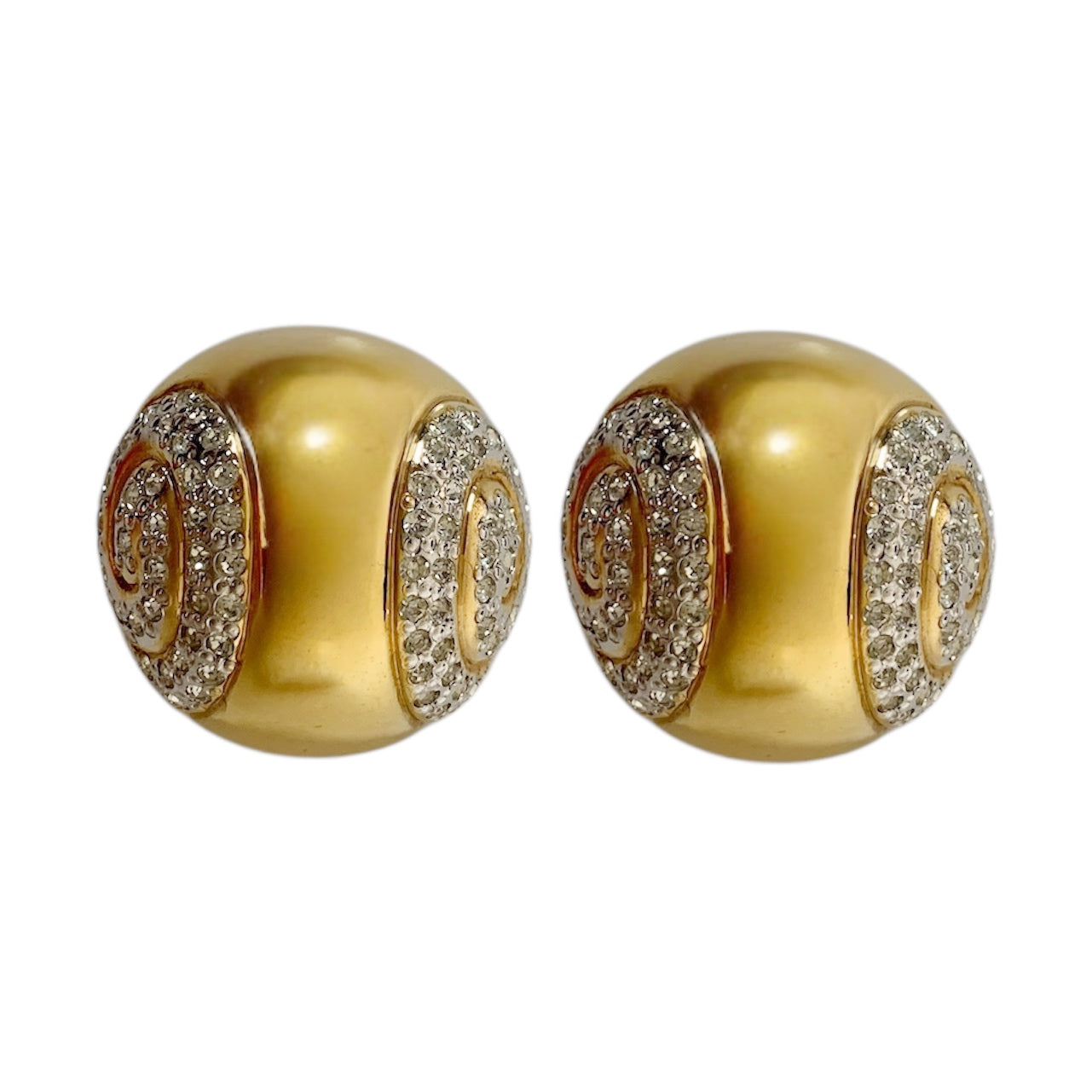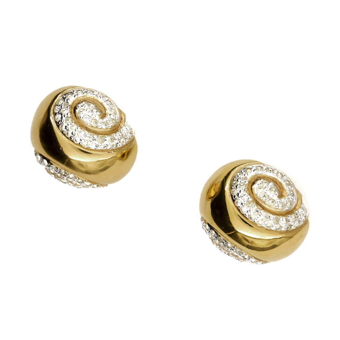 Magnifico paio di orecchini anni 80s con chiusura clip-on realizzati in metallo dorato e cristalli trasparenti. Con scatola originale.